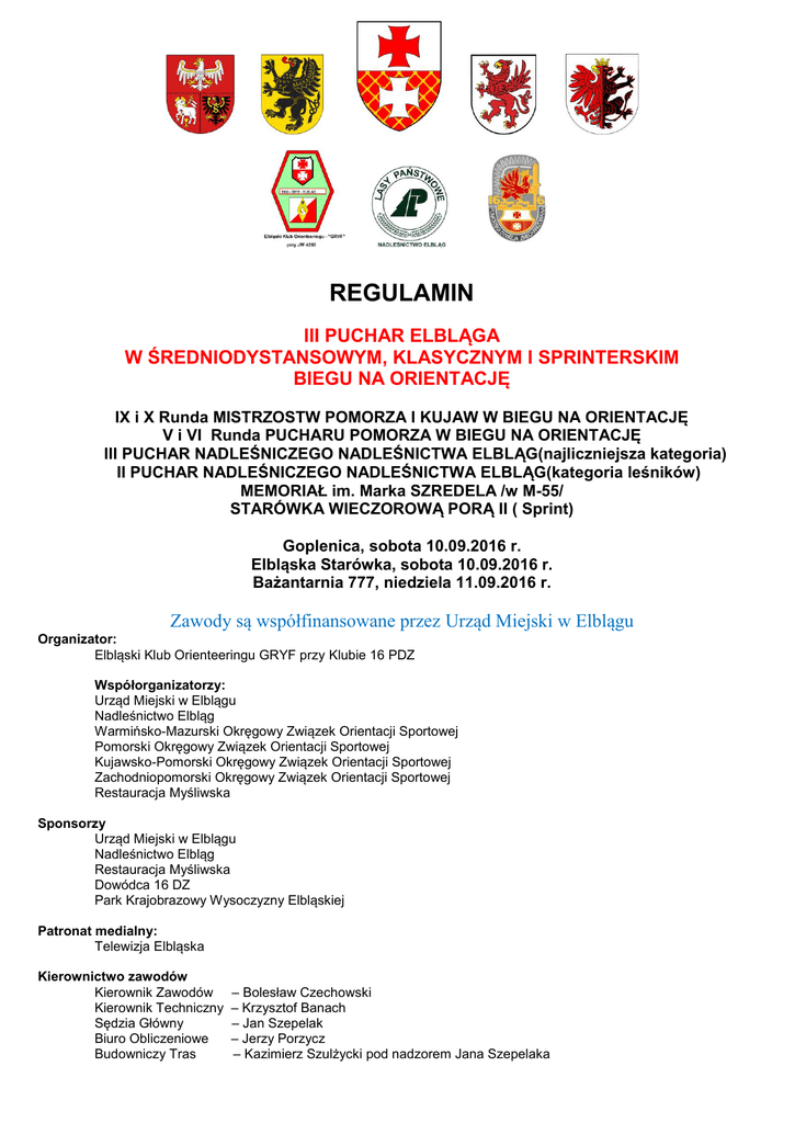 REGULAMIN III PUCHAR ELBLĄGA W ŚREDNIODYSTANSOWYM, KLASYCZNYM I SPRINTERSKIM BIEGU NA ORIENTACJĘ IX i X Runda MISTRZOSTW POMORZA I KUJAW W BIEGU NA ORIENTACJĘ V i VI Runda PUCHARU POMORZA W BIEGU NA ORIENTACJĘ III PUCHAR NADLEŚNICZEGO NADLEŚNICTWA ELBLĄG(najliczniejsza kategoria) II PUCHAR NADLEŚNICZEGO NADLEŚNICTWA ELBLĄG(kategoria leśników) MEMORIAŁ im. Marka SZREDELA /w M-55/ STARÓWKA WIECZOROWĄ PORĄ II ( Sprint) Goplenica, sobota 10.09.2016 r. Elbląska Starówka, sobota 10.09.2016 r. Bażantarnia 777, niedziela 11.09.2016 r. Zawody są współfinansowane przez Urząd Miejski w Elblągu Organizator: Elbląski Klub Orienteeringu GRYF przy Klubie 16 PDZ Współorganizatorzy: Urząd Miejski w Elblągu Nadleśnictwo Elbląg Warmińsko-Mazurski Okręgowy Związek Orientacji Sportowej Pomorski Okręgowy Związek Orientacji Sportowej Kujawsko-Pomorski Okręgowy Związek Orientacji Sportowej Zachodniopomorski Okręgowy Związek Orientacji Sportowej Restauracja Myśliwska Sponsorzy Urząd Miejski w Elblągu Nadleśnictwo Elbląg Restauracja Myśliwska Dowódca 16 DZ Park Krajobrazowy Wysoczyzny Elbląskiej Patronat medialny: Telewizja Elbląska Kierownictwo zawodów Kierownik Zawodów Kierownik Techniczny Sędzia Główny Biuro Obliczeniowe Budowniczy Tras – Bolesław Czechowski – Krzysztof Banach – Jan Szepelak – Jerzy Porzycz – Kazimierz Szulżycki pod nadzorem Jana Szepelaka Termin: 10 wrzesień 2016 r. /sobota / - bieg średniodystansowy Start: godz. “00” - 10:30 Zakończenie ok. godz. 15:00 w Centrum Zawodów 10 wrzesień 2016 r. /sobota / - sprint Start: godz. “00” - 18:00 Zakończenie ok. godz. 19:00 w Centrum Zawodów 11 wrzesień 2016 r. / niedziela / - bieg klasyczny Start: godz. “00” - 10:00 Zakończenie ok. godz. 13:00 w Centrum Zawodów Forma zawodów: Rundy pucharowe dzienne, indywidualne Limit czasu 180 minut Zawody sprinterskie Stare Miasto popołudniowe/wieczorne, indywidualne Limit czasu 60 minut Centrum zawodów – informacje o centrum zawodów ich lokalizacja i współrzędne podane będą w komunikacie technicznym po 15.08.2016. Sekretariat: 10.09. (sobota) - Centrum zawodów, czynny od godz. 08.15 – 10.10 10.09. (sobota) - Centrum zawodów, czynny od godz. 16. 00 –17.30 11.09. (niedziela) - Centrum zawodów, czynny od godz. 08.15 – 09.40 Kategorie III Pucharu Elbląga (dotyczą wszystkich klasyfikacji rozgrywanych w ramach pucharu) : K (kobiety) 10N M (mężczyźni) 10 12 14 16 18 20 21 35/40 45/50 55/60+ K/M10N - trasa wstążeczkowana 10N 10 12 14 16 18 20 21 35/40 45/50 rocznik 2006 i młodsi rocznik 2006 i młodsi rocznik 2004 - 2005 rocznik 2002 - 2003 rocznik 2000 – 2001 rocznik 1998 - 1999 rocznik 1996 - 1997 rocznik 1982 - 1995 rocznik 1972 – 1981 rocznik 1962 - 1971 rocznik 1952 i starsi 55/60 rocznik 1952 - 1961 65/70 rocznik 1942 - 1961 75+ rocznik 1941 i starsi Trasy rekreacyjne K/M10N (rocznik 2005 i młodsi) - trasa wstążeczkowana 10R (trasa rodzinna) - trasa wstążeczkowana – bez ograniczeń wiekowych TP – kategoria początkujących, bez klasyfikacji – bez ograniczeń wiekowych Zawodnicy w kat. popularyzacyjnych startują w dowolnej minucie pomiędzy 00 i 60 Kategorie II Pucharu Nadleśniczego Nadleśnictwa Elbląg (dotyczy pracowników Lasów Państwowych) : K (LP) - kobiety , otwarta bez podziału na kategorie wiekowe M (LP) - mężczyźni , otwarta bez podziału na kategorie wiekowe Uwaga: Zawodnicy zgłaszający się do tej kategorii nie będą klasyfikowani we wszystkich pozostałych klasyfikacjach. O końcowej klasyfikacji decyduje suma czasu uzyskana w 2 startach. Opłata startowa - 20 zł Opłata dotyczy startu za każdy dzień oddzielnie . Zgłoszenia(dotyczy leśników) ; do 05.09.2016 na załączonym formularzu zgłoszenia na adres e-mail [email protected] lub kazek [email protected] Proszę o dotrzymanie terminu zgłoszenia ze względu na konieczność druku map z trasami. Mapy: „Bażantarnia 777” aktualność czerwiec 2016 skala 1:10000 e- 5 m, z późniejszymi poprawkami autorzy: Jarosław Bartczak, Jan Szepelak, Kazimierz Szulżycki Mapa wykonano z wykorzystaniem systemu „ LIDAR” Bieg rozegrany będzie w terenie zróżnicowanym, o sporych przewyższeniach i częściowo o utrudnionej, przebieżności. „Goplenica” aktualność sierpień 2016 skala 1:10000 e- 2,5 m. autor: Kazimierz Szulżycki Mapa wykonano z wykorzystaniem systemu „ LIDAR” Bieg rozegrany będzie w terenie zróżnicowanym, o sporych przewyższeniach i częściowo o utrudnionej, przebieżności. „Elbląska Starówka” aktualność marzec 2016 skala 1:4000 e- 1 m autor: Kazimierz Szulżycki Mapa wykonano z wykorzystaniem mapy topograficznej i ortofotomapy Teren miasta. Zgłoszenia: Zgłoszenia zawierające: imię i nazwisko, datę urodzenia, kategorię wiekową, nazwę klubu lub szkoły, numer licencji PZOS ( w przypadku posiadania) i nr chipa (w przypadku posiadania) należy przesłać w nieprzekraczalnym terminie na załączonym na stronie formularzu zgłoszenia z określeniem w ilu rundach startuje dany zawodnik oraz czy startuje w sprincie na Starym Mieście i wybrana trasa do dnia 05.09.2016r. (poniedziałek) na adres [email protected] lub kazek [email protected] Prosimy o dotrzymanie terminu zgłoszeń, ponieważ mapy będą drukowane wraz z trasami Dodatkowe informacje: Kierownik zawodów – Bolesław Czechowski, Tel.505246602 lub 603778389 Sędziowanie: Na zawodach stosowany będzie elektroniczny system pomiaru czasu i potwierdzania punktów kontrolnych SPORT IDENT /SI/. Dla uczestników nieposiadających własnego chipa, istnieje możliwość jego wypożyczenia w sekretariacie zawodów, za opłatą 3 zł za sztukę (zagubienie chipa 120 zł). Wpisowe: Opłata za start w każdym biegu jak niżej: Kategorie K10N, M10N, K10, M10, 10R, TP Kategorie K12, M12, K14, M14, Kategorie K16, M16, K18, M18 Kategorie K20, M20 i starsze - 5 zł - 10 zł - 15 zł - 20 zł Wpisowe płatne w centrum zawodów prz