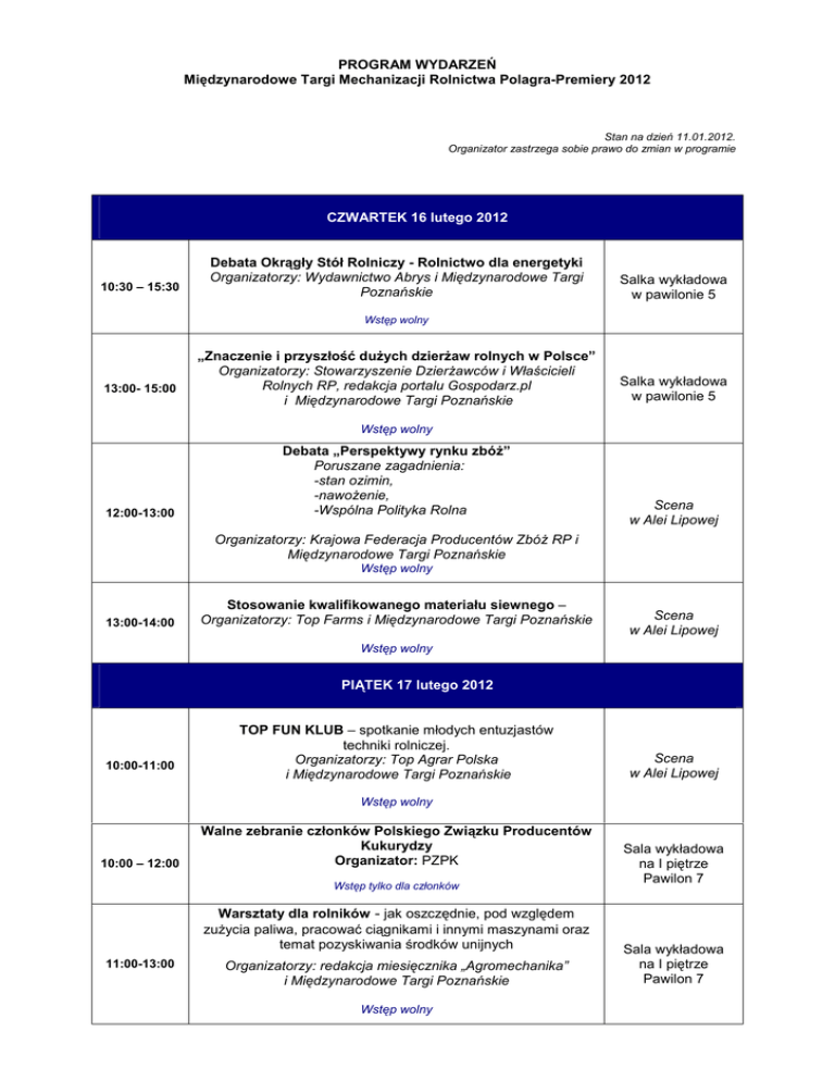 PROGRAM WYDARZEŃ Międzynarodowe Targi Mechanizacji Rolnictwa Polagra-Premiery 2012 Stan na dzień 11.01.2012. Organizator zastrzega sobie prawo do zmian w programie CZWARTEK 16 lutego 2012 10:30 – 15:30 Debata Okrągły Stół Rolniczy - Rolnictwo dla energetyki Organizatorzy: Wydawnictwo Abrys i Międzynarodowe Targi Poznańskie Salka wykładowa w pawilonie 5 Wstęp wolny 13:00- 15:00 „Znaczenie i przyszłość duŜych dzierŜaw rolnych w Polsce” Organizatorzy: Stowarzyszenie DzierŜawców i Właścicieli Rolnych RP, redakcja portalu Gospodarz.pl i Międzynarodowe Targi Poznańskie Salka wykładowa w pawilonie 5 Wstęp wolny 12:00-13:00 Debata „Perspektywy rynku zbóŜ” Poruszane zagadnienia: -stan ozimin, -nawoŜenie, -Wspólna Polityka Rolna Scena w Alei Lipowej Organizatorzy: Krajowa Federacja Producentów ZbóŜ RP i Międzynarodowe Targi Poznańskie Wstęp wolny 13:00-14:00 Stosowanie kwalifikowanego materiału siewnego – Organizatorzy: Top Farms i Międzynarodowe Targi Poznańskie Scena w Alei Lipowej Wstęp wolny PIĄTEK 17 lutego 2012 10:00-11:00 TOP FUN KLUB – spotkanie młodych entuzjastów techniki rolniczej. Organizatorzy: Top Agrar Polska i Międzynarodowe Targi Poznańskie Scena w Alei Lipowej Wstęp wolny 10:00 – 12:00 Walne zebranie członków Polskiego Związku Producentów Kukurydzy Organizator: PZPK Wstęp tylko dla członków Warsztaty dla rolników - jak oszczędnie, pod względem zuŜycia paliwa, pracować ciągnikami i innymi maszynami oraz temat pozyskiwania środków unijnych 11:00-13:00 Organizatorzy: redakcja miesięcznika „Agromechanika” i Międzynarodowe Targi Poznańskie Wstęp wolny Sala wykładowa na I piętrze Pawilon 7 Sala wykładowa na I piętrze Pawilon 7 11:00-13:00 Konferencja z okazji 65-lecia PIMR: "Problemy rozwoju technicznych środków produkcji rolniczej" Organizator: PIMR Sala 1.5 Pawilon 8a Wstęp z zaproszeniami Otwarcie sesji plenarnej III Europejskiego Dnia Młodego Rolnika Pawilon 11 11:00 – 11:30 Wstęp wolny 11:00 – 16:00 Europejski Dzień Młodego Rolnika Organizatorzy: Związek MłodzieŜy Wiejskiej i Międzynarodowe Targi Poznańskie Pawilon 11 Wstęp wolny 11:00 – 13:00 „EGR kontra SCR - dwie drogi do czystych spalin". Organizatorzy: redakcja miesięcznika „Rolniczy Przegląd Techniczny” i Międzynarodowe Targi Poznańskie Salka wykładowa w pawilonie 5 Wstęp wolny Jak zaoszczędzić paliwo – panel dyskusyjny „Top Agrar Polska” 13:00 – 14:00 Wstęp wolny 15:00 -16:00 Wręczenie nagród w konkursie Innowacyjny Młody Rolnik Scena w Alei Lipowej Pawilon 11 SOBOTA 18 lutego 2012 9.00 – 9.30 9.00-17.00 Otwarcie Nowoczesnej Gospodyni Nowoczesna Gospodyni – przestrzeń specjalna: - kiermasz biŜuterii - kącik porad - bezpłatne usługi wizaŜysty/ stylisty - Strefa Wypoczynku Scena w Alei Lipowej Pawilon 8A Wstęp wolny 10.00 10:30 – 12:00 Konferencja prasowa Ministra Rolnictwa i Rozwoju Wsi "SprzedaŜ, zakup, dzierŜawa ziemi rolnej w świetle najnowszych przepisów"– panel dyskusyjny ”Tygodnik Rolniczy” Centrum Prasowe – Pawilon 10 Scena w Alei Lipowej Wstęp wolny Warsztaty dla rolników - jak oszczędnie, pod względem zuŜycia paliwa, pracować ciągnikami i innymi maszynami oraz temat pozyskiwania środków unijnych 11:00 – 13:00 Organizatorzy: redakcja miesięcznika „Agromechanika” i Międzynarodowe Targi Poznańskie Wstęp wolny Sala wykładowa na I piętrze Pawilon 7 11:30 -14:00 Forum Rzepakowe: „Rzepak potencjalne źródło białka” Sala niebieska Pawilon 3 11:30 – 11:40 Uroczyste otwarcie IX Forum Producentów Rzepaku Marek Sawicki - Minister Rolnictwa i Rozwoju Wsi, Andrzej Byrt - Prezes Zarządu Mtp 1. Perspektywy uprawy rzepaku w latach 2012-2015 11:40 – 12:00 Wieloletni program rozwoju produkcji białka roślinnego w Polsce na lata 2011-2015 – prof. dr hab. Jerzy KsiąŜak Instytut Uprawy NawoŜenia i Gleboznawstwa Puławy Koordynator programu rządowego. 12:00 – 12:30 Czy białko rzepakowe moŜe zastąpić białko sojowe? - prof. dr hab. Franciszek Brzóska - Instytut Zootechniki PIB – Kraków, Balice 2. Włłaś ściwy dobór odmiany kluczem do sukcesu hodowlanego 12:30- 13:00 Lista Zalecanych Odmian – dlaczego warto na niej się opierać planując uprawę - prof. dr hab. Edward S. Gacek - COBORU 13:00 -14:00 Debata: Czy Polska moŜe być samowystarczalna w produkcji białka ? Moderator Karol Bujoczek – Top Agrar Polska Organizatorzy: Krajowe Zrzeszenie Producentów Rzepaku i Międzynarodowe Targi Poznańskie Wstęp wolny 12.00 Uroczystość otwarcia targów Polagra-Premiery z udziałem Ministra Rolnictwa i Rozwoju Wsi Gala wręczenia nagród: • Złoty Medal MTP • Puchar Ministra Rolnictwa • Acanthus Aureus Scena w Alei Lipowej Wstęp wolny 13:00 – 14:00 Jak zaoszczędzić paliwo – panel dyskusyjny „Top Agrar Polska” Wstęp wolny Nowoczesna Gospodyni – prezentacja 14:00-15:00 Wstęp wolny 13:00 – 15:00 Forum „Rolnicza Wiosna 2012” organizowane przez Polski Związek Producentów Roślin ZboŜowych we współpracy z Polskim Związkiem Producentów Kukurydzy, Federacją BranŜowych Związków Producentów Rolnych, Stowarzyszeniem „Polski Ziemniak”, Krajowym Związkiem Plantatorów Buraka Cukrowego, Instytutem Hodowli i Aklimatyzacji Roślin PIB oraz BIN Sp. z o.o. Wstęp wolny Scena w Alei Lipowej Scena w Alei Lipowej Salka Wykładowa Pawilon 7a NIEDZIELA 19 lutego 2012 9.00-16.00 Nowoczesna Gospodyni – przestrzeń specjalna: - kiermasz biŜuterii - kącik porad - bezpłatne usługi wizaŜysty/ stylisty - Strefa Wypoczynku Pawilon 8A Wstęp wolny Nowoczesna Gospodyni – prezentacja 11:00-12:00 11:30 -12:30 Wstęp wolny Wręczenie wyróŜnień międzynarodowego konkursu MACHINE OF THE YEAR 2012 Organizator: Agromechanika Scena w Alei Lipowej Scena w Alei Lipowej Wstęp wolny Jak zaoszczędzić paliwo – panel dyskusyjny „Top Agrar Polska” 13:00 – 14:00 Wstęp wolny Scena w Alei Lipowej Nowoczesna Gospodyni 