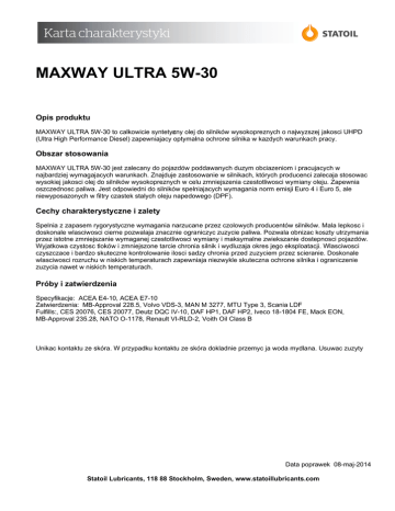 MAXWAY ULTRA 5W-30 Opis produktu MAXWAY ULTRA 5W-30 to calkowicie syntetyc zny olej do silników wysokopreznych o najwyzszej jakosci UHPD (Ultra High Performance Diesel) zapewniajacy optymalna ochrone silnika w kazdych warunkach pracy. Obszar stosowania MAXWAY ULTRA 5W-30 jest zalecany do pojazdów poddawanych duzym obciazeniom i pracujacych w najbardziej wymagajacych warunkach. Znajduje zastosowanie w silnikach, których producenci zalecaja stosowac wysokiej jakosci olej do silników wysokopreznych w celu zmniejszenia czestotliwosci wymiany oleju. Zapewnia oszczednosc paliwa. Jest odpowiedni do silników spelniajacych wymagania norm emisji Euro 4 i Euro 5, ale niewyposazonych w filtry czastek stalych oleju napedowego (DPF). Cechy charakterystyczne i zalety Spelnia z zapasem rygorystyczne wymagania narzucane przez czolowych producentów silników. Mala lepkosc i doskonale wlasciwosci cierne pozwalaja znacznie ograniczyc zuzycie paliwa. Pozwala obnizac koszty utrzymania przez istotne zmniejszanie wymaganej czestotliwosci wymiany i maksymalne zwiekszanie dostepnosci pojazdów. Wyjatkowa czystosc tloków i zmniejszone tarcie chronia silnik i wydluzaja okres jego eksploatacji. Wlasciwosci czyszczace i bardzo skuteczne kontrolowanie ilosci sadzy chronia przed zuzyciem przez scieranie. Doskonale wlasciwosci rozruchu w niskich temperaturach zapewniaja niezwykle skuteczna ochrone silnika i ograniczenie zuzycia nawet w niskich temperaturach. Próby i zatwierdzenia Specyfikacje: ACEA E4-10, ACEA E7-10 Zatwierdzenia: MB-Approval 228.5, Volvo VDS-3, MAN M 3277, MTU Type 3, Scania LDF Fulfills:, CES 20076, CES 20077, Deutz DQC IV-10, DAF HP1, DAF HP2, Iveco 18-1804 FE, Mack EON, MB-Approval 235.28, NATO O-1178, Renault VI-RLD-2, Voith Oil Class B Unikac kontaktu ze skóra. W przypadku kontaktu ze skóra dokladnie przemyc ja woda mydlana. Usuwac zuzyty Data poprawek 08-maj-2014 Statoil Lubricants, 118 88 Stockholm, Sweden, www.statoillubricants.com Dane charakterystyczne Charakterystyka Jednostki Metoda Wynik symulacji rozruchu silnika 6200 zimnego (CCS) w temperaturze -30°C 862 228 mPas ASTM D 5293 kg/m3 °C ISO 12185 ISO 2592 mPas °C mg KOH/g mm²/s mm²/s - CEC L-36-A-90 ISO 3016 ASTM D 2896 ISO 3104 ISO 3104 ISO 2909 (COC) TBN 3.6 -63 16 74 12.0 159 Data poprawek 08-maj-2014 Statoil Lubricants, 118 88 Stockholm, Sweden, www.statoillubricants.com