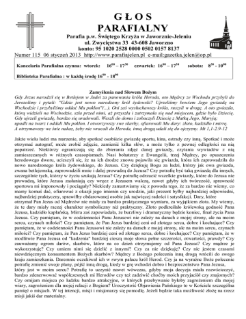 GŁOS PARAFIALNY Parafia p.w. Świętego Krzyża w Jaworznie-Jeleniu ul. Zwycięstwa 33 43-608 Jaworzno konto: 95 1020 2528 0000 0502 0157 8137 Numer 115 06 styczeń 2013 http://www.parafiajelen.pl e-mail:[email protected] Kancelaria Parafialna czynna: wtorek: 1600 – 1730 czwartek: 1600 – 1730 sobota: 830 - 1000 Biblioteka Parafialna : w każdą środę 1600 - 1800 Zamyślenia nad Słowem Bożym Gdy Jezus narodził się w Betlejem w Judei za panowania króla Heroda, oto Mędrcy ze Wschodu przybyli do Jerozolimy i pytali: "Gdzie jest nowo narodzony król żydowski? Ujrzeliśmy bowiem Jego gwiazdę na Wschodzie i przybyliśmy oddać Mu pokłon"(...). Oni zaś wysłuchawszy króla, ruszyli w drogę. A oto gwiazda, którą widzieli na Wschodzie, szła przed nimi, aż przyszła i zatrzymała się nad miejscem, gdzie było Dziecię. Gdy ujrzeli gwiazdę, bardzo się uradowali. Weszli do domu i zobaczyli Dziecię z Matką Jego, Maryją; upadli na twarz i oddali Mu pokłon. I otworzywszy swe skarby, ofiarowali Mu dary: złoto, kadzidło i mirrę. A otrzymawszy we śnie nakaz, żeby nie wracali do Heroda, inną drogą udali się do ojczyzny. Mt 1,1-2.9-12 Jakże wielu ludzi ma marzenie, aby spotkać osobiście gwiazdę sportu, kina, estrady czy inną. Spotkać i może otrzymać autograf, może zrobić zdjęcie, zamienić kilka słów, a może tylko z pewnej odległości na nią popatrzeć. Niektórzy ograniczają się do zbierania zdjęć danej gwiazdy, czytania wywiadów z nią zamieszczanych w różnych czasopismach. Nasi bohaterzy z Ewangelii, trzej Mędrcy, po opuszczeniu herodowego dworu, ucieszyli się, że na ich drodze znowu pojawiła się gwiazda, która ich zaprowadziła do nowo narodzonego króla żydowskiego, do Jezusa. Czy dziękuję Bogu za ludzi, którzy jak owa gwiazda, zwana betlejemską, zaprowadzili mnie i dalej prowadzą do Jezusa? Czy potrafię być taką gwiazdą dla innych, szczególnie tych, którzy w życiu szukają Jezusa? Czy potrafię odrzucić wszelkie gwiazdy, które do Jezusa nie prowadzą, które Jezusa zasłaniają czy wręcz z Jezusem walczą, nawet gdyby ich twórczość, sprawność sportowa mi imponowały i pociągały? Niekiedy zamartwiamy się z powodu tego, że za bardzo nie wiemy, co mamy komuś dać, ofiarować z okazji jego imienin czy urodzin, jaki prezent byłby najbardziej odpowiedni, najbardziej praktyczny, sprawiłby obdarowanej osobie jak najwięcej radości i satysfakcji. Dary, które otrzymał Pan Jezus od Mędrców nie miały za bardzo praktycznego wymiaru, za wyjątkiem złota. My wiemy, że te dary miały raczej charakter symboliczny niż praktyczny. Złoto podkreślało królewską godność Pana Jezusa, kadzidło kapłańską. Mirra zaś zapowiadała, że burzliwy i dramatyczny będzie koniec, finał życia Pana Jezusa. Czy pamiętam, że w codzienności Panu Jezusowi nie zależy na darach z mojej strony, ale na moim sercu, czynach miłości? Czy pamiętam, że Pan Jezus bardziej ceni od złotego serca, dobre i kochające? Czy pamiętam, że w codzienności Panu Jezusowi nie zależy na darach z mojej strony, ale na moim sercu, czynach miłości? Czy pamiętam, że Pan Jezus bardziej ceni od złotego serca, dobre i kochające? Czy pamiętam, że w modlitwie Pana Jezusa od "kadzenia" bardziej cieszą moje słowa pełne szczerości, otwartości, prawdy? Czy zauważamy ogrom darów, skarbów, które na co dzień otrzymujemy od Pana Jezusa? Czy mądrze je wykorzystuję? Czy umiem nimi się dzielić z innymi? Czy za nie dziękuję? Czy nie jestem czasami niewdzięcznym konsumentem Bożych skarbów? Mędrcy z Bożego polecenia inną drogą wrócili do swego kraju zamieszkania. Daremnie oczekiwał ich w swym pałacu król Herod. Czy ja na wyraźne Boże polecenie potrafię zmienić swoje plany, pójść inną drogą, kiedy w grę wchodzi dobro i bezpieczeństwo Pana Jezusa, który jest w moim sercu? Potrafię to uczynić nawet wówczas, gdyby moja decyzja miała rozwścieczyć, bardzo zdenerwować współczesnych mi Herodów czy też zadziwić choćby moich przyjaciół czy znajomych? Czy omijam miejsca po ludzku bardzo atrakcyjne, w których przebywanie byłoby zagrożeniem dla mojej wiary, zagrożeniem dla mojej relacji z Bogiem? Uroczystość Objawienia Pańskiego to w Kościele szczególna pamięć o misjach. W tej intencji, misji i misjonarzy się pomodlę. Jeżeli będzie taka możliwość złożę na rzecz misji jakiś dar materialny. "Dziecię się nam narodziło.... Syn został nam dany" Znowu była Wigilia, Boże Narodzenie, żłóbek, choinka, Nowy Rok. Jak spędziliśmy i przeżyliśmy te święta? Czy nas też, jak innych dosięgła pogoń za reklamowanymi rzeczami, a między zakupami zabiegani "wpadaliśmy "do kościoła, bo może akurat uda się nam wyspowiadać, bo tak wypada, bo co powiedzą sąsiedzi - to też tylko nasz wybór. Pewnie też było puste miejsce przy wigilijnym stole, a my zdobyliśmy się na miłe słowa, uśmiech i życzliwość dla najbliższych, może nawet udało się zanucić razem kilka kolęd, a na koniec było nas jeszcze stać na nocną wyprawę do kościoła na Pasterkę, bo to tradycja z dziada pradziada. Poprosiliśmy też Jezusa, by nam pobłogosławił na ten rok co przed nami. Jeśli dotąd wszystko układało się po naszej myśli, to niektórych z nas stać było na to, by Bogu za to podziękować. Ciekawe, co przynieśliśmy Jezusowi do żłóbka?. Nawet królowie i pasterze składali dary, a my? Jeśli zdarza się tak, że kończą się święta i znika gdzieś ta radość, dobro, wzajemna życzliwość, a w naszych rodzinach wszystko wraca do stanu przed świętami, to coś jest nie tak. Nowy Rok zmusza nas do spojrzenia w przeszłość, ale jeszcze intensywniej w przyszłość. Gdy staniemy przy żłóbku, gdy betlejemska gwiazda oświetli nam Jezusa popatrzmy głęboko w Jego oczy i serce i przypomnijmy sobie, po co tak naprawdę Bóg przychodzi do nas, po co się rodzi wśród nas? Jezus r