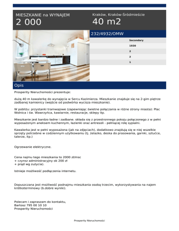 Kraków, Kraków-Śródmieście MIESZKANIE na WYNAJEM 40 m2 2 000 232/4932/OMW Secondary 1930 2 2 1 Opis Prosperity Nieruchomości prezentuje: dużą 40 m kawalerkę do wynajęcia w Sercu Kazimierza. Mieszkanie znajduje się na 2-gim piętrze zadbanej kamienicy (wejście od podwórka wycisza mieszkanie). W pobliżu: przystanki tramwajowe (zapewniając świetne połączania w różne strony miasta): Plac Wolnica i św. Wawrzyńca, kawiarnie, restauracje, sklepy itp. Mieszkanie jest bardzo ładne i zadbane. składa się z przestronnego pokoju połączonego z w pełni wyposażonym aneksem kuchennym, łazienki oraz antresoli - pełniącej rolę sypialni. Kawalerka jest w pełni wyposażona (jak na zdjęciach), dodatkowo znajdują się w niej wszelkie sprzęty potrzebne w codziennym użytkowaniu (tj. żelazko, deska do prasowania, garnki, sztućce, talerze, itp.) Ogrzewanie elektryczne. Cena najmu tego mieszkania to 2000 zł/msc + czynsz administracyjny ok 200 zł + prąd wg zużycia). Istnieje możliwość podłączenia internetu. Dopuszczana jest możliwość podnajmu mieszkania osobą trzecim, wykorzystywania na najem krótkoterminowy (b.dobre wyniki). Polecam i zapraszam do kontaktu, Bartosz 795 00 10 10 Prosperity Nieruchomości Prosperity Nieruchomości ul. Bandurskiego 24/1 31-515 Kraków www.prosperitynieruchomosci.pl www.prosperity-group.pl Bartosz Nowacki tel. +48 795001010 email: [email protected] Prosperity Nieruchomości Powered by TCPDF (www.tcpdf.org)
