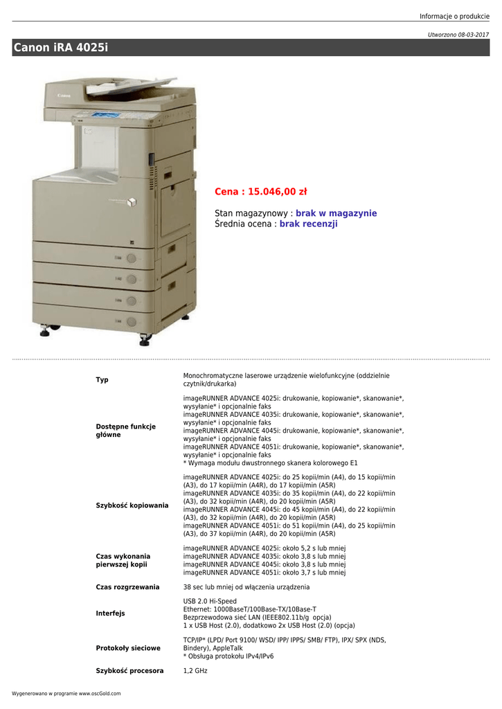 Informacje o produkcie Utworzono 08-03-2017 Canon iRA 4025i Cena : 15.046,00 zł Stan magazynowy : brak w magazynie Średnia ocena : brak recenzji Typ Monochromatyczne laserowe urządzenie wielofunkcyjne (oddzielnie czytnik/drukarka) Dostępne funkcje główne imageRUNNER ADVANCE 4025i: drukowanie, kopiowanie*, skanowanie*, wysyłanie* i opcjonalnie faks imageRUNNER ADVANCE 4035i: drukowanie, kopiowanie*, skanowanie*, wysyłanie* i opcjonalnie faks imageRUNNER ADVANCE 4045i: drukowanie, kopiowanie*, skanowanie*, wysyłanie* i opcjonalnie faks imageRUNNER ADVANCE 4051i: drukowanie, kopiowanie*, skanowanie*, wysyłanie* i opcjonalnie faks * Wymaga modułu dwustronnego skanera kolorowego E1 Szybkość kopiowania imageRUNNER ADVANCE 4025i: do 25 kopii/min (A4), do 15 kopii/min (A3), do 17 kopii/min (A4R), do 17 kopii/min (A5R) imageRUNNER ADVANCE 4035i: do 35 kopii/min (A4), do 22 kopii/min (A3), do 32 kopii/min (A4R), do 20 kopii/min (A5R) imageRUNNER ADVANCE 4045i: do 45 kopii/min (A4), do 22 kopii/min (A3), do 32 kopii/min (A4R), do 20 kopii/min (A5R) imageRUNNER ADVANCE 4051i: do 51 kopii/min (A4), do 25 kopii/min (A3), do 37 kopii/min (A4R), do 20 kopii/min (A5R) Czas wykonania pierwszej kopii imageRUNNER ADVANCE 4025i: około 5,2 s lub mniej imageRUNNER ADVANCE 4035i: około 3,8 s lub mniej imageRUNNER ADVANCE 4045i: około 3,8 s lub mniej imageRUNNER ADVANCE 4051i: około 3,7 s lub mniej Czas rozgrzewania 38 sec lub mniej od włączenia urządzenia Interfejs USB 2.0 Hi-Speed Ethernet: 1000BaseT/100Base-TX/10Base-T Bezprzewodowa sieć LAN (IEEE802.11b/g opcja) 1 x USB Host (2.0), dodatkowo 2x USB Host (2.0) (opcja) Protokoły sieciowe TCP/IP* (LPD/ Port 9100/ WSD/ IPP/ IPPS/ SMB/ FTP), IPX/ SPX (NDS, Bindery), AppleTalk * Obsługa protokołu IPv4/IPv6 Szybkość procesora 1,2 GHz Wygenerowano w programie www.oscGold.com Pamięć 1 GB + 256 MB (dodatkowe 512 MB do skanowania kolor i wysyłania materiałów powyżej 300 dpi) Dysk twardy Standardowo dysk twardy 80 GB / opcjonalny dysk twardy 250 GB Panel sterowania Kolorowy ekran dotykowy TFT VGA o przekątnej 21,3 cm (8,4 cala) Wymiary (szer. x głęb. x wys.) 565 x 700 x 769 mm (bez podajnika DADF) 565 x 700 x 909 mm (z podajnikiem DADF) Miejsce na instalację (szer. x gł.) 876 x 1150 mm (jednostka centralna + podajnik ręczny + otwarte szuflady) Waga Około 67,5 kg (bez podajnika DADF), 75,4 kg (z podajnikiem DADF) Źródło zasilania 220240 V (10%), 50/60 Hz (2 Hz), 4,35,6 A Pobór mocy Maksymalny: około 1,5 kW Tryb gotowości: około 58 W (51 str./min), 60 W (45 str./min / 35 str./min / 25 str./min) Tryb oszczędzania energii: około 28 W (51 str./min), 31 W (45 str./min / 35 str./min / 25 str./min) Tryb uśpienia: około 1 W lub mniej Typowy pobór energii elektrycznej (TEC): 2,83 kWh / 2,52 kWh / 1,59 kWh / 1,07 kWh (51 str./min / 45 str./min / 35 str./min / 25 str./min) Więcej informacji nt. specyfikacji produktu Inteligentne urządzenia wielofunkcyjne umożliwiające aktywnym grupom roboczym wysoką wydajność i jakość pracy, dzięki usprawnieniu obiegu dokumentów i ochronie informacji poufnych przy jednoczesnym zredukowaniu negatywnego wpływu na środowisko naturalne. Funkcje: - kolorowy intuicyjny panel dotykowy 8,4 (21,3 cm) z możliwością dostosowania interfejsu użytkownika - wydajność do 25 str./min - pojemność papieru do 4980 arkuszy - integracja z szeroką gamą oprogramowania zapewniającego bezpieczeństwo, obieg dokumentów i zarządzanie kosztami - oszczędność miejsca dzięki wewnętrznym lub zaawansowanym zewnętrznym opcjom wykańczania dokumentów - rozwiązania przyjazne dla środowiska Wydajny obieg dokumentów Intuicyjny interfejs użytkownika z opcjami łatwego dostępu gwarantuje wygodną obsługę i zautomatyzowanie opcji wykańczania prac, skracając czas potrzebny do utworzenia profesjonalnych dokumentów. Funkcja wysyłania z opcją wyszukiwania plików usprawnia obieg i wyszukiwanie informacji, a oprogramowanie Adobe PDF/A-1b umożliwia wysyłanie dokumentów bezpośrednio do archiwum. Potężna platforma MEAP firmy Canon integruje się ściśle z szeroką gamą oprogramowania do przechwytywania i zarządzania dokumentami. Kontrola kosztów Seria iR-ADV 4000 zapewnia biurom wiele funkcji i możliwości dostępnych w jednym urządzeniu. Modułowa konstrukcja i możliwość współdzielenia dodatkowych opcji oznaczają, że nie musisz płacić za niepotrzebne funkcjonalności urządzenia. Łatwe zarządzanie dodatkowo redukuje koszty i nie obciąża zasobów informatycznych firmy. Oprogramowanie uniFLOW rozszerza zakres kontroli kosztów dzięki opcjom: wyboru centrum kosztów, przekierowywania zadań druku i szczegółowego raportowania. Bezpieczeństwo informacji Twoje dane są chronione dzięki funkcjom uwierzytelniania użytkowników, filtrowania adresów i bezpiecznego drukowania wszystko to w standardzie. Ponadto moduł TPM (Trusted Platform Module) szyfruje dane logowania. Dostępna jest szeroka gama zabezpieczeń dostosowanych do różnych potrzeb. Zadania druku wysyłane do lub przechowywane w urządzeniu mogą być szyfrowane, a także bezpiecznie usuwane. Co więcej, zeskanowane materiały mogą być chronione hasłem i szyfrowane, a także weryfikowane za pomocą cyfrowych podpisów. Próba powielenia poufnego dokumentu może być odrzucana lub skutecznie uniemożliwiona dzięki opcji dodawania znaków wodnych. Opcjonalny zestaw HDD Data Encryption & Mirroring Kit zapewnia zgodność z normami Common Criteria na poziomie EAL3. Rozwiązanie uniFLOW zapewnia jeszcze wyższy poziom bezpieczeństwa informacji poprzez scentralizowane uwierzytelnianie użytkowników, bezpieczne drukowanie z każdego urządzenia i ograniczanie funkcji możliwych do wykorzystania przez użytkownika. Jako pierwsze rozwiązanie w branży uniFLOW wraz z urządzeniem imageRUNNER ADVANCE umożliwiają zapobieganie utracie danych (Data Loss Prevention) wydruków, kopii, skanów i faksów przez analizę OCR po
