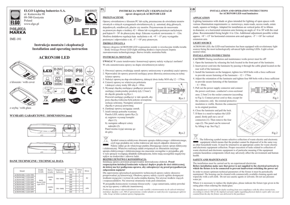 PL ELGO Lighting Industries S.A. ul. Kutnowska 98 09-500 Gostynin Poland www.elgo.pl GB INSTRUKCJA MONTA¯U I EKSPLOATACJI opraw drogowych ACRON100 LED PRZEZNACZENIE Oprawy oœwietleniowe z kloszem PC lub szyb¹, przeznaczone do oœwietlania terenów otwartych o ró¿nych wymaganiach oœwietleniowych, tj.: autostrad, dróg g³ównych, dojazdowych, osiedlowych, placów czy mostów. Przystosowane do mocowania na pionowym s³upie o œrednicy 42 ÷ 60mm lub wysiêgniku poziomym nachylonym pod k¹tem 0 ÷ 30o do p³aszczyzny drogi. Zalecana wysokoœæ zawieszenia: 6 ÷ 12m. Mo¿liwa dodatkowa regulacja k¹ta nachylenia o ok. +0o / -15o przy wysiêgniku poziomym i odpowiednio o ok. -5o / +10o przy pionowym. Instrukcja monta¿u i eksploatacji Installation and operating instruction ACRON100 LED RÓD£O ŒWIAT£A Oprawy drogowe ACRON100 LED wyposa¿one zosta³y w rewolucyjne Ÿród³a œwiat³a – diody œwiec¹ce Power LED (light emitting diodes) o najwy¿szym stopniu zaawansowania technologicznego. Barwa œwiat³a: neutralna bia³a. INSTRUKCJA MONTA¯U UWAGA! W czasie instalowania i konserwacji oprawy nale¿y wy³¹czyæ zasilanie! W celu zamontowania oprawy na s³upie oœwietleniowym nale¿y: 90-264V 50-60Hz AC 1. Otworzyæ oprawê zwalniaj¹c zamek oprawy umieszczony w przedniej czêœci oprawy. 2. Wprowadziæ do oprawy przewód zasilaj¹cy przez d³awnicê umieszczon¹ na tylnej œciance oprawy. 3. Na³o¿yæ oprawê na s³up oœwietleniowy, dokrêciæ dwie œruby M10 si³¹ 12 ÷ 17Nm. 4. Ustawiæ oprawê we w³aœciwym po³o¿eniu i dokrêciæ cztery œruby M8 si³¹ 6 ÷ 8Nm. 5. Wysun¹æ z³¹czkê zasilaj¹c¹ i pod³¹czyæ przewód zasilaj¹cy (maksymalny przekrój ¿y³y 2.5mm2) do z³¹czki gniazda wg Rys.1. Przewód zasilaj¹cy pod³¹czyæ w taki sposób, aby Rys.1 poza z³¹czk¹ widoczna by³a jedynie zewnêtrzna izolacja ochronna. Nastêpnie umieœciæ z³¹czkê w pozycji pierwotnej. 6. Zamkn¹æ oprawê zaci¹gaj¹c zamek. 2 7. Je¿eli istnieje potrzeba wymiany Panelu LED, nale¿y (patrz Rys.2): 1 a). najpierw wysun¹æ komplet z³¹cz (1), b). nastêpnie odkrêciæ cztery nakrêtki (2). Panel mo¿na wyj¹æ unosz¹c go do góry. z kloszem / with cover z szyb¹ / with glass 217 WYMIARY GABARYTOWE / DIMENSIONS [mm] Rys.2 672 317 DANE TECHNICZNE / TECHNICAL DATA Model ACRON100L1 LED-70W ACRON100L1 LED-60W ACRON100L1 LED-50W ACRON100L1 LED-40W ACRON100L1 LED-70W ACRON100L1 LED-60W ACRON100L1 LED-50W ACRON100L1 LED-40W ród³o œwiat³a diody Power LED typu XT-E APPLICATION Lighting luminaires with shade or glass intended for lighting of open spaces with various illumination requirements i.e. motorways, main roads, access roads, estate roads, squares or bridges. Adapted for installation on vertical poles 42 to 60mm in diameter, or a horizontal extension arm forming an angle of 0 to 30o with the road plane. Recommended fixing height: 6 to 12m. Additional adjustment possible within o o o o approx. +0 / -15 for horizontal extension arm and approx. -5 / +10 for vertical extension arm. LIGHT SOURCE ACRON100 LED, the LED road luminaires has been equipped with revolutionary light sources being the most technologically advanced light emitting LEDs. Light colour: neutral white. INSTALLATION INSTRUCTIONS CAUTION! During installation and maintenance works power must be off! 1. Open the luminaire by releasing the lock located in the front part of the luminaire. 2. Insert power cord into the luminaire by passing it through the cable gland located on the rear wall of the luminaire. 3. Install the luminaire on the lamppost, tighten two M10 bolts with a force sufficient to provide secure fastening of the luminaire – 12 ÷ 17Nm. 4. Adjust the orientation of the luminaire and tighten four M8 bolts with a force sufficient to provide secure fastening of the luminiare – 6 ÷ 8Nm. 5. Pull out the power supply connector and connect the power cord (max. conductor's cross-sectional area: 2.5mm2) to the socket connector (according to Fig.1). Connect power cord so that, except for Fig.1 the connector, only the external protective insulation is visible. Restore the connector to its original position. 6. Close the luminaire and pull the lock. 2 7. If there is a need to replace the LED 1 panel, firstly pull out a set of connectors (1). Then remove the four caps (2). The panel can be removed by lifting it up. See Fig.2. Fig.2 317 183 672 INSTALLATION AND OPERATION INSTRUCTIONS for ACRON100 LED road luminaires Barwa œwiat³a neutralna bia³a neutralna bia³a Temperatura barwowa 3700 ÷ 5000K 3700 ÷ 5000K Moc oprawy Klasa ochr. 70W 60W 50W 40W 70W 60W 50W 40W I I I I I I I I Klosz PC szk³o Symbol oznacza selektywne zbieranie sprzêtu elektrycznego i elektronicznego, czyli tego produktu nie wolno traktowaæ jak innych odpadów domowych. Nale¿y oddaæ go do w³aœciwego punktu zbieraj¹cego zu¿yty sprzêt elektryczny i elektroniczny. W³aœciwa realizacja zadañ zwi¹zanych ze zbieraniem zu¿ytego sprzêtu elektrycznego i elektronicznego ma znaczenie szczególne w przypadku, gdy w tym sprzêcie wystêpuj¹ sk³adniki niebezpieczne, które maj¹ szczególnie negatywny wp³yw na œrodowisko i zdrowie ludzi. BEZPIECZEÑSTWO I KONSERWACJA Instalacjê oprawy powinien przeprowadziæ doœwiadczony elektryk. Przed rozpoczêciem instalacji koniecznie wy³¹czyæ dop³yw pr¹du do sieci elektrycznej, do której ma byæ pod³¹czona oprawa, aby zabezpieczyæ siê przed przypadkowym za³¹czeniem napiêcia! Dla zapewnienia optymalnych parametrów technicznych oprawy nale¿y okresowo przeprowadzaæ jej konserwacjê. Obudowê oprawy nale¿y czyœciæ ogólnie dostêpnymi œrodkami myj¹cymi i wytrzeæ do sucha miêkk¹ tkanin¹. Nie u¿ywaæ œrodków ¿r¹cych i rozpuszczalników. Nie stosowaæ strumienia wody pod ciœnieniem. W przypadku koniecznoœci wymiany klosza/szyby - i jego zamawiania, nale¿y powo³aæ siê na typ oprawy z tabliczki znamionowej. Producent nie ponosi odpowiedzialnoœci za wady wynik³e z nies