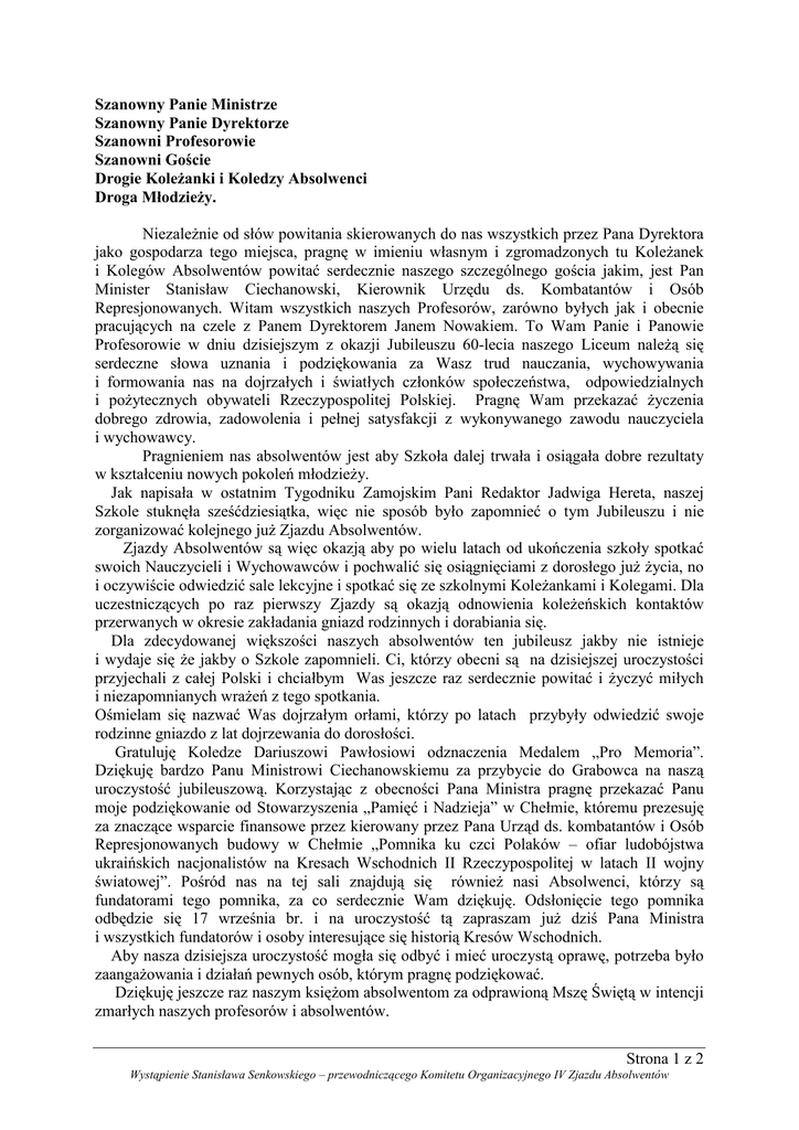 Szanowny Panie Ministrze Szanowny Panie Dyrektorze Szanowni Profesorowie Szanowni Goście Drogie KoleŜanki i Koledzy Absolwenci Droga MłodzieŜy. NiezaleŜnie od słów powitania skierowanych do nas wszystkich przez Pana Dyrektora jako gospodarza tego miejsca, pragnę w imieniu własnym i zgromadzonych tu KoleŜanek i Kolegów Absolwentów powitać serdecznie naszego szczególnego gościa jakim, jest Pan Minister Stanisław Ciechanowski, Kierownik Urzędu ds. Kombatantów i Osób Represjonowanych. Witam wszystkich naszych Profesorów, zarówno byłych jak i obecnie pracujących na czele z Panem Dyrektorem Janem Nowakiem. To Wam Panie i Panowie Profesorowie w dniu dzisiejszym z okazji Jubileuszu 60-lecia naszego Liceum naleŜą się serdeczne słowa uznania i podziękowania za Wasz trud nauczania, wychowywania i formowania nas na dojrzałych i światłych członków społeczeństwa, odpowiedzialnych i poŜytecznych obywateli Rzeczypospolitej Polskiej. Pragnę Wam przekazać Ŝyczenia dobrego zdrowia, zadowolenia i pełnej satysfakcji z wykonywanego zawodu nauczyciela i wychowawcy. Pragnieniem nas absolwentów jest aby Szkoła dalej trwała i osiągała dobre rezultaty w kształceniu nowych pokoleń młodzieŜy. Jak napisała w ostatnim Tygodniku Zamojskim Pani Redaktor Jadwiga Hereta, naszej Szkole stuknęła sześćdziesiątka, więc nie sposób było zapomnieć o tym Jubileuszu i nie zorganizować kolejnego juŜ Zjazdu Absolwentów. Zjazdy Absolwentów są więc okazją aby po wielu latach od ukończenia szkoły spotkać swoich Nauczycieli i Wychowawców i pochwalić się osiągnięciami z dorosłego juŜ Ŝycia, no i oczywiście odwiedzić sale lekcyjne i spotkać się ze szkolnymi KoleŜankami i Kolegami. Dla uczestniczących po raz pierwszy Zjazdy są okazją odnowienia koleŜeńskich kontaktów przerwanych w okresie zakładania gniazd rodzinnych i dorabiania się. Dla zdecydowanej większości naszych absolwentów ten jubileusz jakby nie istnieje i wydaje się Ŝe jakby o Szkole zapomnieli. Ci, którzy obecni są na dzisiejszej uroczystości przyjechali z całej Polski i chciałbym Was jeszcze raz serdecznie powitać i Ŝyczyć miłych i niezapomnianych wraŜeń z tego spotkania. Ośmielam się nazwać Was dojrzałym orłami, którzy po latach przybyły odwiedzić swoje rodzinne gniazdo z lat dojrzewania do dorosłości. Gratuluję Koledze Dariuszowi Pawłosiowi odznaczenia Medalem „Pro Memoria”. Dziękuję bardzo Panu Ministrowi Ciechanowskiemu za przybycie do Grabowca na naszą uroczystość jubileuszową. Korzystając z obecności Pana Ministra pragnę przekazać Panu moje podziękowanie od Stowarzyszenia „Pamięć i Nadzieja” w Chełmie, któremu prezesuję za znaczące wsparcie finansowe przez kierowany przez Pana Urząd ds. kombatantów i Osób Represjonowanych budowy w Chełmie „Pomnika ku czci Polaków – ofiar ludobójstwa ukraińskich nacjonalistów na Kresach Wschodnich II Rzeczypospolitej w latach II wojny światowej”. Pośród nas na tej sali znajdują się równieŜ nasi Absolwenci, którzy są fundatorami tego pomnika, za co serdecznie Wam dziękuję. Odsłonięcie tego pomnika odbędzie się 17 września br. i na uroczystość tą zapraszam juŜ dziś Pana Ministra i wszystkich fundatorów i osoby interesujące się historią Kresów Wschodnich. Aby nasza dzisiejsza uroczystość mogła się odbyć i mieć uroczystą oprawę, potrzeba było zaangaŜowania i działań pewnych osób, którym pragnę podziękować. Dziękuję jeszcze raz naszym księŜom absolwentom za odprawioną Mszę Świętą w intencji zmarłych naszych profesorów i absolwentów. Strona 1 z 2 Wystąpienie Stanisława Senkowskiego – przewodniczącego Komitetu Organizacyjnego IV Zjazdu Absolwentów Dziękuję grabowieckiej orkiestrze dętej za uświetnienie swoim udziałem naszej uroczystości zarówno w kościele jak i tej uroczystości. Dziękuję Pani ElŜbiecie Widyma - Dyrektorowi Zespołu Szkół im. H. Sienkiewicza za udostępnienie nam pomieszczeń stołówki i tej hali sportowej. Dziękuję wszystkim Nauczycielom i młodzieŜy Liceum za wykonaną pracę niezbędną do przygotowania Szkoły do odbycia dzisiejszej uroczystości. Dziękuję bardzo Członkom Komitetu Organizacyjnego, którzy wspierali mnie w organizacji tego zjazdu, a szczególnie Tadziowi Halickiemu - sekretarzowi Stowarzyszenia Absolwentów. Dziękuję bardzo wszystkim naszym gościom, którzy przybyli na naszą uroczystość jubileuszową i skierowane do nas miłe słowa. Wszystkim Państwu Ŝyczę miłych wraŜeń i wspomnień z udziału w naszej dzisiejszej uroczystości jubileuszowej. Absolwentom i osobom towarzyszącym Ŝyczę udanej zabawy wieczornej i miłych spotkań w gronie koleŜeńskim. Dziękuję za uwagę. Grabowiec – 25.06.2011 r. Strona 2 z 2 Wystąpienie Stanisława Senkowskiego – przewodniczącego Komitetu Organizacyjnego IV Zjazdu Absolwentów