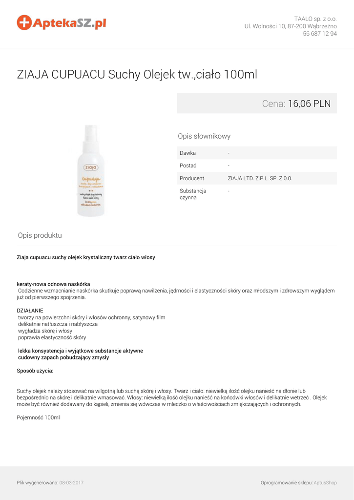 ZIAJA CUPUACU Suchy Olejek tw.,ciało 100ml