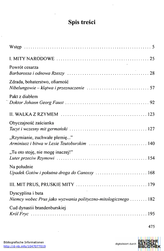 Spis treści Wstęp 5 I. MITY NARODOWE 25 Powrót cesarza Barbarossa i odnowa Rzeszy 28 Zdrada, bohaterstwo, ofiarność Nibelungowie - klątwa i przeznaczenie 57 Pakt z diabłem Doktor Johann Georg Faust 92 II. WALKA Z RZYMEM 123 Obyczajność zaścianka Tacyt i wczesny mit germański 127 „Rzymianie, zuchwałe plemię..." Arminiusz i bitwa w Lesie feutoburskim 140 „Tu oto stoję, nie mogę inaczej!" Luter przeciw Rzymowi 154 Na południe Upadek Gotów i pokutna droga do Canossy 168 III. MIT PRUS, PRUSKIE MITY 179 Dyscyplina i buta Niemcy wobec Prus jako wyzwania polityczno-mitologicznego 182 Cud dynastii brandenburskiej Król Fryc 195 475 http://d-nb.info/1047077019 Spis treści Madonna i bogini wojny Luiza i Krzyż Żelazny 216 Prusy jako łup „Dzień Poczdamu " i zamach na Hitlera 231 IV. ZAMKI I MIASTA 249 „Dobra tarcza i miecz..." Wartburg 252 Mit wykształconego mieszczaństwa niemieckiego Weimar i „klasyka niemiecka" 275 Duma w ruinie Norymberga i Drezno jako miejsca mityczne 303 Wino, śpiew i wrzawa wojenna Mity Renu i mity nad Renem 326 V. MITY POLITYCZNE PO DRUGIEJ WOJNIE ŚWIATOWEJ 347 Opór antyfaszystowski, rewolucja wczesnomieszczańska i wojny wyzwoleńcze Mity założycielskie w NRD 353 Reforma walutowa i cud gospodarczy Mity polityczne Republiki Federalnej 385 „Jesteśmy papieżem", „Niemcy to ty" Zamiast mitu: nagłówki i kampanie reklamowe 403 Bibliografia 415 Indeks nazwisk 463 Podziękowanie 473