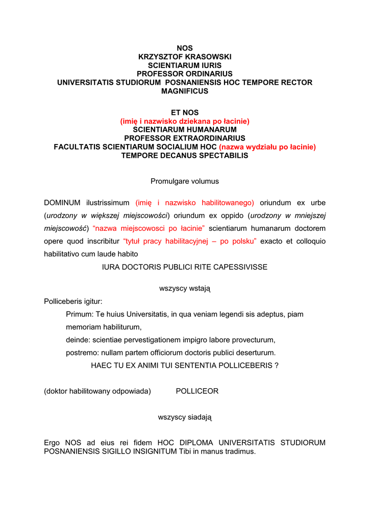 NOS KRZYSZTOF KRASOWSKI SCIENTIARUM IURIS PROFESSOR ORDINARIUS UNIVERSITATIS STUDIORUM POSNANIENSIS HOC TEMPORE RECTOR MAGNIFICUS ET NOS (imię i nazwisko dziekana po łacinie) SCIENTIARUM HUMANARUM PROFESSOR EXTRAORDINARIUS FACULTATIS SCIENTIARUM SOCIALIUM HOC (nazwa wydziału po łacinie) TEMPORE DECANUS SPECTABILIS Promulgare volumus DOMINUM ilustrissimum (imię i nazwisko habilitowanego) oriundum ex urbe (urodzony w większej miejscowości) oriundum ex oppido (urodzony w mniejszej miejscowość) “nazwa miejscowosci po łacinie” scientiarum humanarum doctorem opere quod inscribitur “tytuł pracy habilitacyjnej – po polsku” exacto et colloquio habilitativo cum laude habito IURA DOCTORIS PUBLICI RITE CAPESSIVISSE wszyscy wstają Polliceberis igitur: Primum: Te huius Universitatis, in qua veniam legendi sis adeptus, piam memoriam habiliturum, deinde: scientiae pervestigationem impigro labore provecturum, postremo: nullam partem officiorum doctoris publici deserturum. HAEC TU EX ANIMI TUI SENTENTIA POLLICEBERIS ? (doktor habilitowany odpowiada) POLLICEOR wszyscy siadają Ergo NOS ad eius rei fidem HOC DIPLOMA UNIVERSITATIS STUDIORUM POSNANIENSIS SIGILLO INSIGNITUM Tibi in manus tradimus.