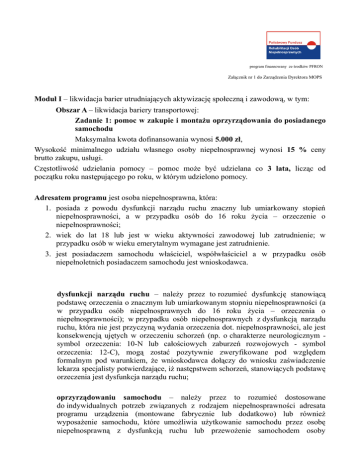 program finansowany ze środków PFRON Załącznik nr 1 do Zarządzenia Dyrektora MOPS Moduł I – likwidacja barier utrudniających aktywizację społeczną i zawodową, w tym: Obszar A – likwidacja bariery transportowej: Zadanie 1: pomoc w zakupie i montażu oprzyrządowania do posiadanego samochodu Maksymalna kwota dofinansowania wynosi 5.000 zł, Wysokość minimalnego udziału własnego osoby niepełnosprawnej wynosi 15 % ceny brutto zakupu, usługi. Częstotliwość udzielania pomocy – pomoc może być udzielana co 3 lata, licząc od początku roku następującego po roku, w którym udzielono pomocy. Adresatem programu jest osoba niepełnosprawna, która: 1. posiada z powodu dysfunkcji narządu ruchu znaczny lub umiarkowany stopień niepełnosprawności, a w przypadku osób do 16 roku życia – orzeczenie o niepełnosprawności; 2. wiek do lat 18 lub jest w wieku aktywności zawodowej lub zatrudnienie; w przypadku osób w wieku emerytalnym wymagane jest zatrudnienie. 3. jest posiadaczem samochodu właściciel, współwłaściciel a w przypadku osób niepełnoletnich posiadaczem samochodu jest wnioskodawca. dysfunkcji narządu ruchu – należy przez to rozumieć dysfunkcję stanowiącą podstawę orzeczenia o znacznym lub umiarkowanym stopniu niepełnosprawności (a w przypadku osób niepełnosprawnych do 16 roku życia – orzeczenia o niepełnosprawności); w przypadku osób niepełnosprawnych z dysfunkcją narządu ruchu, która nie jest przyczyną wydania orzeczenia dot. niepełnosprawności, ale jest konsekwencją ujętych w orzeczeniu schorzeń (np. o charakterze neurologicznym symbol orzeczenia: 10-N lub całościowych zaburzeń rozwojowych - symbol orzeczenia: 12-C), mogą zostać pozytywnie zweryfikowane pod względem formalnym pod warunkiem, że wnioskodawca dołączy do wniosku zaświadczenie lekarza specjalisty potwierdzające, iż następstwem schorzeń, stanowiących podstawę orzeczenia jest dysfunkcja narządu ruchu; oprzyrządowaniu samochodu – należy przez to rozumieć dostosowane do indywidualnych potrzeb związanych z rodzajem niepełnosprawności adresata programu urządzenia (montowane fabrycznie lub dodatkowo) lub również wyposażenie samochodu, które umożliwia użytkowanie samochodu przez osobę niepełnosprawną z dysfunkcją ruchu lub przewożenie samochodem osoby niepełnosprawnej oraz niezbędnego sprzętu rehabilitacyjnego; zatrudnieniu – należy przez to rozumieć: a) stosunek pracy na podstawie umowy o pracę, zawartej na czas nieokreślony lub określony, jednakże nie krótszy niż 3 miesiące, b) stosunek pracy na podstawie powołania, wyboru, mianowania oraz spółdzielczej umowy o pracę, jeżeli na podstawie przepisów szczególnych pracownik został powołany na czas określony; okres ten nie może być krótszy niż 3 miesiące, c) działalność rolniczą w rozumieniu ustawy z dnia 20 grudnia 1990 r. o ubezpieczeniu społecznym rolników (Dz. U. z 2008 r. Nr 50, poz. 291, z późn. zm.), d) działalność gospodarczą w rozumieniu ustawy z dnia 2 lipca 2004 r. o swobodzie działalności gospodarczej (Dz. U. z 2010 r. Nr 220, poz. 1447, z późn. zm.), e) zatrudnienie na podstawie umowy cywilnoprawnej, zawartej na okres nie krótszy niż 6 miesięcy, f) staż zawodowy w rozumieniu ustawy z dnia 20 kwietnia 2004 r. o promocji zatrudnienia i instytucjach rynku pracy (Dz. U. z 2008 r. Nr 69, poz. 415, z późn. zm.) posiadacz samochodu (w rozumieniu programu) – należy przez to rozumieć jego właściciela lub współwłaściciela; w przypadku osób niepełnoletnich posiadaczem samochodu jest wnioskodawca. program finansowany ze środków PFRON Załącznik nr 2 do Zarządzenia Dyrektora MOPS Moduł I – likwidacja barier utrudniających aktywizację społeczną i zawodową, w tym: Obszar A – likwidacja bariery transportowej: Zadanie 2: Pomoc w uzyskaniu prawa jazdy kategorii B Maksymalna kwota dofinansowania wynosi 2.100 zł, w tym: a) dla kosztów kursu i egzaminów – 1.500 zł, b) dla pozostałych kosztów uzyskania prawa jazdy w przypadku kursu poza miejscowością zamieszkania wnioskodawcy (koszty związane z zakwaterowaniem, wyżywieniem i dojazdem w okresie trwania kursu) – 600 zł, Wysokość minimalnego udziału własnego osoby niepełnosprawnej wynosi 25% kosztów uzyskania prawa jazdy kat. B. Częstotliwość udzielania pomocy – pomoc może być udzielana co 3 lata, licząc od początku roku następującego po roku, w którym udzielono pomocy. Adresatem programu jest osoba niepełnosprawna, która: 1. w wieku aktywności zawodowej, posiada znaczny lub umiarkowany stopień niepełnosprawności oraz dysfunkcję narządu ruchu oraz brak jest przeciwskazań zdrowotnych do kierownia pojazdami. aktywności zawodowej – należy przez to rozumieć: a) zatrudnienie, lub b) rejestrację w urzędzie pracy jako osoba bezrobotna, lub c) rejestrację w urzędzie pracy jako osoba poszukująca i nie pozostająca w zatrudnieniu pracy dysfunkcji narządu ruchu – należy przez to rozumieć dysfunkcję stanowiącą podstawę orzeczenia o znacznym lub umiarkowanym stopniu niepełnosprawności (a w przypadku osób niepełnosprawnych do 16 roku życia – orzeczenia o niepełnosprawności); w przypadku osób niepełnosprawnych z dysfunkcją narządu ruchu, która nie jest przyczyną wydania orzeczenia dot. niepełnosprawności, ale jest konsekwencją ujętych w orzeczeniu schorzeń (np. o charakterze neurologicznym - symbol orzeczenia: 10-N lub całościowych zaburzeń rozwojowych - symbol orzeczenia: 12-C), mogą zostać pozytywnie zweryfikowane pod względem formalnym pod warunkiem, że wnioskodawca dołączy do wniosku zaświadczenie lekarza specjalisty potwierdzające, iż następstwem schorzeń, stanowiących podstawę orzeczenia jest dysfunkcja narządu ruchu. program finansowany ze środków PFRON Załącznik nr 3 do Zarządzenia Dyrektora MOPS Moduł I – likwidacja barier utrudniających aktywizację społeczną i zawodo