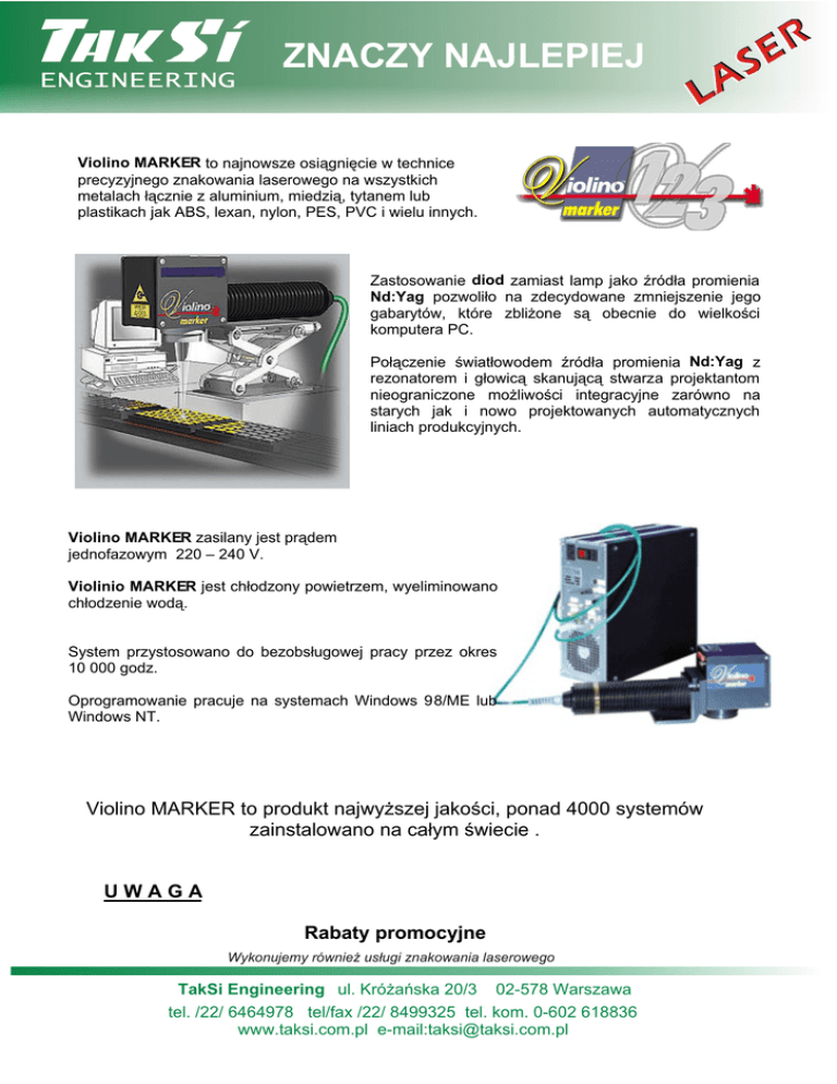 ENGINEERING ZNACZY NAJLEPIEJ Violino MARKER to najnowsze osi¹gniêcie w technice precyzyjnego znakowania laserowego na wszystkich metalach ³¹cznie z aluminium, miedzi¹, tytanem lub plastikach jak ABS, lexan, nylon, PES, PVC i wielu innych. Zastosowanie diod zamiast lamp jako Ÿród³a promienia Nd:Yag pozwoli³o na zdecydowane zmniejszenie jego gabarytów, które zbli¿one s¹ obecnie do wielkoœci komputera PC. Po³¹czenie œwiat³owodem Ÿród³a promienia Nd:Yag z rezonatorem i g³owic¹ skanuj¹c¹ stwarza projektantom nieograniczone mo¿liwoœci integracyjne zarówno na starych jak i nowo projektowanych automatycznych liniach produkcyjnych. Violino MARKER zasilany jest pr¹dem jednofazowym 220 – 240 V. Violinio MARKER jest ch³odzony powietrzem, wyeliminowano ch³odzenie wod¹. System przystosowano do bezobs³ugowej pracy przez okres 10 000 godz. Oprogramowanie pracuje na systemach Windows 98/ME lub Windows NT. Violino MARKER to produkt najwy¿szej jakoœci, ponad 4000 systemów zainstalowano na ca³ym œwiecie . UWAGA Rabaty promocyjne Wykonujemy równie¿ us³ugi znakowania laserowego TakSi Engineering ul. Kró¿añska 20/3 02-578 Warszawa tel. /22/ 6464978 tel/fax /22/ 8499325 tel. kom. 0-602 618836 www.taksi.com.pl e-mail:[email protected] Laser cia³a sta³ego Nd:Yag pompowany diodowo przeznaczony do precyzyjnych znakowañ przemys³owych REWOLUCJA TECHNOLOGICZNA CHARAKTERYSTYKA TECHNICZNA ViolinoTM1 ViolinoTM2 ViolinoTM3 Laser D³ugoœæ fali Moc Czêstotliwoœæ Jakoœæ promienia Promieñ pomocniczy 1064 nm 5W 20 kHz TEM 00 635 nm Klasa I 1064nm 10W do 100 kHz TEM 00 635 nm Klasa I 1064nm 20W do 300 kHz TEM 00 635 nm Klasa I 220 VAC – 3A 220 VAC – 4A 220 VAC – 7A 100 mm 50x50 mm 118 mm 0,8 mm 20 mm 250 znaków/s 160 mm 110x110mm 115x155 mm 190 mm 1,7 mm 30 mm 250 znaków/s 254 mm 180x180 mm 299 mm 2,8 mm 40 mm 250 znaków/s Æ85x213 122x178x500 447x178x500 Æ85x255 122x178x585 447x178x500 Æ85x255 122x178x585 447x178x500 Zasilanie G³owica znakuj¹ca Ogniskowa std. Pola znakowania std. Odleg³oœæ robocza Rozdzielczoœæ ( 16bit ) Minimalna gruboœæ linii Szybkoœæ znakowania Wymiary w mm ¯ród³o promienia wraz z g³owic¹ znakuj¹c¹ Panel zasilania Violino MARKER jest laserem klasy IV Laser Nd:Yag, Class IV l=1064nm Max. Output power 30W Max. Pulse duration 40ns INVISIBLE LASER RADIATION CE EN 60825 - 1993 INVISIBLE LASER RADIATION Avoid eye or skin exposure to direct or scatterd radiation Class IV Laser product