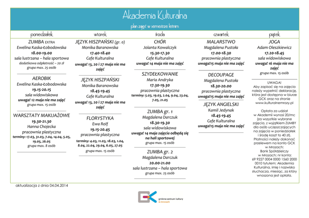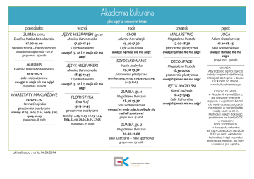 Akademia Kulturalna plan zajęć w semestrze letnim poniedziałek wtorek środa czwartek piątek ZUMBA EXTRA JĘZYK HISZPAŃSKI (gr. 0) CHÓR MALARSTWO JOGA Ewelina Kaska-Łobodowska 18.00-19.00 sala lustrzana – hala sportowa Monika Baranowska 17.40-18.40 Cafe Kulturalna Jolanta Kowalczyk 15.30-17.30 Cafe Kulturalna Magdalena Pustoła 17.00-18.30 pracownia plastyczna Adam Oleszkiewicz 17.20-18.45 sala widowiskowa dodatkowa odpłatność – 20 zł grupa max. 25 osób uwaga! 13, 20 i 27 maja nie ma zajęć uwaga! 14 maja nie ma zajęć uwaga!15 maja nie ma zajęć uwaga! 16 maja nie ma zajęć SZYDEŁKOWANIE DECOUPAGE grupa max. 15 osób Maria Andryka 17.30-19.30 pracownia plastyczna Magdalena Pustoła 18.30-20.00 pracownia plastyczna AEROBIK Ewelina Kaska-Łobodowska 19.15-20.15 sala widowiskowa uwaga! 12 maja nie ma zajęć grupa max. 15 osób WARSZTATY MAKIJAŻOWE 19.30-21.30 Hanna Chojecka pracownia plastyczna terminy: 17.03, 31.03, 7.04, 14.04, 5.05, 19.05, 26.05 grupa max. 8 osób JĘZYK HISZPAŃSKI Monika Baranowska 18.45-19.45 Cafe Kulturalna uwaga! 13, 20 i 27 maja nie ma zajęć FLORYSTYKA Ewa Rolf 19.15-20.45 pracownia plastyczna terminy: 4.03, 11.03, 18.03, 1.04, 8.04, 22.04, 29.04, 6.05, 27.05 grupa max. 15 osób terminy: 5.03, 19.03, 2.04, 9.04, 23.04, 7.05, 21.05 JĘZYK ANGIELSKI ZUMBA gr. 1 Magdalena Darczuk 18.30-19.30 sala widowiskowa uwaga! 14 maja zajęcia odbędą się na hali sportowej grupa max. 15 osób ZUMBA gr. 2 Magdalena Darczuk 20.00-21.00 sala lustrzana – hala sportowa grupa max. 25 osób aktualizacja z dnia 04.04.2014 uwaga!15 maja nie ma zajęć Kamil Jedynak 18.45-19.45 Cafe Kulturalna uwaga!15 maja nie ma zajęć UWAGA! Aby zapisać się na zajęcia należy wypełnić deklarację, która jest dostępna w biurze GCK oraz na stronie www.kulturalnemrozy.pl Opłata za udział w Akademii wynosi 20/mc (za wszystkie wybrane zajęcia, z wyjątkiem ZUMBY dla osób uczęszczających na zajęcia w poniedziałek i środę koszt to 40 zł). Płatności należy dokonać przelewem na konto GCK w Mrozach: Bank Spółdzielczy w Mrozach; nr konta: 69 9227 0004 0000 1560 2000 0010 tytułem: Akademia Kulturalna, imię i nazwisko słuchacza, miesiąc, za który wnoszona jest opłata.