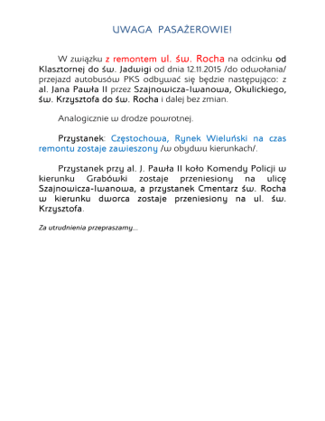 UWAGA PASAŻEROWIE! PASAŻEROWIE! W związku z remontem ul. św. Rocha na odcinku od Klasztornej do św. Jadwigi od dnia 12.11.2015 /do odwołania/ przejazd autobusów PKS odbywać się będzie następująco:: z al. Jana Pawła II przez SzajnowiczaSzajnowicza-Iwanowa, Okulickiego, św. Krzysztofa do św. Rocha i dalej bez zmian. Analogicznie w drodze powrotnej. Przystanek: Przystanek Częstochowa, Rynek Wieluński na czas remontu zostaje zawieszony /w obydwu kierunkach/. Przystanek przy al. J. Pawła II koło Komendy Policji w kierunku Grabówki zostaje przeniesiony na ulicę SzajnowiczaSzajnowicza-Iwanowa, Iwanowa, a przystanek Cmentarz św. Rocha w kierunku dworca zostaje przeniesiony na ul. św. Krzysztofa. Krzysztofa Za utrudnienia przepraszamy… przepraszamy…