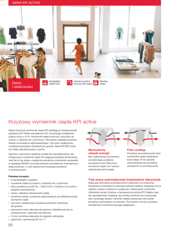 SERIA KPI ACTIVE Zalety i właściwości Kompatybilny System Free Automatyczny powtórny rozruch po zaniku napięcia EC Redukcja hałasu Krzyżowy wymiennik ciepła KPI active Nasze krzyżowe wymienniki ciepła KPI spełniają już dzisiaj przyszłe dyrektywy ErP. Silniki wentylatorów EC umożliwiają zmniejszenie poboru mocy o 51%. Wymiennik ciepła może być wykonany do wyboru z celuloidu lub z aluminium. Wymiennik oddziela powietrze świeże od powietrza odprowadzanego. Tryb pracy obejściowej umożliwia swobodne chłodzenie lub grzanie. Seria KPI E3E może być także zabudowywana w pionie. Zgodnie z warunkami regulacja została tak zaprojektowana, aby zintegrowany wymiennik ciepła DX osiągnął pożądaną temperaturę. Jeśli się to nie stanie, urządzenie zewnętrzne przechodzi wprawdzie w regulację ON/OFF, pozwala jednakże wentylatorom wewnętrznym dalej pracować, w celu zapewnienia świeżego powietrza w pomieszczeniu. Wymuszony odzysk energii: Bez uzależnienia od powietrza zewnętrznego powietrze prowadzone jest stale przez wymiennik ciepła i tym samym odzyskiwana jest energia. Free cooling: Powietrze prowadzone jest obok wymiennika ciepła (obejściem) przez klapę. W ten sposób doprowadzane jest powietrze zewnętrzne do pomieszczenia. Państwa korzyści: ■ 6 typoszeregów urządzeń Tryb pracy automatycznej (nastawienie fabryczne): ■ wymiennik ciepła do wyboru z celuloidu lub z aluminium ■ ilości powietrza od 250 do ~ 2000 m3/h z możliwymi do wyboru sprężami zewnętrznymi ■ ukryte i delikatne odzyskiwanie ciepła ■ powietrze świeże i powietrze odprowadzane są oddzielone przez wymiennik ciepła ■ tryb pracy obejściowej umożliwia swobodne chłodzenie lub grzanie Klapa jest sterowana automatycznie w zależności od zmierzonej temperatury (wewnątrz/na zewnątrz/wartość zadana). Regulacja ma za zadanie uzyskać maksimum wydajności. Wskazówka: swobodne chłodzenie nie jest możliwe w temperaturze poniżej 8ºC! Należy więc tak zaprojektować instalację, aby kanały powietrza nie wykazywały zbyt wysokiego spadku ciśnienia. Należy zaizolować oba kanały powietrza wychodzące na zewnątrz. Przy bardzo zimnym powietrzu zewnętrznym konieczne jest jego podgrzanie. ■ sterowanie może odbywać się zarówno oddzielnie jak też za pośrednictwem jednostki wewnętrznej ■ H-Link umożliwia włączenie do regulacji nadrzędnej ■ zgodność z dyrektywą ErP Lot 11 56 Krzyżowy wymiennik ciepła KPI active KPI-502X3E KPI-802X3E KPI-1002X3E Przepływ powietrza (mały/średni/duży) Model m³ / h 380 / 430 / 500 590 / 700 / 800 740 / 820 / 1.000 Spręż (mały/średni/duży) Pa 100 / 120 / 150 70 / 95 / 125 70 / 85 / 120 Spręż maksymalny (przy nominalnym wydatku powietrza) Pa 235 (dla 500 m³ / h) 125 (dla 800 m³ / h) 125 (dla 1.000 m³ / h) Spadek ciśnienia opcjonalnych filtrów dodatkowych klasy F7 Pa 15 (dla 500 m³ / h) 22 (dla 800 m³ / h) 21 (dla 1000 m³ / h) Wsp. sprawności jawny (stopień prędkości wentylatora: duży) % 75,0 75,0 75,0 Współczynnik sprawności utajony chłodzenie/grzanie (stopień prędkości wentylatora: wielki) % 61,0 / 65,0 62,0 / 65,0 62,0 / 68,0 Kompatybilność z jednostka zewnętrzną SetFree 1,5 HP 2,0 HP 2,5 HP Ograniczenia dla systemów SetFree Maksymalna moc sumaryczna wszystkich modeli KPI ---X3E nie powinna być powyżej 30% mocy jednostki zewnętrznej. Nominalna moc chłodnicza SetFree kW 5,32 (1,81) 7,96 (2,94) 10,83 (3,73) kW 6,92 (2,12) 9,79 (3,49) 12,93 (4,43) kW - RAS-2HVRN2 7,4 (2,9) RAS-2.5HVRN2 9,1 (3,5) kW - 9,7 (3,7) 11,4 (4,4) (tylko przepływ krzyżowy w wymienniku ciepła)5 Nominalna moc grzewcza SetFree (tylko przepływ krzyżowy w wymienniku ciepła)5 Kompatybilność z jednostka zewnętrzną Utopia Nominalna moc chłodnicza Utopia 5 (tylko przepływ krzyżowy w wymienniku ciepła) Nominalna moc chłodnicza Utopia (tylko przepływ krzyżowy w wymienniku ciepła)5 Cecha szczególna: Na wylocie powietrza zabudowany wymiennik ciepła, który może być podłączony do jednej jednostki zewnętrznej. Obudowa/ Konstrukcja Ocynkowany korpus (izolowany), wymiennik krzyżowy, 2x silniki EC wentylatorów, freecooling1 Struktura krzyżowego wymiennika ciepła Celluloid z wymiana wilgotności, filtr powietrza przed wymiennikiem ciepła (klasa G3) Zasilanie 50 Hz V / Ph 230 / 1 230 / 1 230 / 1 Moc pobierana (mała/średnia/duża) W 72 / 99 / 159 122 / 190 / 272 150 / 195 / 335 Prąd pracy A 0,7 1,2 1,5 Bezpiecznik A 10 10 10 Sterowanie2 przewodowy sterownik naścienny PC-ART/PC-ARF Wymiary jedn. wewn. (wys. x szer. x głęb.) mm 330 × 1.630 × 920 385 × 1.710 × 1.015 385 × 2.100 × 1.295 Masa kg 62 69 100 Przyłącze kondensatu (średnica zewn.) mm 32 (średnica wewn. Króćca 25) Przewód cieczowy śr.wewn. (kielich) cal 1 / 4“ (6,35 mm) 1 / 4“ (6,35 mm) 3 / 8“ (9,53 mm) Przewód gazowy śr. wewn. (kielich) cal 1 / 2“ (12,7 mm) 5 / 8“ (15,9 mm) 5 / 8“ (15,9 mm) Poziom hałasu3 (prędkość wentylatora: min/ średni/max) dB(A) 26 / 27 / 29 29 / 30 / 31 31 / 33 / 34 Ograniczenia powietrza zewnętrznego4 °C -5°C ~ +43°C (do -20°C, w przypadku gdy powietrze zewnętrzne jest podgrzewane) 1 Funkcja freecoolingu (w module KPI jest klapa bypass) jest ustawiony fabrycznie i może być wyłączona w razie potrzeby. Wymiennik ciepła KPI może być łatwo zdalnie sterowany przez kabel sterowniczy innego urządzenia. Połączenie z H-Link nie jest to konieczne, natomiast wymiennik ciepła tak. 3 Poziom ciśnienia akustycznego mierzony w odległości 1,5 m poniżej urządzenia (z dołączonymi izolowanymi akustycznie kanałami powietrzna) Standardowe ustawienie ciśnienia, mierzony w pomieszczeniu bezechowym). 4 Ważne jest, aby zapewnić, że mieszanie powietrza zewnętrznego i wylotowego nie odbywało się w warunkach linii nasycenia. Przy bardzo niskich temperaturach zewnętrznych powietrze zewnętrzne przed wymiennikiem ciepła podgrzewać. Ponadto wykorzystywać sygnał wyjścia urzą