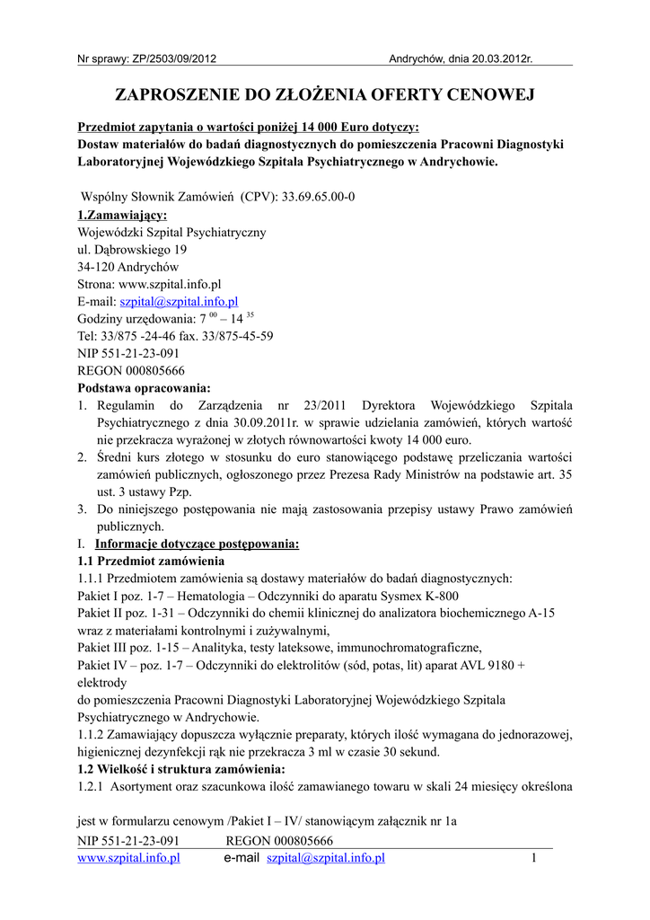 Nr sprawy: ZP/2503/09/2012 Andrychów, dnia 20.03.2012r. ZAPROSZENIE DO ZŁOŻENIA OFERTY CENOWEJ Przedmiot zapytania o wartości poniżej 14 000 Euro dotyczy: Dostaw materiałów do badań diagnostycznych do pomieszczenia Pracowni Diagnostyki Laboratoryjnej Wojewódzkiego Szpitala Psychiatrycznego w Andrychowie. Wspólny Słownik Zamówień (CPV): 33.69.65.00-0 1.Zamawiający: Wojewódzki Szpital Psychiatryczny ul. Dąbrowskiego 19 34-120 Andrychów Strona: www.szpital.info.pl E-mail: [email protected] Godziny urzędowania: 7 00 – 14 35 Tel: 33/875 -24-46 fax. 33/875-45-59 NIP 551-21-23-091 REGON 000805666 Podstawa opracowania: 1. Regulamin do Zarządzenia nr 23/2011 Dyrektora Wojewódzkiego Szpitala Psychiatrycznego z dnia 30.09.2011r. w sprawie udzielania zamówień, których wartość nie przekracza wyrażonej w złotych równowartości kwoty 14 000 euro. 2. Średni kurs złotego w stosunku do euro stanowiącego podstawę przeliczania wartości zamówień publicznych, ogłoszonego przez Prezesa Rady Ministrów na podstawie art. 35 ust. 3 ustawy Pzp. 3. Do niniejszego postępowania nie mają zastosowania przepisy ustawy Prawo zamówień publicznych. I. Informacje dotyczące postępowania: 1.1 Przedmiot zamówienia 1.1.1 Przedmiotem zamówienia są dostawy materiałów do badań diagnostycznych: Pakiet I poz. 1-7 – Hematologia – Odczynniki do aparatu Sysmex K-800 Pakiet II poz. 1-31 – Odczynniki do chemii klinicznej do analizatora biochemicznego A-15 wraz z materiałami kontrolnymi i zużywalnymi, Pakiet III poz. 1-15 – Analityka, testy lateksowe, immunochromatograficzne, Pakiet IV – poz. 1-7 – Odczynniki do elektrolitów (sód, potas, lit) aparat AVL 9180 + elektrody do pomieszczenia Pracowni Diagnostyki Laboratoryjnej Wojewódzkiego Szpitala Psychiatrycznego w Andrychowie. 1.1.2 Zamawiający dopuszcza wyłącznie preparaty, których ilość wymagana do jednorazowej, higienicznej dezynfekcji rąk nie przekracza 3 ml w czasie 30 sekund. 1.2 Wielkość i struktura zamówienia: 1.2.1 Asortyment oraz szacunkowa ilość zamawianego towaru w skali 24 miesięcy określona jest w formularzu cenowym /Pakiet I – IV/ stanowiącym załącznik nr 1a NIP 551-21-23-091 www.szpital.info.pl REGON 000805666 e-mail [email protected] 1 Nr sprawy: ZP/2503/09/2012 Andrychów, dnia 20.03.2012r. 1.2.2 Wykonawcy, z którym zamawiający podpisze umowę nie przysługuje roszczenie o realizację dostaw w wielkości podanej w formularzu cenowym. Dostawy dokonywane w trakcie realizacji umowy mogą różnić się ilościowo od wartości podanej w formularzu cenowym, jednak łączna wartość dostaw nie przekroczy całkowitej wartości oferty wybranego wykonawcy. 1.2.3 Zamawiający zastrzega sobie możliwość niezrealizowania niektórych pozycji asortymentowych co może wynikać z ilości i struktury wykonywanych hospitalizacji w ciągu trwania umowy. 1.3 Warunki dostawy: 1.3.1 Wykonawca będzie dostarczał zamówiony towar w godz. od 700 do 1400 na swój koszt w terminie do trzech dni po uprzednim złożeniu zamówienia w formie telefonicznej lub faksem. Ilości i rodzaj dostarczonego towaru ma być zgodny ze złożonym zamówieniem. 1.3.2 Miejscem dostawy jest Pracownia Diagnostyki Laboratoryjnej Zamawiającego znajdująca się w Andrychowie przy ul. Dąbrowskiego 19. Wykonawca dokona również wniesienia zamówionego towaru do pomieszczenia Pracowni Diagnostyki Laboratoryjnej. 1.3.3 Materiały do badań diagnostycznych będą dostarczane w opakowaniach zawierających nazwę umożliwiającą jednoznaczną identyfikację substancji lub preparatów oraz odpowiedni znak ostrzegawczy. 1.3.4 Wraz z przedmiotem zamówienia Wykonawca będzie dostarczał ulotkę w języku polskim zawierającą wszystkie niezbędne dla bezpośredniego użytkownika informacje. 1.3.5 Karty charakterystyki odczynników, preparatów lub substancji niebezpiecznych należy dostarczyć wraz z odczynnikami przy pierwszej dostawie. 1.3.6 Minimalny termin przydatności dostarczonych odczynników 6 miesięcy licząc od daty dostawy. 1.3.7 Pakiet I – Hematologia – Odczynniki do aparatu Sysmex K-800 - Zapewnienie bezpłatnego uczestnictwa w międzynarodowej kontroli jakości CBC Monitor organizowanej przez firmę R@D Systems – USA, 1.3.8 Pakiet II – Odczynniki do chemii klinicznej do analizatora biochemicznego A-15 wraz z materiałami kontrolnymi i zużywalnymi, - Zapewnienie autoryzowanego serwisu aparatury, - Wymagane jest przedłożenie wraz z ofertą aplikacji odczynników dla wszystkich odczynników do analizatora A-15, - Zapewnienie bezpłatnego uczestnictwa w międzynarodowej kontroli jakości – dołączyć do oferty informator do oferowanych surowic do zewnątrz laboratoryjnej kontroli jakości, - Dołączyć do oferty przykładowe ulotki z wartościami i metodami dla wszystkich materiałów kalibracyjnych i kontrolnych, - Wartości kalibratorów powinny być odniesione do dostępnych materiałów referencyjnych wyższego rzędu. Wartości enzymów muszą być odniesione do najnowszych materiałów referencyjnych Komisji Enzymatycznej IFCC, - Termin ważności dla materiałów kontrolnych i kalibracyjnych min. 18 miesięcy a dla odczynników 6 miesięcy licząc od daty dostawy. NIP 551-21-23-091 www.szpital.info.pl REGON 000805666 e-mail [email protected] 2 Nr sprawy: ZP/2503/09/2012 Andrychów, dnia 20.03.2012r. 1.3.9 Pakiet IV - Odczynniki do elektrolitów (sód, potas, lit) aparat AVL 9180 + elektrody, - Zapewnienie serwisu analizatora AVL 9180 1.4 Obowiązki Wykonawcy: 1.4.1 Dostarczanie zamówionego towaru do pomieszczenia Pracowni Diagnostyki Laboratoryjnej Zamawiającego zgodnie z warunkami zawartymi w ppkt. 1.3.1 do 1.3.9 1.4.2 Utrzymanie niezmienności ceny na dostarczany towar przez cały okres trwania umowy. 2. Cena oferty: Cena oferty ma zawierać koszty: dostaw przedmiotu zamówienia do siedziby Zamawiającego, pozostałe koszty związane z realizacją zamówienia, podatek VAT. 3. Oferty częściowe. Zama