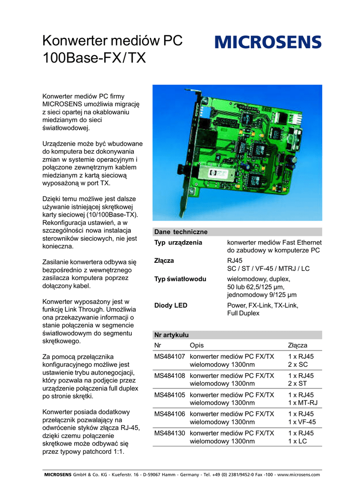 Konwerter mediów PC 100Base-FX/TX Ó×ÝÎÑÍÛÒÍ Konwerter mediów PC firmy MICROSENS umo¿liwia migracjê z sieci opartej na okablowaniu miedzianym do sieci wiat³owodowej. Urz¹dzenie mo¿e byæ wbudowane do komputera bez dokonywania zmian w systemie operacyjnym i po³¹czone zewnêtrznym kablem miedzianym z kart¹ sieciow¹ wyposa¿on¹ w port TX. Dziêki temu mo¿liwe jest dalsze u¿ywanie istniej¹cej skrêtkowej karty sieciowej (10/100Base-TX). Rekonfiguracja ustawieñ, a w szczególnoci nowa instalacja sterowników sieciowych, nie jest konieczna. Zasilanie konwertera odbywa siê bezporednio z wewnêtrznego zasilacza komputera poprzez do³¹czony kabel. Konwerter wyposa¿ony jest w funkcjê Link Through. Umo¿liwia ona przekazywanie informacji o stanie po³¹czenia w segmencie wiat³owodowym do segmentu skrêtkowego. Dane techniczne Typ urz¹dzenia konwerter mediów Fast Ethernet do zabudowy w komputerze PC Z³¹cza RJ45 SC / ST / VF-45 / MTRJ / LC Typ wiat³owodu wielomodowy, duplex, 50 lub 62,5/125 µm, jednomodowy 9/125 µm Diody LED Power, FX-Link, TX-Link, Full Duplex Nr artyku³u Nr Opis Z³¹cza Za pomoc¹ prze³¹cznika konfiguracyjnego mo¿liwe jest ustawienie trybu autonegocjacji, który pozwala na podjêcie przez urz¹dzenie po³¹czenia full duplex po stronie skrêtki. MS484107 konwerter mediów PC FX/TX wielomodowy 1300nm 1 x RJ45 2 x SC MS484108 konwerter mediów PC FX/TX wielomodowy 1300nm 1 x RJ45 2 x ST MS484105 konwerter mediów PC FX/TX wielomodowy 1300nm 1 x RJ45 1 x MT-RJ Konwerter posiada dodatkowy prze³¹cznik pozwalaj¹cy na odwrócenie styków z³¹cza RJ-45, dziêki czemu po³¹czenie skrêtkowe mo¿e odbywaæ siê przez typowy patchcord 1:1. MS484106 konwerter mediów PC FX/TX wielomodowy 1300nm 1 x RJ45 1 x VF-45 MS484130 konwerter mediów PC FX/TX wielomodowy 1300nm 1 x RJ45 1 x LC Ó×ÝÎÑÍÛÒÍ Ù³¾Ø ú ݱò ÕÙ ó Õ«»º»®-¬®ò ïê ó Üóëçðêé Ø¿³³ ó Ù»®³¿²§ ó Ì»´ò õìç øð÷ îíèïñçìëîóð Ú¿¨ óïðð ó ©©©ò³·½®±-»²-ò½±³