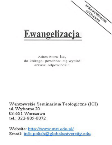 Ewangelizacja Adres biura la, do którego powinno się wysłać arkusz odpowiedzi: Jeśli powyżej nie ma adresu, wyślij arkusz odpowiedzi na adres: INTERNATIONAL CORRESPONDENCE INSTITUfE Chaussee de Waterloo, 45 1640 Rhode-Saint-Genese (Brussels) BELGIA CL 5150 - Sprawozdanie studenta - strona 2 Wskazówki Po zapoznaniu się z lekcjami I - 4, powinieneś udzielić odpowiedzi na pytania zawarte w pierwszej części tej wkładki "Wymagania dla lekcji l - 4 ", Swoje odpowiedzi zaznacz w arkuszu odpowiedzi nr l, Po zapoznaniu się z lekcjami 5 - 8, powinieneś udzielić odpowiedzi na pytania zawarte w drugiej części tej wkładki. Swoje odpowiedzi zaznacz w arkuszu odpowiedzi nr 2, Po wypełnieniu arkusza odpowiedzi prześlij go do instruktora ICl. Nie przesyłaj tego sprawozdania, Zapoznaj się z przykładami znajdującymi się na początku arkusza odpowiedzi, Przykłady te wyjaśniają, w jaki sposób należy wypełniać arkusz, Ewangelizacja - strona 3 CZĘŚĆ l SPRAWOZDANIE STUDENTA Pytania do lekcji I - 4 Przy każdym pytaniu upewnij się, czy numer majdujący się w polu w arkuszu odpowiedzi odpowiada numerowi pytania w tej wkładce. PRAWDA CZY FAŁSZ Poniższe stwierdzenia są prawdziwe Jeżeli stwierdzenie jest: lub falszywe. PRAWDZIWE - zaczernij pole [}] FAŁSZYWE - zaczernij pole [li] l Bóg przestał kochać człowieka, gdy on zgrzeszył. 2 Paweł opowiadał o Chrystusie pomimo tego, że omaczało to cierpienie. 3 Moc świadczenia pochodzi z Ducha Świętego. 4 Tylko niektórzy chrześcijanie mają udział w budowaniu Kościoła chrześcijańskiego. 5 Zanim Chrystus powróci, dobra nowina musi dotrzeć wszędzie. 6 Paweł dzielił się dobrą nowiną nawet wtedy, gdy był w więzremu, 7 Jeśli ludzie znajdą Chrystusa, powinni żyć nadaltak,jak żyli do tej pory. CL 5150 ~ Sprawozdanie studenta - strona 4 WYBÓR Każde z poniższych pytań ma tylko jedną prawidiową odpowiedź. Wybierz wlaściwą. W arkuszu odpowiedzi zaczernij pole zawierające odpowiednią literę. 8 Jedynym celem Jezusa w Jego posłannictwie by/o: a) pomóc ludziom, którzy Go najbardziej potrzebowali. b) wykonać pracę i wolę Boga Ojca. 9 Rozkaz Jezusa wymagający pójścia wszędzie, do wszystkich ludzi, głoszenie dobrej nowiny - Ewangelii był: a) tylko do Jego uczniów. b) do księży i misjonarzy. c) do wszystkich wierzących, którzy Go kochają. 10 Co Jezus miał na myśli mówiąc: "Jak mnie poslaleś na świat, tak i ja poslalem ich na świat". a) posłał nas na cały świat z taką samą misją; aby uczynić ludzi wolnymi. b) posłał nas na cały świat, abyśmy rządzili i sądzili tych, którzy zgrzeszyli. 11 Jezus powiedział nam, abyśmy byli świadkami: a) tylko w swoim kraju. b) dla ludzi, których lubimy. 12 Jezus powiedział swoim uczniom, aby zaczekali, aż będą przygotowani do świadczenia o Nim, gdyż powinni: a) zapamiętać tekst Pisma Świętego. b) lepiej Go poznać. c) obserwować innych współpracowników. Ewangelizacja - strona 5 13 Abyśmy mogli zwalczać diabla i nieść dobrą nowinę, musimy zaufać: a) naszej sile i mocy. b) Imieniu Jezusa i Słowu Boga. 14 Gdy mówimy, że chrześcijaniejak sól dodają smaku, to oznacza to, że: a) zabezpieczją oni od zła. b) pomagają innym znaleźć sens życia poprzez Chrystusa. 15 Być zaangażowanym oznacza: a) poświęcić się czemuś całkowicie. b) z/ożyć obietnicę, że będziesz próbować coś zrobić. 16 Nasze zaangażowanie w ewangelizację indywidualną oznacza, że każdy z nas jest odpowiedzialny za: a) powiedzenie rodakom o Chrystusie i pozwolenie innym. aby robić to samo. b) powiedzenie najpierw rodakom, a następnie niesienie dobrej nowiny innym ludziom. 17 Osoba wysłucha cię chętniej, gdy mówiąc o Chrystusie: a) daszjej nowe wyobrażenia o religii. b) powieszjej, żejej wierzenia są złe. c) wskażeszjej, że Chrystusjest najlepszą drogą. 18 Które zdanie opisuje metodę Jezusadzielenia się z innymi? al Szedł wszędzie. dzieląc się z tymi, którzy Go potrzebowali. CL 5150 - Sprawozdanie studenta - strona 6 b) Czekał na ludzi, aby do Niego przyszli. 19 Jaki jest główny cel niesienia Chrystusa tym, którzy Go nie znają? a) Bóg będzie z nas zadowolony. b) ich życie zmieni się. PYTANIA OGÓLNE Lekcja I - 3 Jeżeli twoją odpowiedzią TAK NIE na poniższe pytania jest: - zamaluj pole - zamaluj pole GJ [li] 20 Czy uważnie przeczytałeś Lekcje I - 4? 21 Czy zrobiłeś wszystkie ..Zadania dla ciebie" w lekcjach l - 2? 22 Czy zrobiłeś wszystkie ..Zadania dla ciebie" w lekcjach 3 - 4? 23 Czy sprawdzałeś swoje odpowiedzi z odpowiedziami znajdującymi się na końcu każdej lekcji? 24 Czy przejrzałeś ponownie wszystkie cele podane w lekcjach, aby sprawdzić. czy osiągnąłeś to, co one zakładają? Koniec pytań do lekcji I - 4. Prześlij arkusz odpowiedzi nr l do instruktora le/. Kontynuuj naukę przerabiając lekcję 5 z podręcznika kursu. Ewangelizacja. strona 7 CZĘŚĆ 2 SPRAWOZDANIE STUDENTA Pytania do lekcji 5 - 8 Przy każdym pytaniu upewnij ·się. czy numer znajdujący się przy polach arkusza odpowiedzi odpowiada numerowi pytGIl w tej wkladce. PRA WDA - FAŁSZ Poniższe stwierdzenia są prawdziwe lub falszywe. Jeżeli stwierdzenie jest: PRAWDZIWE - zaczernij pole FAŁSZYWE - zaczernij pole 0 rn l Udział Boga w ewangelizacji to sianie ziarna .. 2 Udział Ducha Świętego w ewangelizacji to udowodnienie grzechu. 3 Jeśli osoba jest związana z religią swojej rodziny, chrześcijanin nie powinien próbować dawać jej świadectwa o Chrystusie. 4 Chrześcijanin może nieść dobrą nowinę ludziom. którzy są starsi lub zajmują wyższą pozycję od niego. 5 Aby zdobywać ludzi dla Chrystusa, powinniśmy mówić do nich tak, aby mogli nas zrozumieć. 6 Nie ma znaczenia, jakie zastosujemy niesieniu dobrej nowiny. podejście przy 7 Indywidualny ewangelista pracuje po to, aby być nagrodzony. CL 5150 - Sprawazdanie studenta - strona 8 WYBÓR Każde z poniższych pytań ma tylko 