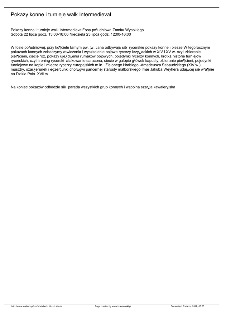 Pokazy konne i turnieje walk Intermedieval Pokazy konne i turnieje walk IntermedievalFosa po³udniowa Zamku Wysokiego Sobota 22 lipca godz. 13:00-18:00 Niedziela 23 lipca godz. 12:00-16:00 W fosie po³udniowej, przy ko¶ciele farnym pw. ¦w. Jana odbywaj± siê rycerskie pokazy konne i piesze.W tegorocznym pokazach konnych zobaczymy æwiczenia i wyszkolenie bojowe rycerzy krzy¿ackich w XIV i XV w. czyli zbieranie pier¶cieni, ciêcie ³óz, pokazy uje¿d¿enia rumaków bojowych, pojedynki rycerzy konnych, krótk± historiê turniejów rycerskich, czyli trening rycerski atakowanie saracena, ciecie w galopie g³ówek kapusty, zbieranie pier¶cieni, pojedynki turniejowe na kopie i miecze rycerzy europejskich m.in.. Zielonego Hrabiego -Amadeusza Sabaudzkiego (XIV w.), musztry, szar¿erunek i egzercunki chor±gwi pancernej starosty malborskiego Imæ Jakuba Weyhera udaj±cej siê w³a¶nie na Dzikie Pola XVII w. Na koniec pokazów odbêdzie siê parada wszystkich grup konnych i wspólna szar¿a kawaleryjska http://www.malbork.pl/um/ - Malbork, Urz±d Miasta Page created by www.kraszewski.pl Generated: 8 March, 2017, 06:55