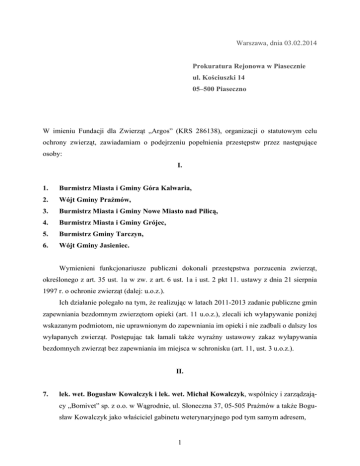 Warszawa, dnia 03.02.2014 Prokuratura Rejonowa w Piasecznie ul. Kościuszki 14 05–500 Piaseczno W imieniu Fundacji dla Zwierząt „Argos” (KRS 286138), organizacji o statutowym celu ochrony zwierząt, zawiadamiam o podejrzeniu popełnienia przestępstw przez następujące osoby: I. 1. Burmistrz Miasta i Gminy Góra Kalwaria, 2. Wójt Gminy Prażmów, 3. Burmistrz Miasta i Gminy Nowe Miasto nad Pilicą, 4. Burmistrz Miasta i Gminy Grójec, 5. Burmistrz Gminy Tarczyn, 6. Wójt Gminy Jasieniec. Wymienieni funkcjonariusze publiczni dokonali przestępstwa porzucenia zwierząt, określonego z art. 35 ust. 1a w zw. z art. 6 ust. 1a i ust. 2 pkt 11. ustawy z dnia 21 sierpnia 1997 r. o ochronie zwierząt (dalej: u.o.z.). Ich działanie polegało na tym, że realizując w latach 2011-2013 zadanie publiczne gmin zapewniania bezdomnym zwierzętom opieki (art. 11 u.o.z.), zlecali ich wyłapywanie poniżej wskazanym podmiotom, nie uprawnionym do zapewniania im opieki i nie zadbali o dalszy los wyłapanych zwierząt. Postępując tak łamali także wyraźny ustawowy zakaz wyłapywania bezdomnych zwierząt bez zapewniania im miejsca w schronisku (art. 11, ust. 3 u.o.z.). II. 7. lek. wet. Bogusław Kowalczyk i lek. wet. Michał Kowalczyk, wspólnicy i zarządzający „Bomivet” sp. z o.o. w Wągrodnie, ul. Słoneczna 37, 05-505 Prażmów a także Bogusław Kowalczyk jako właściciel gabinetu weterynaryjnego pod tym samym adresem, 1 8. lek. wet. Wojciech Kowalczyk, kierujący zarejestrowanym gabinetem weterynaryjnym „Endovet” w Warszawie ul. Górska 30/7, 9. Paweł Studziński, firma kurierska „Feniks”, Tarczyn Kopana, ul. Lipowa 19, 10. Zbigniew Jaworski, ul. Krótka 3, 05-870 Błonie. Wymienieni przedsiębiorcy wyłapywali bezdomne zwierzęta na zlecenie gmin i nie za- pewniali im właściwej opieki, nie prowadząc schronisk dla zwierząt ani nie przekazując ich do schronisk dla zwierząt. Łamali w ten sposób zakaz sformułowany w art. 11, ust. 3 u.o.z. Ponadto lek. wet. Bogusław Kowalczyk i Michał Kowalczyk utrzymywali liczne wyłapane zwierzęta na swojej posesji w Wągrodnie (gm. Prażmów) przy ul. Słonecznej 37, w niewłaściwych warunkach bytowania, tj. w stanie rażącego zaniedbania, co stanowi przestępstwo opisane w art. 35 ust. 1a w zw. z art. 6 ust. 1a i ust. 2 pkt 10 ustawy z dnia 21 sierpnia 1997 r. o ochronie zwierząt. Łącznie działania wymienionych osób w latach 2011-2013 objęły 925 zwierząt (917 psów i 8 kotów), których los jest w większości nieznany, pomimo że opieka nad nimi została sfinansowana z publicznych pieniędzy w łącznej sumie 915.356 zł. W szczególności zaś, jak wynika z zebranych przez nas informacji: ad 1) Burmistrz Miasta i Gminy Góra Kalwaria zawierał w latach 2011-2012 umowy z Gabinetem Weterynaryjnym B. Kowalczyk, a w 2013 ze spółką „Bomivet” z Wągrodna o wyłapywanie bezdomnych zwierząt i zapewnianie im opieki. Wyłapano: rok 2011: 76 psów za kwotę 53.813 zł rok 2012: 77 psów za kwotę 95.858 zł rok 2013: 58 psów za kwotę 106.000 zł ad 2) Wójt Gminy Prażmów zawierał w latach 2012 umowy z Pawłem Studzińskim z Tarczyna a także ze spółką „Bomivet” z Wągrodna o wyłapywanie bezdomnych zwierząt i zapewnianie im opieki. Wyłapano: rok 2012: 12 psów za kwotę 21.200 zł zaś w 2013 r. z samą spółką „Bomivet” z Wągrodna: rok 2013: 35 psów za kwotę 2 30.000 zł ad 3) Burmistrz Miasta i Gminy Grójec zawierał w 2011 r. umowy Gabinetem Weterynaryjnym B. Kowalczyk z Wągrodna a także z Pawłem Studzińskim z Tarczyna, o wyłapywanie bezdomnych zwierząt i zapewnianie im opieki. Wyłapano łącznie: rok 2011: 74 psy za kwotę 67.294 zł zaś w latach 2012-2013 ze spółką „Bomivet” z Wągrodna: rok 2012: 138 psów za kwotę 109.486 zł rok 2013: 153 psów za kwotę 101.650 zł ad 4) Burmistrz Miasta i Gminy Nowe Miasto nad Pilicą zawierał umowy ze Zbigniewem Jaworskim z Błonia. Wyłapano: rok 2011: 28 psów za kwotę 18.500 zł rok 2012: 24 psy 18.000 zł za kwotę zaś w 2013 r. z Wojciechem Kowalczykiem, gabinet wet. „Endovet” w Warszawie: rok 2013: 49 psów za kwotę 75.130 zł ad 5) Burmistrz Gminy Tarczyn zawarł w 2011 r. umowę z Pawłem Studzińskim z Tarczyna. Wyłapano: rok 2011: 57 psów za kwotę 33.825 zł zaś w latach 2012-2013 ze spółką „Bomivet” z Wągrodna: rok 2012: 3 koty, 34 psy za kwotę 60.000 zł rok 2013: 5 kotów, 58 psy za kwotę 75.000 zł ad 6) Wójt Gminy Jasieniec zawierał w 2011 r. umowy z Gabinetem Weterynaryjnym B. Kowalczyk z Wągrodna oraz Pawłem Studzińskim z Tarczyna o wyłapywanie bezdomnych zwierząt i zapewnianie im opieki. Wyłapano łącznie: rok 2011: 13 psów za kwotę 12.100 zł w 2012 r. z Gabinetem Weterynaryjnym B. Kowalczyk z Wągrodna : rok 2012: 21 psów za kwotę 23.500 zł w 2013 r. z Wojciechem Kowalczykiem, gabinet wet. „Endovet” w Warszawie: rok 2013: 10 psów za kwotę 14.000 zł ad 7) Zwierzęta wyłapane przez Wojciecha, Bogusława i Michała Kowalczyków, utrzymywane na terenie posesji w Wągrodnie, były ofiarami znęcania się nad nimi poprzez utrzymywanie w niewłaściwych warunkach bytowania, co potwierdzają oświadczenia naocznych 3 świadków. Od listopada 2013 r. osoby te systematycznie odwiedzają to miejsce jako wolontariusze, usiłując pomóc zgromadzonym tam zwierzętom. Świadkami tymi są: • A______ K______ __________________ • E______ K______ __________________ • A______ K______ __________________ • K______ M______ __________________ • A______ S______ __________________ • G______ Z______ __________________ • M______ Z______ __________________ • J______ Z______ __________________ • Ł______ E______ __________________ • M______ P______ __________________ • K______ U______ __________________ • D______ M______ __________________ W sprawie niniejszej, Fundacja dla Zwierząt „Argos” wykonywać będzie prawa pokrzywdzonego, na podstawie art. 39 w zw. z art. 40 ustawy z