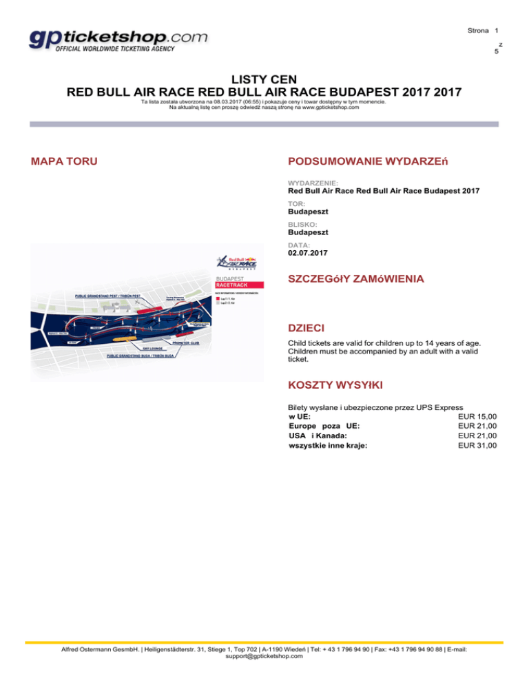 Strona 1 5 LISTY CEN RED BULL AIR RACE RED BULL AIR RACE BUDAPEST 2017 2017 Ta lista została utworzona na 08.03.2017 (06:55) i pokazuje ceny i towar dostępny w tym momencie. Na aktualną listę cen proszę odwiedź naszą stronę na www.gpticketshop.com MAPA TORU PODSUMOWANIE WYDARZEń WYDARZENIE: Red Bull Air Race Red Bull Air Race Budapest 2017 TOR: Budapeszt BLISKO: Budapeszt DATA: 02.07.2017 SZCZEGółY ZAMóWIENIA DZIECI Child tickets are valid for children up to 14 years of age. Children must be accompanied by an adult with a valid ticket. KOSZTY WYSYłKI Bilety wysłane i ubezpieczone przez UPS Express w UE: EUR 15,00 Europe poza UE: EUR 21,00 USA i Kanada: EUR 21,00 wszystkie inne kraje: EUR 31,00 Alfred Ostermann GesmbH. | Heiligenstädterstr. 31, Stiege 1, Top 702 | A-1190 Wiedeń | Tel: + 43 1 796 94 90 | Fax: +43 1 796 94 90 88 | E-mail: [email protected] z Strona 2 5 BILETY NA TRYBUNę Tribüne BUDA Sob./Ndz. EUR 50,00 Tribüne BUDA Dziecko zniżka Sob./Ndz. EUR 25,00 Tribüne BUDA Ndz. EUR 40,00 Tribüne BUDA Dziecko zniżka Ndz. EUR 20,00 Tribüne BUDA Sob. EUR 30,00 Tribüne BUDA Dziecko zniżka Sob. EUR 15,00 Tribüne PEST Sob./Ndz. EUR 50,00 Tribüne PEST Dziecko zniżka Sob./Ndz. EUR 25,00 Tribüne PEST Ndz. EUR 40,00 Tribüne PEST Dziecko zniżka Ndz. EUR 20,00 Tribüne PEST Sob. EUR 30,00 EUR 15,00 Tribüne PEST Dziecko zniżka Sob. Wszystkie ceny dodatkowo 5% opłaty manipulacyjnej BILETY VIP Sky Lounge Sky Lounge Sob./Ndz. EUR 990,00 Sky Lounge Dziecko zniżka Sob./Ndz. EUR 495,00 Sky Lounge Ndz. EUR 890,00 Sky Lounge Dziecko zniżka Ndz. EUR 445,00 Sky Lounge Sob. EUR 490,00 Sky Lounge Dziecko zniżka Sob. EUR 245,00 Promoter Club Sob./Ndz. EUR 390,00 Promoter Club Dziecko zniżka Sob./Ndz. EUR 195,00 Promoter Club Ndz. EUR 350,00 Promoter Club Dziecko zniżka Ndz. EUR 175,00 Promoter Club Sob. EUR 250,00 EUR 125,00 Promoter Club Promoter Club Dziecko zniżka Sob. Wszystkie ceny dodatkowo 5% opłaty manipulacyjnej Alfred Ostermann GesmbH. | Heiligenstädterstr. 31, Stiege 1, Top 702 | A-1190 Wiedeń | Tel: + 43 1 796 94 90 | Fax: +43 1 796 94 90 88 | E-mail: [email protected] z Strona 3 5 Wszystkie ceny dodatkowo 5% opłaty manipulacyjnej BILETY VIP BILETY VIP Wszystkie ceny dodatkowo 5% opłaty manipulacyjnej Alfred Ostermann GesmbH. | Heiligenstädterstr. 31, Stiege 1, Top 702 | A-1190 Wiedeń | Tel: + 43 1 796 94 90 | Fax: +43 1 796 94 90 88 | E-mail: [email protected] z Strona 4 5 Wszystkie ceny dodatkowo 5% opłaty manipulacyjnej FORMULARZ ZAMóWIENIA FAX FAX NR: +43 1 7969490-88 Proszę wypełnij ten formularz w całości i DRUKOWANYMI LITERAMI. Imię i nazwisko: firma: adres: Kraj / Kod pocztowy / Miasto: E-Mail: Tel: Zamawiam bilety na Red Bull Air Race Red Bull Air Race Budapest 2017 (2017-07-02) Przeczytałem i zaakceptowałem ogólne warunki firmy Ilość Cena za sztukę EUR Total EUR plus 5% opłaty manipulacyjne z kosztami wysyłki Suma Metoda płatności Przelew bankowy Karta kredytowa: VISA | Mastercard | Diners Club Posiadacz karty: Numer karty: Ważna do: Kod CVV: OGóLNE WARUNKI FIRMY Ważne od: 01. 01. 2010 1.Ogólne Warunki Sprzedaży Ogólne warunki firmy są ważne na sprzedaż przez przedsiębiorstwo A. Ostermann Gmbh (dalej określone jako gpticketshop.com). Wszelkie różniące się warunki klientów mogą być tylko ustalone na piśmie. Zaznaczając pole przy końcu zamówienia “Z moim zamówieniem akceptuję warunki sprzedaży firmy gpticketshop.com”, kupujący akceptuje nasze warunki sprzedaży i jest do nich zobowiązany. Kupując bilet, klient akceptuje warunki organizatora. Nasz wybór artykułów w sprzedaży nie jest zobowiązujący i może ulec zmianom bez uprzedniego powiadomienia. Zamówenie dokonane przez kogokolwiek w wieku od 18 lat tworzy umowę sprzedaży na ogólnych warunkach sprzedaży naszej firmy. Automatyczne potwierdzenie przyjęcia twojego zamówienia, wysłane przez pocztę elektroniczną nie oznacza zawarcia kontraktu między sprzedającym i kupującym. Umowa sprzedaży staje się ważna po wysłaniu rachunku do klienta. Klient musi w pełni i poprawnie wypełnić formularz. Jakakolwiek szkowa wynikająca z błędnego lub niekompletnego wypełnienia formularza nie zostanie pokryta przez gpticketshop.com. Jako, że od naszej firmy nie zależą wszystkie elementy usługi, którą osobiście dostrczamy do klienta, jesteśmy zmuszeni współpracować z innymi kompetentnymi trzecimi firmami. 2. Zamówienie Umowa sprzedaży upoważnia się w następujący sposób: 1)Na stronie proszę wybierz bilety i ich ilość (+/-), którą życzysz sobie kupić i kliknij na przycisk obok “Zamów” . 2) Następnie wybierz swój region i określ metodę płatniczą i kliknij na przycisk “Kontynuuj zamówienie” . 3)Proszę sprawdź zawartość swojej karty zakupowej. 4)Następnie wprowadź wymagane dane w polu “Szczegóły zamówienia”. Proszę pamiętaj, że wyślemy zamówione i opłacone bilety na adres wskazany tutaj. 5)Kiedy przeczytasz i zaakceptujesz Ogólne Warunki Sprzedaży Firmy i zgodę na przetwarzanie danych osobowych, zaznacz odpowiednie pole i wyślij zamówienie, będące dla nas ofertą kontraktu. Alfred Ostermann GesmbH. | Heiligenstädterstr. 31, Stiege 1, Top 702 | A-1190 Wiedeń | Tel: + 43 1 796 94 90 | Fax: +43 1 796 94 90 88 | E-mail: [email protected] z Strona 5 5 5)Kiedy przeczytasz i zaakceptujesz Ogólne Warunki Sprzedaży Firmy i zgodę na przetwarzanie danych osobowych, zaznacz odpowiednie pole i wyślij zamówienie, będące dla nas ofertą kontraktu. 6)Następnie kontrakt zostanie ostatecznie zawarty przez nasze potwierdzenie emailem. W pełni opłacone bilety zostaną wysłane przez UPS, na około 2 tygodnie przed wydażeniem. Czasami z powodów nieprzewidzianych wypadków będziesz musiał odebrać bilety na torze. Oczywiście opłata za przesyłkę zostanie zwrócona. 3. Język kontraktu Językami kontraktu są niemiecki i angielski. Informacja, serwis obsługi i skargi będą takż