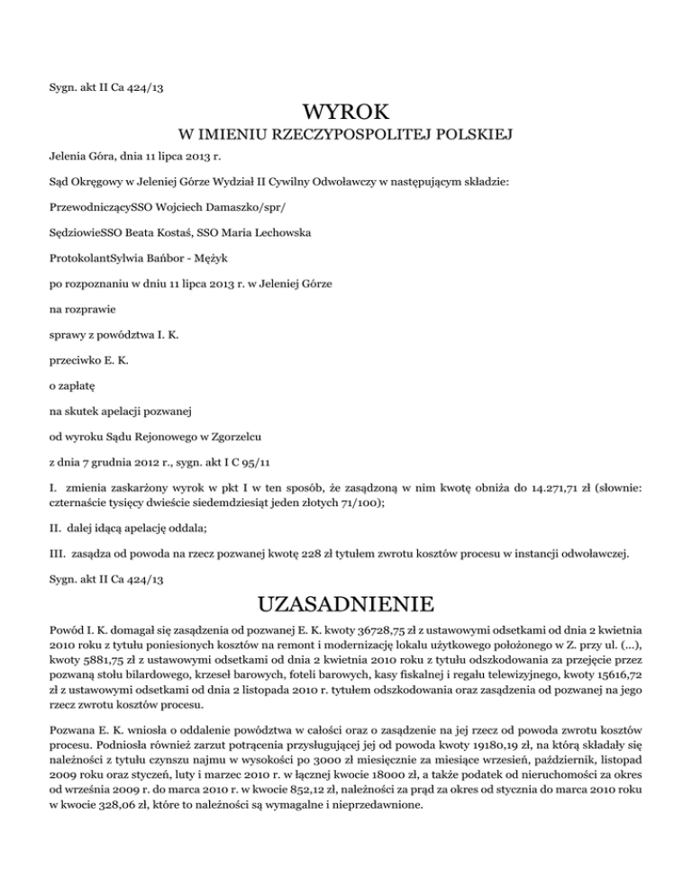 Sygn. akt II Ca 424/13 WYROK W IMIENIU RZECZYPOSPOLITEJ POLSKIEJ Jelenia Góra, dnia 11 lipca 2013 r. Sąd Okręgowy w Jeleniej Górze Wydział II Cywilny Odwoławczy w następującym składzie: PrzewodniczącySSO Wojciech Damaszko/spr/ SędziowieSSO Beata Kostaś, SSO Maria Lechowska ProtokolantSylwia Bańbor - Mężyk po rozpoznaniu w dniu 11 lipca 2013 r. w Jeleniej Górze na rozprawie sprawy z powództwa I. K. przeciwko E. K. o zapłatę na skutek apelacji pozwanej od wyroku Sądu Rejonowego w Zgorzelcu z dnia 7 grudnia 2012 r., sygn. akt I C 95/11 I. zmienia zaskarżony wyrok w pkt I w ten sposób, że zasądzoną w nim kwotę obniża do 14.271,71 zł (słownie: czternaście tysięcy dwieście siedemdziesiąt jeden złotych 71/100); II. dalej idącą apelację oddala; III. zasądza od powoda na rzecz pozwanej kwotę 228 zł tytułem zwrotu kosztów procesu w instancji odwoławczej. Sygn. akt II Ca 424/13 UZASADNIENIE Powód I. K. domagał się zasądzenia od pozwanej E. K. kwoty 36728,75 zł z ustawowymi odsetkami od dnia 2 kwietnia 2010 roku z tytułu poniesionych kosztów na remont i modernizację lokalu użytkowego położonego w Z. przy ul. (...), kwoty 5881,75 zł z ustawowymi odsetkami od dnia 2 kwietnia 2010 roku z tytułu odszkodowania za przejęcie przez pozwaną stołu bilardowego, krzeseł barowych, foteli barowych, kasy fiskalnej i regału telewizyjnego, kwoty 15616,72 zł z ustawowymi odsetkami od dnia 2 listopada 2010 r. tytułem odszkodowania oraz zasądzenia od pozwanej na jego rzecz zwrotu kosztów procesu. Pozwana E. K. wniosła o oddalenie powództwa w całości oraz o zasądzenie na jej rzecz od powoda zwrotu kosztów procesu. Podniosła również zarzut potrącenia przysługującej jej od powoda kwoty 19180,19 zł, na którą składały się należności z tytułu czynszu najmu w wysokości po 3000 zł miesięcznie za miesiące wrzesień, październik, listopad 2009 roku oraz styczeń, luty i marzec 2010 r. w łącznej kwocie 18000 zł, a także podatek od nieruchomości za okres od września 2009 r. do marca 2010 r. w kwocie 852,12 zł, należności za prąd za okres od stycznia do marca 2010 roku w kwocie 328,06 zł, które to należności są wymagalne i nieprzedawnione. Sąd Rejonowy w Zgorzelcu zaskarżonym wyrokiem z dnia 7 grudnia 2012 roku powództwo to uwzględnił częściowo i zasądził E. K. na rzecz powoda I. K. kwotę 27053,82 zł z ustawowymi odsetkami od dnia 31 października 2010 roku do dnia zapłaty, dalej idące powództwo oddalił, koszty procesu wzajemnie zniósł i nakazał pozwanej aby uiściła na rzecz Skarbu Państwa – Sądu Rejonowego w Zgorzelcu kwotę 493,20 zł tytułem brakującej części kosztów za opinię biegłego tymczasowo wydatkowanych przez Skarb Państwa. Powyższe rozstrzygnięcie poprzedzone zostało następującymi ustaleniami faktycznymi. Na podstawie ustnej umowy I. K. wynajął od marca 2009 roku od E. K. lokal użytkowy stanowiący jej własność położony w Z. przy ul. (...) z przeznaczeniem na prowadzenie działalności gospodarczej w postaci klubu bilardowego oraz baru. Miesięczny czynsz ustalono w kwocie po 2500 zł płatny gotówką. Po objęciu lokalu w najem I. K. w marcu 2009 roku rozpoczął za zgodą i wiedzą pozwanej remont wynajętego lokalu w celu przystosowania go do wymogów sanepidu związanych z prowadzeniem lokalu gastronomicznego. Uprzednio lokal ten stanowił jedno duże pomieszczenie bez wewnętrznych ścian działowych i był w nim prowadzony sklep z częściami samochodowymi. W lokalu nie było toalety. Z kolei w dniu 1 września 2009 roku E. K. zawarła z I. K. pisemną umowę najmu na ten lokal użytkowy. Powód zobowiązał się płacić jej czynsz najmu w wysokości 3000 zł brutto miesięcznie, płatny z góry w terminie do 7ego każdego miesiąca do rąk pozwanej, a także do zapłaty dodatkowych świadczeń w postaci części podatku od nieruchomości zgodnie z zajmowaną powierzchnią oraz kosztów zużycia energii elektrycznej i wody na podstawie odczytów z podliczników oraz kosztów ogrzewania zajmowanej powierzchni, które to koszty centralnego ogrzewania miały być liczone wg metrów zajmowanej powierzchni. Najemca miał prawo do korzystania z pomieszczenia socjalnego oraz toalety dla personelu w części wspólnej z wynajmującym. Umowa została zawarta na czas nieokreślony z zastrzeżeniem możliwości rozwiązania przez każdą ze stron umowy za trzymiesięcznym pisemnym wypowiedzeniem, oraz z prawem wynajmującego do rozwiązania umowy bez wypowiedzenia w razie zalegania przez najemcę z zapłatą należności za najem za jeden pełen miesiąc lub dopuszczenia się naruszenia innych istotnych postanowień umowy. W pkt 6 umowy uzgodniono, iż najemca w chwili wygaśnięcia umowy zobowiązany jest zwrócić część lokalu użytkowego wraz z urządzeniami w stanie niepogorszonym, z zastrzeżeniem, że wszelkie remonty i modernizacje dokonane w trakcie umowy najmu nie mogą być usunięte bez uzgodnienia z wynajmującym. Remont lokalu prowadzony przez I. K. trwał do grudnia 2009 roku i klub bilardowy z barem został otwarty w dniu 25 grudnia 2009 r. Powód wykonał w lokalu malowanie, instalację wodną i kanalizacyjną, nową instalację elektryczną podtynkową i oświetlenie lokalu, wentylację, podłogi wyłożył kafelkami i położył na niej wykładzinę, zainstalował w lokalu system alarmowy. Po postawieniu ścianek działowych wyodrębnił 3 pomieszczenia w postaci sali konsumpcyjnej z zapleczem, baru z ladą i toaletę. Wszystkie te nakłady miały charakter nakładów koniecznych a nakłady w postaci wykonania węzła sanitarnego, pomieszczenia magazynowego, położenia na ścianach regipsów i inne prace remontowe miały charakter ulepszający. Wartość poczynionych przez I. K. w nakładów w okresie od 1 marca 2009 r do grudnia 2009 r. według poziomu cen materiałów i kosztów robocizny w stawce 14,99 zł za roboczogodzinę z IV kwartału 2009 r. ust