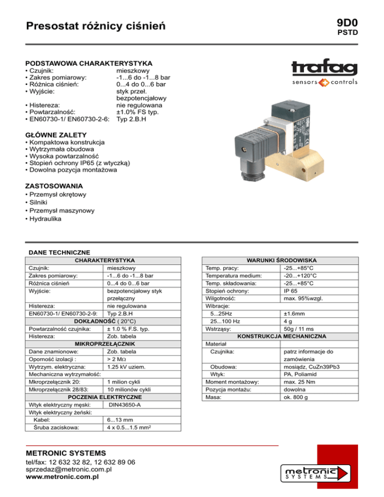9D0 Presostat ró¿nicy ciœnieñ PSTD PODSTAWOWA CHARAKTERYSTYKA • Czujnik: mieszkowy • Zakres pomiarowy: -1...6 do -1...8 bar • Ró¿nica ciœnieñ: 0...4 do 0...6 bar • Wyjœcie: styk prze³. bezpotencja³owy • Histereza: nie regulowana • Powtarzalnoœæ: ±1.0% FS typ. • EN60730-1/ EN60730-2-6: Typ 2.B.H G£ÓWNE ZALETY • Kompaktowa konstrukcja • Wytrzyma³a obudowa • Wysoka powtarzalnoœæ • Stopieñ ochrony IP65 (z wtyczk¹) • Dowolna pozycja monta¿owa ZASTOSOWANIA • Przemys³ okrêtowy • Silniki • Przemys³ maszynowy • Hydraulika DANE TECHNICZNE CHARAKTERYSTYKA Czujnik: mieszkowy Zakres pomiarowy: -1...6 do -1...8 bar Ró¿nica ciœnieñ 0...4 do 0...6 bar Wyjœcie: bezpotencja³owy styk prze³¹czny Histereza: nie regulowana EN60730-1/ EN60730-2-9: Typ 2.B.H DOK£ADNOŒÆ ( 20°C) Powtarzalnoœæ czujnika: ± 1.0 % F.S. typ. Histereza: Zob. tabela MIKROPRZE£¥CZNIK Dane znamionowe: Zob. tabela Opornoœæ izolacji : > 2 MW Wytrzym. elektryczna: 1.25 kV uziem. Mechaniczna wytrzyma³oœæ: Mkroprze³¹cznik 20: 1 milion cykli Mkroprze³¹cznik 28/83: 10 milionów cykli POCZENIA ELEKTRYCZNE DIN43650-A Wtyk elektryczny mêski: Wtyk elektryczny ¿eñski: Kabel: 6...13 mm Œruba zaciskowa: 4 x 0.5...1.5 mm2 METRONIC SYSTEMS tel/fax: 12 632 32 82, 12 632 89 06 [email protected] www.metronic.com.pl NE WARUNKI ŒRODOWISKA Temp. pracy: -25...+85°C Temperatura medium: -20...+120°C Temp. sk³adowania: -25...+85°C Stopieñ ochrony: IP 65 Wilgotnoœæ: max. 95%wzgl. Wibracje: 5...25Hz ±1.6mm 25...100 Hz 4g Wstrz¹sy: 50g / 11 ms KONSTRUKCJA MECHANICZNA Materia³ Czujnika: patrz informacje do zamówienia Obudowa: mosi¹dz, CuZn39Pb3 Wtyk: PA, Poliamid Moment monta¿owy: max. 25 Nm Pozycja monta¿u: dowolna Masa: ok. 800 g 9D0 Presostat ró¿nicy ciœnieñ Dane elektryczne mikroprze³¹cznika Zakres -1…6 20 Mikroprze³¹cznik 0.15 28/83 0.1 P max. 8 PSTD -1…8 0.3 0.2 12 Dane elektryczne mikroprze³¹cznika Typ Dane znamionowe Charakterystyka AC 20 Du¿a histereza 28 Ma³a histereza 83 Z poz³acanymi stykami, dla obwodów iskrobezpiecznych 250 V 220 V 250 V 10 (3) A 110 V 24 V 250 V 220 V 250 V 3 (1) A 110 V 24 V max. 30 V 0.3 (0.2) A min. 5 V 1 mA DC 0.1 (0.05) A 0.25 (0.2) A 0.5 (0.3) A 2 (1) A 0.1 (0.05) A 0.25 (0.2) A 0.5 (0.3) A 2 (1) A DIN 43650-A Wymiary gabarytowe 9D0.XX7X.77X.04.58.V3 9D0.XX7X.77X.04.11 .58.74.V3 Akcesoria 2) 3) 1) 1) Moment obrotowy: G 1/8”: M A= 16 ... 20 Nm G 1/4”: M A= 32 ... 40 Nm 2) O…Ring: f 6.75x1.78 M5x40 ISO4762 3)Œruba mocuj¹ca: M5 Obiekt klasy:: 8.8 Moment monta¿owy: 4.5 ... 6 Nm ³ 250 bar Nitril 90°Shore < 250 bar Nitril 70°Shore XXX.XXXX.XXX.XX.11 METRONIC SYSTEMS tel/fax: 12 632 32 82, 12 632 89 06 [email protected] www.metronic.com.pl XXX.XXXX.XXX.XX.V3 9D0 Presostat ró¿nicy ciœnieñ PSTD INFORMACJE DO ZAMÓWIENIA Warianty kodu . XXX XX XX. XXX. XX. XX... 9D0 Czujnik mieszkowy ró¿nicy ciœnieñ Mikroprze³¹cznik (histereza nieregulowana) Du¿a histereza 20 Ma³a histereza 28 Poz³acane styki 83 Zakres [bar] Ró¿nica ciœnieñ Cis. max. Cis. rozrywaj¹ce -1 … 8 0… 4 8 11.5 76 -1 … 8 0… 6 12 26 77 Czujnik Materia³ czujnika br¹z Materia³ budowy mosi¹dz Zakres 76 770 77 771 Przy³¹cze G 1/4” ¿eñskie 04 G 1/8” ¿eñskie 02 M10x1.0 ¿eñskie (na ¿yczenie) 03 Akcesoria Ko³nierz z uszczelk¹ O-ring 11 Pokrycie 15 Plomba 16 ¯eñskie z³acze elektryczne DIN43650-A 58 Wtyk G 1/8” 57 Wtyk G 1/4” 74 Zestaw mocuj¹cy V3 METRONIC SYSTEMS tel/fax: 12 632 32 82, 12 632 89 06 [email protected] www.metronic.com.pl