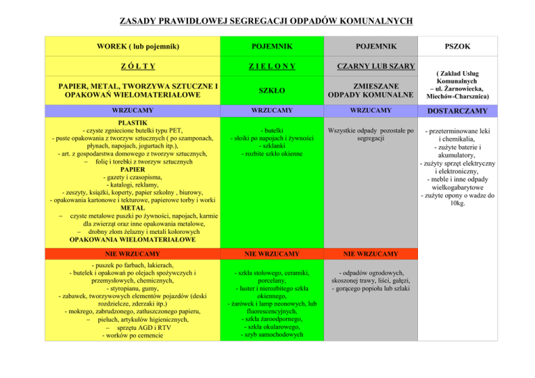 ZASADY PRAWIDŁOWEJ SEGREGACJI ODPADÓW KOMUNALNYCH WOREK ( lub pojemnik) POJEMNIK POJEMNIK ZÓŁTY ZIELONY CZARNY LUB SZARY PSZOK SZKŁO ZMIESZANE ODPADY KOMUNALNE ( Zakład Usług Komunalnych – ul. Żarnowiecka, Miechów-Charsznica) WRZUCAMY WRZUCAMY DOSTARCZAMY - butelki - słoiki po napojach i żywności - szklanki - rozbite szkło okienne Wszystkie odpady pozostałe po segregacji - przeterminowane leki i chemikalia, - zużyte baterie i akumulatory, - zużyty sprzęt elektryczny i elektroniczny, - meble i inne odpady wielkogabarytowe - zużyte opony o wadze do 10kg. NIE WRZUCAMY NIE WRZUCAMY NIE WRZUCAMY - puszek po farbach, lakierach, - butelek i opakowań po olejach spożywczych i przemysłowych, chemicznych, - styropianu, gumy, - zabawek, tworzywowych elementów pojazdów (deski rozdzielcze, zderzaki itp.) - mokrego, zabrudzonego, zatłuszczonego papieru, − pieluch, artykułów higienicznych, − sprzętu AGD i RTV - worków po cemencie - szkła stołowego, ceramiki, porcelany, - luster i nierozbitego szkła okiennego, - żarówek i lamp neonowych, lub fluorescencyjnych, - szkła żaroodpornego, - szkła okularowego, - szyb samochodowych - odpadów ogrodowych, skoszonej trawy, liści, gałęzi, - gorącego popiołu lub szlaki PAPIER, METAL, TWORZYWA SZTUCZNE I OPAKOWAŃ WIELOMATERIAŁOWE WRZUCAMY PLASTIK - czyste zgniecione butelki typu PET, - puste opakowania z tworzyw sztucznych ( po szamponach, płynach, napojach, jogurtach itp.), - art. z gospodarstwa domowego z tworzyw sztucznych, − folię i torebki z tworzyw sztucznych PAPIER - gazety i czasopisma, - katalogi, reklamy, - zeszyty, książki, koperty, papier szkolny , biurowy, - opakowania kartonowe i tekturowe, papierowe torby i worki METAL − czyste metalowe puszki po żywności, napojach, karmie dla zwierząt oraz inne opakowania metalowe, − drobny złom żelazny i metali kolorowych OPAKOWANIA WIELOMATERIAŁOWE