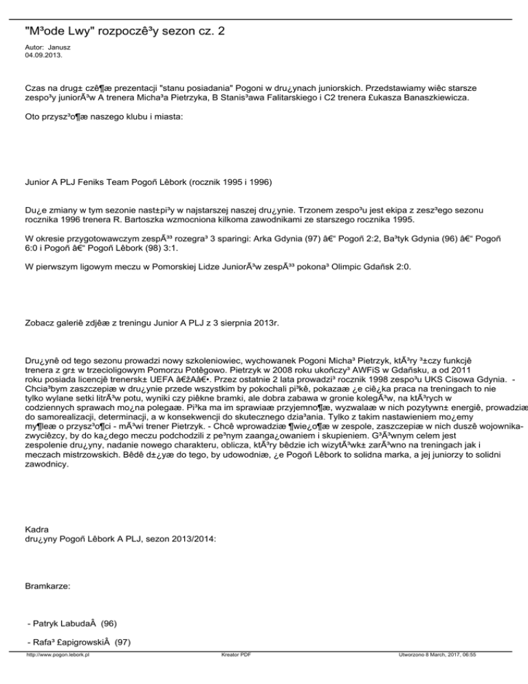 "M³ode Lwy" rozpoczê³y sezon cz. 2 Autor: Janusz 04.09.2013. Czas na drug± czê¶æ prezentacji "stanu posiadania" Pogoni w dru¿ynach juniorskich. Przedstawiamy wiêc starsze zespo³y juniorów A trenera Micha³a Pietrzyka, B Stanis³awa Falitarskiego i C2 trenera £ukasza Banaszkiewicza. Oto przysz³o¶æ naszego klubu i miasta: Junior A PLJ Feniks Team Pogoñ Lêbork (rocznik 1995 i 1996) Du¿e zmiany w tym sezonie nast±pi³y w najstarszej naszej dru¿ynie. Trzonem zespo³u jest ekipa z zesz³ego sezonu rocznika 1996 trenera R. Bartoszka wzmocniona kilkoma zawodnikami ze starszego rocznika 1995. W okresie przygotowawczym zespó³ rozegra³ 3 sparingi: Arka Gdynia (97) – Pogoñ 2:2, Ba³tyk Gdynia (96) – Pogoñ 6:0 i Pogoñ – Pogoñ Lêbork (98) 3:1. W pierwszym ligowym meczu w Pomorskiej Lidze Juniorów zespó³ pokona³ Olimpic Gdañsk 2:0. Zobacz galeriê zdjêæ z treningu Junior A PLJ z 3 sierpnia 2013r. Dru¿ynê od tego sezonu prowadzi nowy szkoleniowiec, wychowanek Pogoni Micha³ Pietrzyk, który ³±czy funkcjê trenera z gr± w trzecioligowym Pomorzu Potêgowo. Pietrzyk w 2008 roku ukoñczy³ AWFiS w Gdañsku, a od 2011 roku posiada licencjê trenersk± UEFA „A―. Przez ostatnie 2 lata prowadzi³ rocznik 1998 zespo³u UKS Cisowa Gdynia. Chcia³bym zaszczepiæ w dru¿ynie przede wszystkim by pokochali pi³kê, pokazaæ ¿e ciê¿ka praca na treningach to nie tylko wylane setki litrów potu, wyniki czy piêkne bramki, ale dobra zabawa w gronie kolegów, na których w codziennych sprawach mo¿na polegaæ. Pi³ka ma im sprawiaæ przyjemno¶æ, wyzwalaæ w nich pozytywn± energiê, prowadziæ do samorealizacji, determinacji, a w konsekwencji do skutecznego dzia³ania. Tylko z takim nastawieniem mo¿emy my¶leæ o przysz³o¶ci - mówi trener Pietrzyk. - Chcê wprowadziæ ¶wie¿o¶æ w zespole, zaszczepiæ w nich duszê wojownikazwyciêzcy, by do ka¿dego meczu podchodzili z pe³nym zaanga¿owaniem i skupieniem. G³Ã³wnym celem jest zespolenie dru¿yny, nadanie nowego charakteru, oblicza, który bêdzie ich wizytówk± zarówno na treningach jak i meczach mistrzowskich. Bêdê d±¿yæ do tego, by udowodniæ, ¿e Pogoñ Lêbork to solidna marka, a jej juniorzy to solidni zawodnicy. Kadra dru¿yny Pogoñ Lêbork A PLJ, sezon 2013/2014: Bramkarze: - Patryk Labuda (96) - Rafa³ £apigrowski (97) http://www.pogon.lebork.pl Kreator PDF Utworzono 8 March, 2017, 06:55 Obroñcy: - Marcin Sadurski (95) - £ukasz Janowicz (96) - Patryk Grzebiela (97) - Adrian Chojnacki (96) - Gracjan Miszkiewicz (95) Pomocnicy: - Pawe³ Labuda (96) - Maciej Wierzbowski (96) - Mateusz Sadowski (96) - Marcin Ko³odziejski (96) - Jakub Oszmaniec (96) - Szymon ¦liwiñski (97) - Dominik Itrych (95) - Tomasz Lica (95) - £ukasz ¦wi±tek (96) Napastnicy: - Aleksander Jastrzêbski - Szymon Czy¿ewski (97) http://www.pogon.lebork.pl Kreator PDF Utworzono 8 March, 2017, 06:55 - Mateusz Keler (96) - Karol Wos (96) Trener: Micha³ Pietrzyk Junior B SKO gr. I Pogoñ Lêbork (rocznik 1998) Po zwyciêstwie w swojej grupie rozgrywkowej w zesz³ym sezonie i bara¿ach o Pomorsk± Ligê Juniorów „B―, w których niewiele zabrak³o do awansu, dru¿yna trenera Stanis³awa Falitarskiego w tym sezonie ponownie walczy o 1. lokatê i grê w bara¿ach (tym razem tylko z jedn± dru¿yn± bo w tym sezonie graj± 2, a nie 3 grupy). Trzon zespo³u stanowi± zawodnicy z rocznika 1998, jest tak¿e kilku graczy z 97 i 99. Treningi dru¿yna rozpoczê³a 2 sierpnia. W trakcie przygotowañ rozegra³a trzy gry sparingowe: Bytovia Bytów - Pogoñ Lêbork 4:0, Pomorze Potêgowo - Pogoñ Lêbork 2:7, Pogoñ (junior A) – Pogoñ (junior B) 3:1. W pierwszym ligowym meczu zespó³ pojecha³ na trudny mecz do S³upska, gdzie pewnie zwyciê¿y³ 5:3 Gryfa co jest dobrym prognostykiem przed kolejnymi spotkaniami. Wiêcej o dru¿ynie na www.pogonlebork1998.futbolowo.pl Kadra dru¿yny Pogoñ Lêbork B SKO gr. I sezon 2013/2014: Bramkarze: - Damian Czerniak (98) - Pawe³ Traskowski (98) - Rafa³ £apigrowski (97) - Micha³ Kolañczyk (98) http://www.pogon.lebork.pl Kreator PDF Utworzono 8 March, 2017, 06:55 - Piotr Witek (98) Obroñcy: - Dawid Bryk (98) - Marcin Kosiñski (98) - Szymon Kmita (98) - Przemys³aw ¦liwiñski (98) - Wojciech Gozdowski (98) - Patryk Grzebiela (97) - Konrad Elwart (97) - Mateusz Bartosiak (98) - Szymon Tomaszewski (98) Pomocnicy: - Mateusz Zanewycz (98) - Mateusz Majewski (98) - Micha³ Rusinek (98) - Mateusz Lange (97) - Pawe³ Wutowicz (98) - Grzegorz Ryta (98) - Krystian Pob³ocki (98) - Rafa³ Szulist (98) - Olaf Hawryluk (98) http://www.pogon.lebork.pl Kreator PDF Utworzono 8 March, 2017, 06:55 Napastnicy: - Daniel So¶nicki (98) Micha³ Lisowski (99) - Patryk Szarkiel (97) - Konrad Elwart (97) - Tomasz Neubauer (97) Trener: Stanis³aw Falitarski Junior C2 PLJ Pogoñ Lêbork (rocznik 2000) Dzi¶, w ¶rodê w zespole rocznika 2000 ¶wiêto. Przymierzane s± nowe stroje. W porównaniu z ubieg³ym sezonem w dru¿ynie dosz³o do wielu zmian kadrowych. Treningi zespó³ rozpocz±³ wcze¶nie, bo w po³owie lipca. Dru¿yna zaliczy³a te¿ dochodzeniowy obóz przygotowawczy. Rozegra³a te¿ 3 gry kontrolne: 7:1 z m³odsza dru¿yn± Pogoni rocznika 2001 (trener Bartoszek), remis 2:2 z Pomorzem Potêgowo (99) i pora¿ka ze starszymi juniorami B Pogoni 7:1. Od tego sezonu zespó³ prowadzi nowy trener £ukasz Banaszkiewicz. Trener Banaszkiewicz ma 27 lat i jest wychowankiem Zawiszy Bydgoszcz gdzie spêdzi³ ca³y wiek juniorski, graj±c w seniorach m.in. w Sparcie Brodnica, Wdzie ¦wiecie czy irlandzkim Kilkenny Football Club W trenerskim fachu zadebiutowa³ w lutym 2009 roku prowadz±c Kobiecy Klub Pi³karski „KKP Golden Goal― Bydgoszcz. Od lipca 2010 roku do stycznia 2013 pracowa³ jako zawodowy trener w miasteczku Kilkenny na po³udniowym wschodzie Irlandii prowadz±c dru¿yny juniorskie U-19 i indywidualnie bramkarzy klubów takich jak „Freebooters― Ama