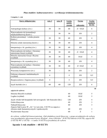 Plan studiów: kulturoznawstwo – cywilizacja śródziemnomorska I stopień, 1. rok Kursy obligatoryjne: sem. I Liczba godzin rocznie zaliczenia: Liczba punktów ECTS: 30 60 Z + EGZ 6 30 30 ZO 2 30 30 60 ZO 4 Historia sztuki starożytnej (konw.) 30 30 60 ZO 4 Interpretacje z lit. greckiej (ćw.) 30 30 60 ZO 4 30 30 60 Z + EGZ 4 30 30 60 EGZ 5 Interpretacje z lit. rzymskiej (ćw.) 30 30 60 ZO 4 Wprowadzenie do kultury i literatury rzymskiej (wykład) 30 30 60 Z+ EGZ 4 Warsztaty komputerowe (ćw.) 30 – 30 ZO 2 Ochrona własności intelektualnych (wykład) 4 4 ZO 0,5 Bezpieczeństwo i higiena pracy (wykład) 4 4 ZO 0,5 Język łaciński (ćw.) 60 120 ZO 6 Antropologia kultury (ćw.) Wprowadzenie do komunikacji międzykulturowej (konw.) Kultura prezentacji i sztuka pisania (konw.) Wprowadzenie do kultury i literatury starożytnej Grecji (wykład) Historia starożytna Grecji i Rzymu (wykład) 30 sem. II 60 Forma 46 zajęcia do wyboru: Historia filozofii (wykład) Logika (wykład) 60 60 EGZ EGZ 5 5 Język włoski lub hiszpański lub nowogrecki lub francuski (lek.) Greka klasyczna Nahuatl klasyczny Zajęcia OgUn poza W „AL” (w tym min. 2 ECTS za zajęcia z obszaru nauk humanistycznych i społecznych) Wychowanie fizyczne 120 60 60 ZO ZO ZO 4 3 3 60 60 ZO Z 3 1 do wyboru wykład lub konwersatorium i/lub dodatkowy język klasyczny z grupy przedmiotów do wyboru oraz przedmiotów oferowanych przez Wydział „Artes Liberales” (8 ECTS) lektorat (4 ECTS), zajęcia OG (3 ECTS) WF (1 ECTS) – w sumie 14 ECTS za przedmioty do wyboru łącznie 1 rok studiów – 60 ECTS I stopień, 2. rok Kursy obligatoryjne: sem. I sem. II Liczba godzin rocznie Forma zaliczenia: Liczba punktów ECTS: 30 - 30 ZO 2 - 30 30 ZO 2 Historia kultury europejskiego średniowiecza (wykład) 30 30 60 Z + EGZ 4 Renesans włoski i europejski (wykład) 30 30 60 Z + EGZ 4 Semiotyka kultury (konw.) 30 30 60 ZO 4 Instytucje kulturalne i ich zasady (konw.) 30 30 60 ZO 4 30 30 60 ZO 4 30 30 ZO 2 60 120 Z+EGZ 7 Historia sztuki średniowiecznej (konw.) Historia sztuki Renesansu i baroku (konw.) Współczesna kultura audiowizualna (wykład ZO) Recepcja antyku w kulturze literackiej Europy (konw.) Język łaciński (ćw.) 60 33 zajęcia do wyboru: Polska w relacjach międzykulturowych (konw.) Recepcja filozofii antycznej w kulturze umysłowej Europy (konw.) Historia kultury iberyjskiej - iberoamerykańskiejtransatlantyckiej/francuskiej i włoskiej/bałkańskiej i greckiej do wyboru - 1 część (wyk.+ EGZ) (co najmniej jeden obowiązkowy do wyboru) Historia kultury bizantyjskiej (wykład) Język włoski lub hiszpański lub nowogrecki lub francuski Greka klasyczna Nahuatl klasyczny Zajęcia OG poza W „AL” (w tym min. 2 ECTS za zajęcia z obszaru nauk humanistycznych i społecznych) Wychowanie fizyczne 60 ZO 4 30 ZO 2 60 60 EGZ ZO 3 3 120 60 60 ZO EGZ EGZ 4 5 5 60 60 ZO ZO 3 1 do wyboru trzy wykłady lub konwersatoria i/ lub dodatkowy język klasyczny z grupy przedmiotów do wyboru oraz przedmiotów oferowanych przez Wydział „Artes Liberales” (19 ECTS) lektorat (4 ECTS), zajęcia OG (3 ECTS), WF (1 ECTS) – w sumie 27 ECTS za przedmioty do wyboru łącznie 2 rok studiów – 60 ECTS I stopień, 3. rok Kursy obligatoryjne: sem. I sem. I Liczba godzin rocznie Forma zaliczenia: Liczba punktów ECTS: 30 – 30 ZO 2 Sztuka nowoczesna (konw.) 30 30 ZO 2 Metodologia pracy naukowej (konw.) 30 30 ZO 2 – 30 ZO 2 Historia sztuki XIX wieku (konw.) Tradycje antyczne w Europie Środkowej (konw.) 30 8 zajęcia do wyboru: Historia kultury iberyjskiej - iberoamerykańskiejtransatlantyckiej/francuskiej i włoskiej/bałkańskiej i greckiej do wyboru, 2 część (wyk.+ EGZ) (co najmniej jeden obowiązkowy do wyboru – kontynuacja z roku II) 60 EGZ 4 Greka klasyczna (ćw.) 60 ZO 4 Język łaciński (ćw.) 60 ZO 4 Nahuatl klasyczny (ćw.) 60 ZO 4 Paleografia łacińska (konw.) 60 ZO 4 Seminarium wiodące do wyboru Język włoski lub hiszpański lub nowogrecki lub francuski Zajęcia OG poza W„AL” (w tym min. 1 ECTS za zajęcia z obszaru nauk humanistycznych i społecznych) 60 ZO 5 120 Z + EGZ 6 60 ZO 3 Praktyki studenckie 4 tyg. Praca dyplomowa do wyboru pięć wykładów lub konwersatoriów i/ lub dodatkowy język klasyczny z grupy przedmiotów do wyboru oraz przedmiotów oferowanych przez Wydział „Artes Liberales” (24 ECTS), seminarium (5 ECTS), lektorat (6 ECTS), zajęcia OG (3 ECTS), praktyki studenckie (4 ECTS), praca dyplomowa (10 ECTS) – w sumie 52 ECTS za przedmioty do wyboru łącznie 3 rok studiów – 60 ECTS 4 10