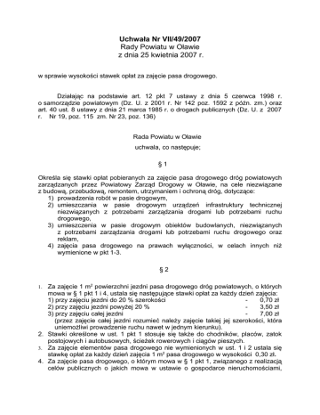 Uchwała Nr VII/49/2007 Rady Powiatu w Oławie z dnia 25 kwietnia 2007 r. w sprawie wysokości stawek opłat za zajęcie pasa drogowego. Działając na podstawie art. 12 pkt 7 ustawy z dnia 5 czerwca 1998 r. o samorządzie powiatowym (Dz. U. z 2001 r. Nr 142 poz. 1592 z późn. zm.) oraz art. 40 ust. 8 ustawy z dnia 21 marca 1985 r. o drogach publicznych (Dz. U. z 2007 r. Nr 19, poz. 115 zm. Nr 23, poz. 136) Rada Powiatu w Oławie uchwala, co następuje; §1 Określa się stawki opłat pobieranych za zajęcie pasa drogowego dróg powiatowych zarządzanych przez Powiatowy Zarząd Drogowy w Oławie, na cele niezwiązane z budową, przebudową, remontem, utrzymaniem i ochroną dróg, dotyczące: 1) prowadzenia robót w pasie drogowym, 2) umieszczania w pasie drogowym urządzeń infrastruktury technicznej niezwiązanych z potrzebami zarządzania drogami lub potrzebami ruchu drogowego, 3) umieszczenia w pasie drogowym obiektów budowlanych, niezwiązanych z potrzebami zarządzania drogami lub potrzebami ruchu drogowego oraz reklam, 4) zajęcia pasa drogowego na prawach wyłączności, w celach innych niż wymienione w pkt 1-3. §2 Za zajęcie 1 m2 powierzchni jezdni pasa drogowego dróg powiatowych, o których mowa w § 1 pkt 1 i 4, ustala się następujące stawki opłat za każdy dzień zajęcia: 1) przy zajęciu jezdni do 20 % szerokości 0,70 zł 2) przy zajęciu jezdni powyżej 20 % 3,50 zł 3) przy zajęciu całej jezdni 7,00 zł (przez zajęcie całej jezdni rozumieć należy zajęcie takiej jej szerokości, która uniemożliwi prowadzenie ruchu nawet w jednym kierunku). 2. Stawki określone w ust. 1 pkt 1 stosuje się także do chodników, placów, zatok postojowych i autobusowych, ścieżek rowerowych i ciągów pieszych. 3. Za zajęcie elementów pasa drogowego nie wymienionych w ust. 1 i 2 ustala się stawkę opłat za każdy dzień zajęcia 1 m2 pasa drogowego w wysokości 0,30 zł. 4. Za zajęcie pasa drogowego, o którym mowa w § 1 pkt 1, związanego z realizacją celów publicznych o jakich mowa w ustawie o gospodarce nieruchomościami, 1. współfinansowanych z funduszy europejskich, stosuje się zniżkę w wysokości 50% całkowitej opłaty wyliczonej wg stawek określonych w ust. 1,2 i 3. 5. Przy zajęciu pasa drogowego, o którym mowa w § 1 pkt 4, w odniesieniu do : masowych imprez sportowych i kulturalnych oraz w celach religijnych, Zarząd Powiatu może odstąpić od pobierania opłat. §3 Za zajęcie pasa drogowego, o których mowa w § 1 pkt 2 ustala się następujące roczne stawki opłat za 1 m2 powierzchni pasa drogowego drogi powiatowej zajętego przez rzut poziomy umieszczanego urządzenia niepowodującego utrudnień : a) jezdni : 1) poza terenem zabudowanym 9,00 zł 2) w terenie zabudowanym 16,00 zł, b) chodników, placów, zatok postojowych i autobusowych, ścieżek rowerowych, ciągów pieszych: 1) poza terenem zabudowanym 4,00 zł 2) w terenie zabudowanym 8,00 zł, c) poza jezdniami i chodnikami: 1) poza terenem zabudowanym 1,00 zł 2) w terenie zabudowanym 2,00 zł d) na drogowych obiektach inżynierskich - 200,00 zł. 2. Przy umieszczaniu urządzeń wodociągowych i kanalizacyjnych stosuje się kwoty stawek w wysokości 25 % stawek określonych w pkt 1 a i b. 1. §4 Za każdy dzień zajęcia pasa drogowego, o którym mowa w § 1 pkt 3, ustala się następujące stawki opłat za 1 m2 powierzchni: 1) pasa drogowego zajętego przez rzut poziomy obiektu handlowego lub usługowego: a) poza terenem zabudowy 0,15 zł b) w terenie zabudowy miast 0,35 zł c) w terenie zabudowy wiosek 0,20 zł 2) pasa drogowego zajętego przez rzut poziomy innych obiektów 0,15 zł (np.: szafki telekomunikacyjne, gazowe, energetyczne, hydranty, słupy telefoniczne i energetyczne, budki telefoniczne). 2. Za każdy dzień umieszczenia w pasie drogowym reklamy na terenie miast, ustala się stawkę opłaty za 1 m2 powierzchni w wysokości 1,10 zł, a na terenie wiosek 0,60 zł. 1. §5 Wykonanie uchwały powierza się Zarządowi Powiatu w Oławie. §6 Traci moc Uchwała Nr XVIII/89/2004 Rady Powiatu w Oławie z dnia 25 lutego 2004 r. w sprawie wysokości stawek opłat za zajęcie pasa drogowego. §7 Uchwała wchodzi w życie po 14 dniach od jej ogłoszenia w Dzienniku Urzędowym Województwa Dolnośląskiego.