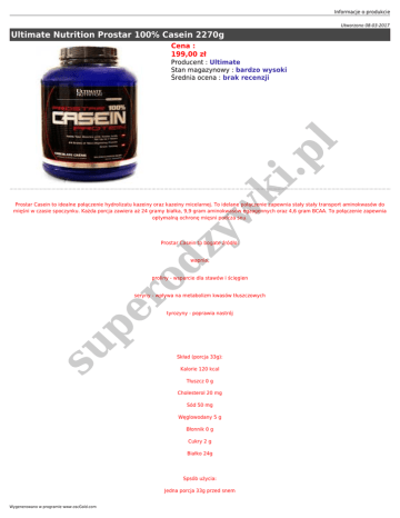 Informacje o produkcie Utworzono 08-03-2017 Ultimate Nutrition Prostar 100% Casein 2270g Cena : 199,00 zł ki .p l Producent : Ultimate Stan magazynowy : bardzo wysoki Średnia ocena : brak recenzji ro dz y w Prostar Casein to idealne połączenie hydrolizatu kazeiny oraz kazeiny micelarnej. To idelane połączenie zapewnia stały stały transport aminokwasów do mięśni w czasie spoczynku. Każda porcja zawiera aż 24 gramy białka, 9,9 gram aminokwasów egzogennych oraz 4,6 gram BCAA. To połączenie zapewnia optymalną ochronę mięsni podcza snu. Prostar Casein to bogate źródło: wapnia, proliny - wsparcie dla stawów i ścięgien su pe seryny - wpływa na metabolizm kwasów tłuszczowych tyrozyny - poprawia nastrój Skład (porcja 33g): Kalorie 120 kcal Tłuszcz 0 g Cholesterol 20 mg Sód 50 mg Węglowodany 5 g Błonnik 0 g Cukry 2 g Białko 24g Spsób użycia: Jedna porcja 33g przed snem Wygenerowano w programie www.oscGold.com .p l ki w ro dz y pe su