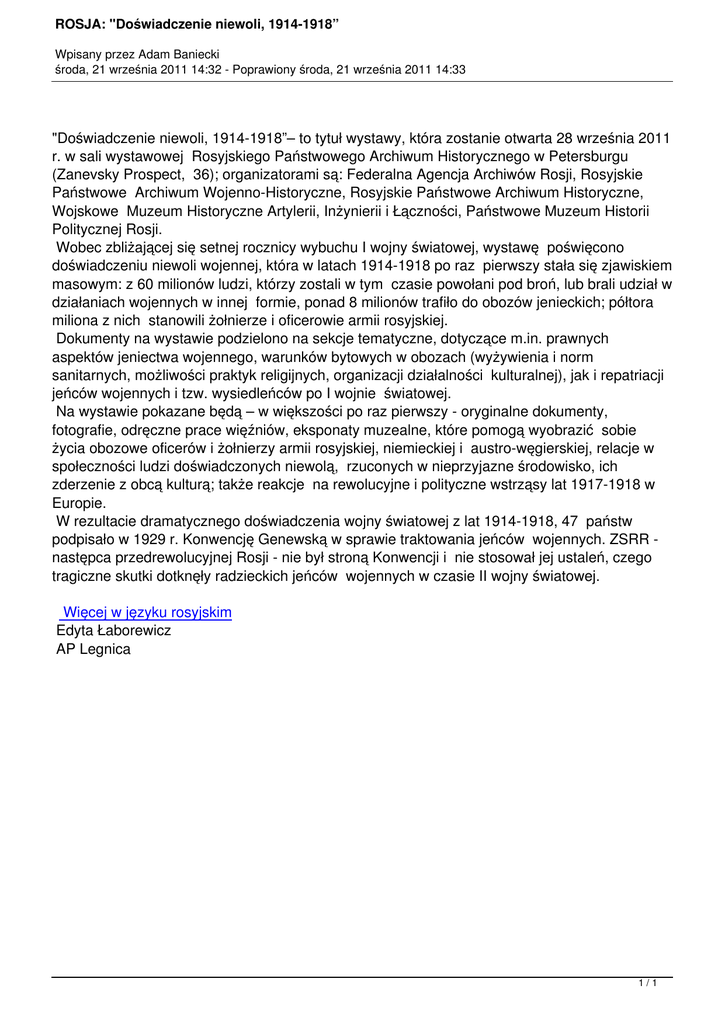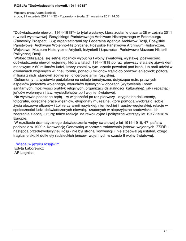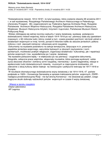 ROSJA: "Doświadczenie niewoli, 1914-1918” Wpisany przez Adam Baniecki środa, 21 września 2011 14:32 - Poprawiony środa, 21 września 2011 14:33 "Doświadczenie niewoli, 1914-1918”– to tytuł wystawy, która zostanie otwarta 28 września 2011 r. w sali wystawowej Rosyjskiego Państwowego Archiwum Historycznego w Petersburgu (Zanevsky Prospect, 36); organizatorami są: Federalna Agencja Archiwów Rosji, Rosyjskie Państwowe Archiwum Wojenno-Historyczne, Rosyjskie Państwowe Archiwum Historyczne, Wojskowe Muzeum Historyczne Artylerii, Inżynierii i Łączności, Państwowe Muzeum Historii Politycznej Rosji. Wobec zbliżającej się setnej rocznicy wybuchu I wojny światowej, wystawę poświęcono doświadczeniu niewoli wojennej, która w latach 1914-1918 po raz pierwszy stała się zjawiskiem masowym: z 60 milionów ludzi, którzy zostali w tym czasie powołani pod broń, lub brali udział w działaniach wojennych w innej formie, ponad 8 milionów trafiło do obozów jenieckich; półtora miliona z nich stanowili żołnierze i oficerowie armii rosyjskiej. Dokumenty na wystawie podzielono na sekcje tematyczne, dotyczące m.in. prawnych aspektów jeniectwa wojennego, warunków bytowych w obozach (wyżywienia i norm sanitarnych, możliwości praktyk religijnych, organizacji działalności kulturalnej), jak i repatriacji jeńców wojennych i tzw. wysiedleńców po I wojnie światowej. Na wystawie pokazane będą – w większości po raz pierwszy - oryginalne dokumenty, fotografie, odręczne prace więźniów, eksponaty muzealne, które pomogą wyobrazić sobie życia obozowe oficerów i żołnierzy armii rosyjskiej, niemieckiej i austro-węgierskiej, relacje w społeczności ludzi doświadczonych niewolą, rzuconych w nieprzyjazne środowisko, ich zderzenie z obcą kulturą; także reakcje na rewolucyjne i polityczne wstrząsy lat 1917-1918 w Europie. W rezultacie dramatycznego doświadczenia wojny światowej z lat 1914-1918, 47 państw podpisało w 1929 r. Konwencję Genewską w sprawie traktowania jeńców wojennych. ZSRR następca przedrewolucyjnej Rosji - nie był stroną Konwencji i nie stosował jej ustaleń, czego tragiczne skutki dotknęły radzieckich jeńców wojennych w czasie II wojny światowej. Więcej w języku rosyjskim Edyta Łaborewicz AP Legnica 1/1