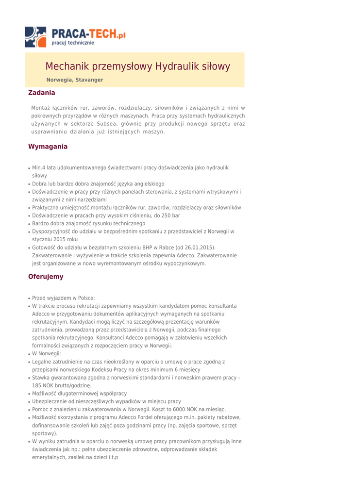 Mechanik przemysłowy Hydraulik siłowy Norwegia, Stavanger Zadania Montaż łączników rur, zaworów, rozdzielaczy, siłowników i związanych z nimi w pokrewnych przyrządów w różnych maszynach. Praca przy systemach hydraulicznych używanych w sektorze Subsea, głównie przy produkcji nowego sprzętu oraz usprawnianiu działania już istniejących maszyn. Wymagania ● ● ● ● ● ● ● ● Min.4 lata udokumentowanego świadectwami pracy doświadczenia jako hydraulik siłowy Dobra lub bardzo dobra znajomość języka angielskiego Doświadczenie w pracy przy różnych panelach sterowania, z systemami wtryskowymi i związanymi z nimi narzędziami Praktyczna umiejętność montażu łączników rur, zaworów, rozdzielaczy oraz siłowników Doświadczenie w pracach przy wysokim ciśnieniu, do 250 bar Bardzo dobra znajomość rysunku technicznego Dyspozycyjność do udziału w bezpośrednim spotkaniu z przedstawiciel z Norwegii w styczniu 2015 roku Gotowość do udziału w bezpłatnym szkoleniu BHP w Rabce (od 26.01.2015). Zakwaterowanie i wyżywienie w trakcie szkolenia zapewnia Adecco. Zakwaterowanie jest organizowane w nowo wyremontowanym ośrodku wypoczynkowym. Oferujemy ● ● ● ● ● ● ● ● ● ● Przed wyjazdem w Polsce: W trakcie procesu rekrutacji zapewniamy wszystkim kandydatom pomoc konsultanta Adecco w przygotowaniu dokumentów aplikacyjnych wymaganych na spotkaniu rekrutacyjnym. Kandydaci mogą liczyć na szczegółową prezentację warunków zatrudnienia, prowadzoną przez przedstawiciela z Norwegii, podczas finalnego spotkania rekrutacyjnego. Konsultanci Adecco pomagają w załatwieniu wszelkich formalności związanych z rozpoczęciem pracy w Norwegii. W Norwegii: Legalne zatrudnienie na czas nieokreślony w oparciu o umowę o prace zgodną z przepisami norweskiego Kodeksu Pracy na okres minimum 6 miesięcy Stawka gwarantowana zgodna z norweskimi standardami i norweskim prawem pracy – 185 NOK brutto/godzinę. Możliwość długoterminowej współpracy Ubezpieczenie od nieszczęśliwych wypadków w miejscu pracy Pomoc z znalezieniu zakwaterowania w Norwegii. Koszt to 6000 NOK na miesiąc. Możliwość skorzystania z programu Adecco Fordel oferującego m.in. pakiety rabatowe, dofinansowanie szkoleń lub zajęć poza godzinami pracy (np. zajęcia sportowe, sprzęt sportowy). W wyniku zatrudnia w oparciu o norweską umowę pracy pracownikom przysługują inne świadczenia jak np.: pełne ubezpieczenie zdrowotne, odprowadzanie składek emerytalnych, zasiłek na dzieci i.t.p Etapy rekrutacji ● ● ● ● Adecco Poland Sp. z o.o. należy do międzynarodowej korporacji Adecco S.A. światowego lidera wśród firm doradztwa personalnego, który posiada 5500 placówek w 60 krajach. W Polsce działamy od 1994 roku. Swoją wiedzą i doświadczeniem służymy w ponad 30 lokalizacjach na terenie kraju. W 2009 roku pracę dzięki Adecco Poland znalazło ponad 26 000 osób. Adecco Poland Sp. z o.o. jest Agencją Zatrudnienia (certyfikat nr 364). Aktualnie dla naszego klienta, międzynarodowej firmy z kapitałem zagranicznym poszukujemy osoby na stanowisko: Mechanik Przemysłowy/Hydraulik Siłowy (Monter oprzyrządowania) Nazwa firmy: Adecco Poland Branża:Budownictwo / Architektura / Geodezja Lokalizacja:Monter Zamieszczono:2015-01-09 00:00:00 Oferta ważna do:2015-04-09 00:00:00 Ilość wyświetleń:1191