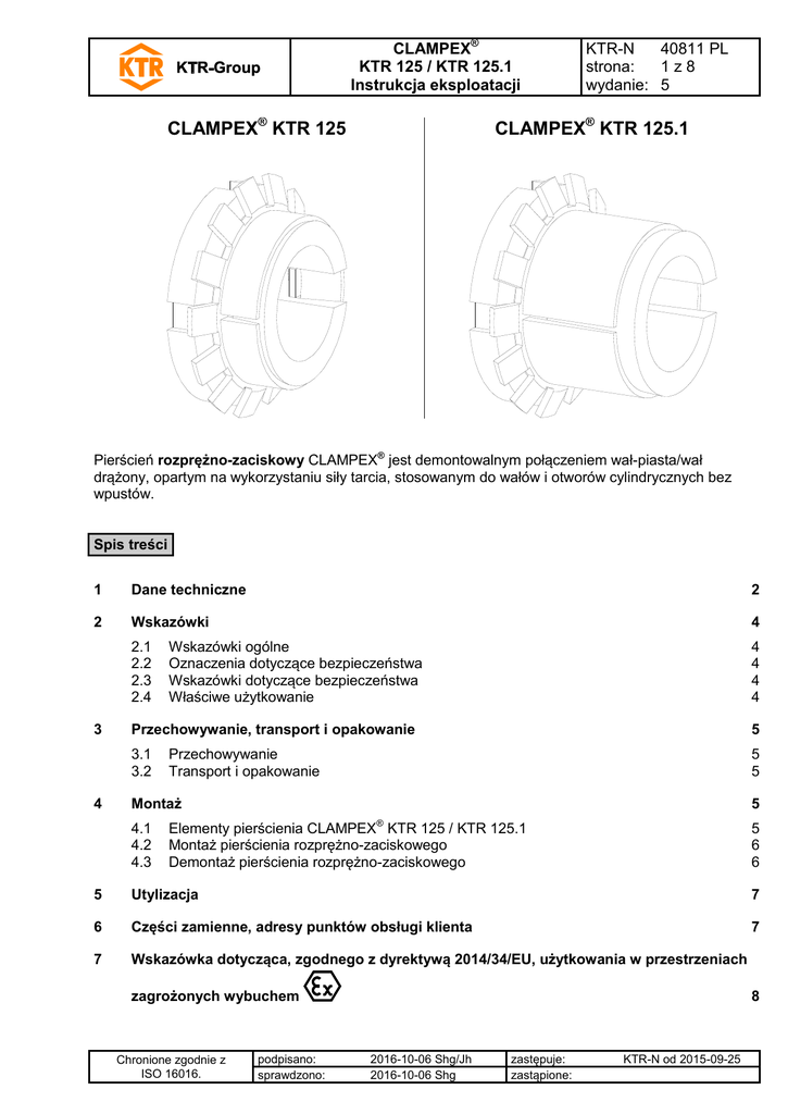 CLAMPEX® KTR 125 / KTR 125.1 Instrukcja eksploatacji CLAMPEX® KTR 125 KTR-N 40811 PL strona: 1z8 wydanie: 5 CLAMPEX® KTR 125.1 Pierścień rozprężno-zaciskowy CLAMPEX® jest demontowalnym połączeniem wał-piasta/wał drążony, opartym na wykorzystaniu siły tarcia, stosowanym do wałów i otworów cylindrycznych bez wpustów. Spis treści 1 Dane techniczne 2 2 Wskazówki 4 2.1 2.2 2.3 2.4 4 4 4 4 3 4 Wskazówki ogólne Oznaczenia dotyczące bezpieczeństwa Wskazówki dotyczące bezpieczeństwa Właściwe użytkowanie Przechowywanie, transport i opakowanie 5 3.1 3.2 5 5 Przechowywanie Transport i opakowanie Montaż 4.1 4.2 4.3 5 Elementy pierścienia CLAMPEX® KTR 125 / KTR 125.1 Montaż pierścienia rozprężno-zaciskowego Demontaż pierścienia rozprężno-zaciskowego 5 6 6 5 Utylizacja 7 6 Części zamienne, adresy punktów obsługi klienta 7 7 Wskazówka dotycząca, zgodnego z dyrektywą 2014/34/EU, użytkowania w przestrzeniach zagrożonych wybuchem Chronione zgodnie z ISO 16016. podpisano: sprawdzono: 8 2016-10-06 Shg/Jh 2016-10-06 Shg zastępuje: zastąpione: KTR-N od 2015-09-25 CLAMPEX® KTR 125 / KTR 125.1 Instrukcja eksploatacji 1 KTR-N 40811 PL strona: 2z8 wydanie: 5 Dane techniczne 1) ® rysunek 1: CLAMPEX KTR 125 wymiar DN: należy obliczyć, wskazówki w katalogu sprzęgieł KTR ® Tabela 1: CLAMPEX KTR 125 nakrętka blokująca DIN 981 całkowite = 0,14 wymiary [mm] dxD B B1 D1 14 x 25 15 x 25 16 x 25 17 x 25 18 x 30 19 x 30 20 x 30 22 x 35 24 x 35 25 x 35 28 x 40 30 x 40 32 x 45 35 x 45 38 x 50 40 x 50 42 x 55 45 x 55 48 x 60 50 x 60 55 x 65 60 x 70 16,5 16,5 16,5 16,5 17 17 17 17 17 17 20 20 22 22 23 23 25,5 25,5 25,5 25,5 29,5 29,5 6,5 6,5 6,5 6,5 7 7 7 7 7 7 8 8 9 9 9 9 10 10 10 10 12 12 32 32 32 38 38 38 38 45 45 45 52 52 58 58 65 65 70 70 75 75 80 85 Chronione zgodnie z ISO 16016. nazwa skrócona KM 4 KM 4 KM 4 KM 4 KM 5 KM 5 KM 5 KM 6 KM 6 KM 6 KM 7 KM 7 KM 8 KM 8 KM 9 KM 9 KM 10 KM 10 KM 11 KM 11 KM 12 KM 13 M M20x1 M20x1 M20x1 M20x1 M25x1,5 M25x1,5 M25x1,5 M30x1,5 M30x1,5 M30x1,5 M35x1,5 M35x1,5 M40x1,5 M40x1,5 M45x1,5 M45x1,5 M50x1,5 M50x1,5 M55x2 M55x2 M60x2 M65x2 podpisano: sprawdzono: TA [Nm] 65 65 65 75 85 95 110 140 155 160 205 240 320 320 440 440 550 550 660 660 750 880 przenoszony moment obrotowy lub siła osiowa T [Nm] 37 40 42 52 64 59 72 83 101 108 134 168 208 228 301 317 372 449 525 546 625 843 2016-10-06 Shg/Jh 2016-10-06 Shg Fax [kN] 5 5 5 6 7 6 7 8 8 9 10 11 13 13 16 16 18 20 22 22 23 28 zastępuje: zastąpione: nacisk powierzchniowy pomiędzy pierścieniem 2 a [N/mm ] wał piasta PW PN 171 96 159 96 149 96 162 110 167 100 138 87 151 101 145 91 147 101 146 104 126 88 137 103 133 95 122 95 137 104 130 104 124 95 131 107 134 107 129 107 102 86 115 99 masa [~kg] 0,050 0,050 0,042 0,040 0,040 0,072 0,068 0,120 0,096 0,090 0,130 0,124 0,113 0,166 0,280 0,238 0,350 0,280 0,360 0,302 0,400 0,418 KTR-N od 2015-09-25 CLAMPEX® KTR 125 / KTR 125.1 Instrukcja eksploatacji 1 KTR-N 40811 PL strona: 3z8 wydanie: 5 Dane techniczne 1) rysunek 1: CLAMPEX® KTR 125.1 wymiar DN: należy obliczyć, wskazówki w katalogu sprzęgieł KTR ® Tabela 2: CLAMPEX KTR 125.1 nakrętka blokująca DIN 981 całkowite = 0,14 wymiary [mm] dxD B B1 D1 14 x 25 15 x 25 16 x 25 17 x 25 18 x 30 19 x 30 20 x 30 22 x 35 24 x 35 25 x 35 28 x 40 30 x 40 32 x 45 35 x 45 38 x 50 40 x 50 42 x 55 45 x 55 48 x 60 50 x 60 55 x 65 60 x 70 29 29 29 31 31 31 31 35 35 35 35 35 42 42 44 44 45 45 46 46 47 52 17 17 17 18 18 18 18 22 22 22 22 22 27 28 28 28 28 28 28 28 28 28 32 32 32 38 38 38 38 45 45 45 52 52 58 58 65 65 70 70 75 75 80 85 nazwa skrócon a KM 4 KM 4 KM 4 KM 4 KM 5 KM 5 KM 5 KM 6 KM 6 KM 6 KM 7 KM 7 KM 8 KM 8 KM 9 KM 9 KM 10 KM 10 KM 11 KM 11 KM 12 KM 13 przenoszony moment obrotowy lub siła osiowa nacisk powierzchniowy pomiędzy pierścieniem 2 a [N/mm ] M TA [Nm] T [Nm] Fax [kN] wał PW piasta PN M20x1 M20x1 M20x1 M20x1 M25x1,5 M25x1,5 M25x1,5 M30x1,5 M30x1,5 M30x1,5 M35x1,5 M35x1,5 M40x1,5 M40x1,5 M45x1,5 M45x1,5 M50x1,5 M50x1,5 M55x2 M55x2 M60x2 M65x2 90 90 70 120 190 150 110 230 230 170 390 240 320 320 440 440 550 550 660 660 780 1050 91 98 81 148 199 166 128 245 267 205 454 300 371 449 594 625 733 785 917 955 1137 1539 13 13 10 17 22 17 13 22 22 16 32 20 23 26 31 31 35 35 38 38 41 51 161 151 110 167 202 151 105 135 124 88 155 89 79 77 87 82 87 82 84 80 79 90 90 90 70 114 121 95 70 85 85 63 109 67 56 60 66 66 67 67 67 67 67 77 masa [~kg] 0,12 0,10 0,10 0,08 0,10 0,15 0,15 0,19 0,28 0,30 0,35 0,35 0,40 0,40 0,38 0,32 0,48 0,37 0,50 0,43 0,80 0,80 Tolerancje, gładkość powierzchni 1) rysunek 3: tolerancje i chropowatość powierzchni (przykład: CLAMPEX® KTR 125) Chronione zgodnie z ISO 16016. podpisano: sprawdzono: 2016-10-06 Shg/Jh 2016-10-06 Shg 2) jedna, dokładna operacja toczenia jest wystarczająca (Rz ≤ 16 µm). maksymalna dopuszczalna tolerancja dla wału/piasty. zastępuje: zastąpione: KTR-N od 2015-09-25 CLAMPEX® KTR 125 / KTR 125.1 Instrukcja eksploatacji 2 KTR-N 40811 PL strona: 4z8 wydanie: 5 Wskazówki 2.1 Wskazówki ogólne Proszę zapoznać się z niniejszą instrukcją przed zamontowaniem pierścienia. Proszę zwrócić szczególną uwagę na informacje dotyczące bezpieczeństwa montażu i użytkowania! Instrukcja eksploatacji jest elementem wyrobu. Proszę przechowywać ją przez cały czas użytkowania pierścienia. Prawa autorskie niniejszej instrukcji są zastrzeżone przez KTR. 2.2 Oznaczenia dotyczące bezpieczeństwa STOP ! Ostrzeżenie o przestrzeniach zagrożonych wybuchem Ten symbol oznacza uwagi, które mogą przyczynić się do zapobiegania obrażeniom ciała lub ciężkim obrażeniom ciała, mogącym doprowadzić do śmierci spowodowanej wybuchem. Ostrzeżenie przed urazami ciała Ten symbol oznacza uwagi, które mogą przyczynić się do zapobiegania obrażeniom ciała lub ciężkim obrażeniom ciała, mogącym doprowadzić do śmierci. Ostrzeżenie przed uszkodzeniami wyrobu Ten symbol oznacza uwagi, które mogą przyczynić się do zapobie