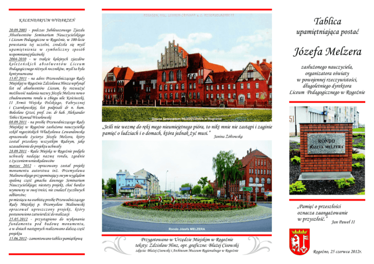 KALENDARIUM WYDARZEŃ Tablica 20.09.2003 - podczas Jubileuszowego Zjazdu Absolwentów Seminarium Nauczycielskiego i Liceum Pedagogiczne w Rogoźnie, w 100-lecie powstania tej uczelni, zrodziła się myśl upamiętnienia w symboliczny sposób wspomnianej placówki 2004-2010 - w trakcie kolejnych zjazdów koleżeńskich absolwentów Liceum Pedagogicznego różnych roczników, myśl ta była kontynuowana 13.07.2011 - na adres Przewodniczącego Rady Miejskiej w Rogoźnie Zdzisława Hinza wpłynął list od absolwentów Liceum, by rozważyć możliwość nadania nazwy Józefa Melzera nowo zbudowanemu rondu u zbiegu ulic Kościuszki, II Armii Wojska Polskiego, Fabrycznej i Czarnkowskiej, list podpisali dr n. hum. Bolesław Grześ, prof. zw. dr hab. Aleksander Tobis i Konrad Wesołowski 08.09.2011 - na prośbę Przewodniczącego Rady Miejskiej w Rogoźnie zasłużona nauczycielka szkół rogozińskich Władysława Lewandowska opracowała życiorys Józefa Melzera, który został przesłany wszystkim Radnym, jako uzasadnienie do projektu uchwały 28.09.2011 - Rada Miejska w Rogoźnie podjęła uchwałę nadając nazwę rondu, zgodnie z życzeniem wnioskodawców marzec 2012 - opracowany został projekt monumentu autorstwa inż. Przemysława Malinowskiego przypominający swym wyglądem spaloną część gmachu dawnego Seminarium Nauczycielskiego; niestety projekt, choć bardzo wymowny w swej treści, nie znalazł życzliwych odbiorców; po miesiącu na osobistą prośbę Przewodniczącego Rady Miejskiej p. Przemysław Malinowski opracował uproszczony projekt, który postanowiono zatwierdzić do realizacji 25.05.2012 - przystąpiono do wykonania fundamentu pod budowę monumentu, a w dniach następnych realizowano dalszą część projektu 15.06.2012 - zamontowano tablice pamiątkową upamiętniająca postać Józefa Melzera zasłużonego nauczyciela, organizatora oświaty w powojennej rzeczywistości, długoletniego dyrektora Liceum Pedagogicznego w Rogoźnie Dawne Seminarium Nauczycielskie w Rogoźnie „Jeśli nie wezmę do ręki mego nieumiejętnego pióra, to nikt mnie nie zastąpi i zaginie pamięć o ludziach i o domach, która jednak żyć musi.” Janina Żółtowska „Pamięć o przeszłości oznacza zaangażowanie w przyszłość.” Jan Paweł II Rondo Józefa MELZERA Przygotowano w Urzędzie Miejskim w Rogoźnie teksty: Zdzisław Hinz, opr. graficzne: Błażej Cisowski zdjęcia: Błażej Cisowski i Archiwum Muzeum Regionalnego w Rogoźnie Rogoźno, 25 czerwca 2012r. JÓZEF MELZER (1881-1965) Józef MELZER Uchwała Nr XIII/94/2011 Rady Miejskiej w Rogoźnie z dnia 28 września 2011 roku w sprawie nadania nazwy rondu w Rogoźnie Na podstawie art. 18 ust. 2 pkt 13 ustawy z dnia 8 marca 1990r. o samorządzie gminnym (Dz. U. z 2001r. Nr 142, poz. 1591 ze zm.) Rada Miejska uchwala, co następuje: § 1. Rondu u zbiegu ulic II Armii Wojska Polskiego, Kościuszki, Fabrycznej i Czarnkowskiej w Rogoźnie nadaje się nazwę: Rondo Józefa Melzera. § 2. Wykonanie uchwały powierza się Burmistrzowi Rogoźna. § 3. Uchwała wchodzi w życie po upływie 14 dni od ogłoszenia w Dzienniku Urzędowym Województwa Wielkopolskiego. Urodził się 31 marca 1881 we wsi Kamieniec położonej między Kościanem, a Grodziskiem w centrum Wielkopolski. Rodzina Jego była mocno związana z tradycjami i ruchem patriotycznym mieszkańców tej ziemi. Szkołę powszechną ukończył w rodzinnej wsi, a następnie kontynuował naukę w seminarium nauczycielskim, by uzyskać w 1902 roku upragniony zawód nauczyciela. Był prawdziwym Polakiem wychowanym w głębokich zasadach patriotycznych, więc nie mógł pogodzić się z tym, że zaborca pruski wymagał od niego stosowania zasad procesu germanizacji polskich dzieci. Dopiero wówczas zrozumiał jak trudnej podjął się roli zostając nauczycielem. Wykorzystywał więc każdą okazję, by rozwijać intelektualnie dzieci polskie i kształtować w nich polskiego ducha narodowego. Między innymi pomagały mu w tym lekcje religii prowadzone w języku polskim oraz funkcja organisty, którą pełnił przy miejscowym kościele. W czasie trwania I wojny światowej walczył na froncie wschodnim. Był też ranny ale szczęśliwie przetrwał okropności wojennej zawieruchy, by wrócić w 1918 roku do ukochanego zawodu nauczycielskiego. Był inicjatorem i organizatorem kursów dla nauczycieli, pomagając również przy organizowaniu polskiej administracji w wolnej Polsce. Na polecenie tamtejszego Starosty pełnił funkcję wójta gminnego w powiecie pleszewskim. Dekretem Regencji Pleszewskiej z dnia 1 maja 1918 roku został przeniesiony do świeżo organizowanego seminarium nauczycielskiego w Rogoźnie, pierwszego na terenie Wielkopolski, którego uroczyste otwarcie nastąpiło 15 maja 1918 roku. Tu w Rogoźnie pozostał do końca życia – choć z różnymi przerwami. W 1937 roku nastąpiła reorganizacja cyklu kształcenia nauczycieli. Zlikwidowano seminaria nauczycielskie, a utworzono 3-letnie licea pedagogiczne. Zreorganizowano również szkołę w Rogoźnie, a dyrektorem ówczesnego Liceum został właśnie Józef Melzer, który w następnych latach okazał się nie tylko wspaniałym pedagogiem, ale również wielkim społecznikiem. Na rozkaz Dowództwa Batalionu Obornickiego Obrony Narodowej zorganizował w 1939 roku Ochotniczą Kompanię Obrony Narodowej, która miała strzec obiektów wojskowych na tutejszym terenie. Po wejściu Niemców do Polski rozesłane zostały za Józefem Melzerem listy gończe. Poszukiwany został w czas ostrzeżony i ukryty w Poznaniu pod nazwiskiem Theirnerta, zatrudniony jako palacz i zamiatacz ulic. Szczęśliwie przetrwał czas wojny i został skierowany do organizowania szkolnictwa w Rogoźnie i powiecie. Całym sercem zaangażował się gromadząc kadrę nauczycielską a dla niekwalifikowanych organizował kursy przysposabiające do zawodu. W latach 1945-1948 pełnił funkcję Przewodniczącego Powiatowej Rady Narodowej w Obornikach. Ale 
