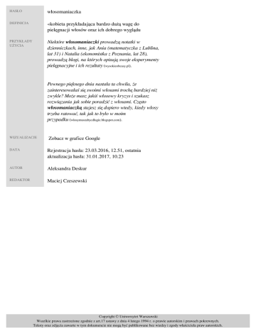 HASŁO włosomaniaczka DEFINICJA «kobieta przykładająca bardzo dużą wagę do pielęgnacji włosów oraz ich dobrego wyglądu» PRZYKŁADY UŻYCIA Niektóre włosomaniaczki prowadzą notatki w dzienniczkach, inne, jak Ania (matematyczka z Lublina, lat 31) i Natalia (ekonomistka z Poznania, lat 28), prowadzą blogi, na których opisują swoje eksperymenty pielęgnacyjne i ich rezultaty (wysokieobcasy.pl). Pewnego pięknego dnia nastała ta chwila, że zainteresowałaś się swoimi włosami trochę bardziej niż zwykle? Może masz jakiś włosowy kryzys i szukasz rozwiązania jak sobie poradzić z włosami. Często włosomaniaczką stajesz się dopiero wtedy, kiedy włosy trzeba ratować, tak jak to było w moim przypadku (wlosymuszabycdlugie.blogspot.com). WIZUALIZACJE Zobacz w grafice Google DATA Rejestracja hasła: 23.03.2016, 12.51, ostatnia aktualizacja hasła: 31.01.2017, 10.23 AUTOR Aleksandra Deskur REDAKTOR Maciej Czeszewski Copyright © Uniwersytet Warszawski Wszelkie prawa zastrzeżone zgodnie z art.17 ustawy z dnia 4 lutego 1994 r. o prawie autorskim i prawach pokrewnych. Teksty oraz zdjęcia zawarte w tym dokumencie nie mogą być publikowane bez wiedzy i zgody właściciela praw autorskich. Powered by TCPDF (www.tcpdf.org)