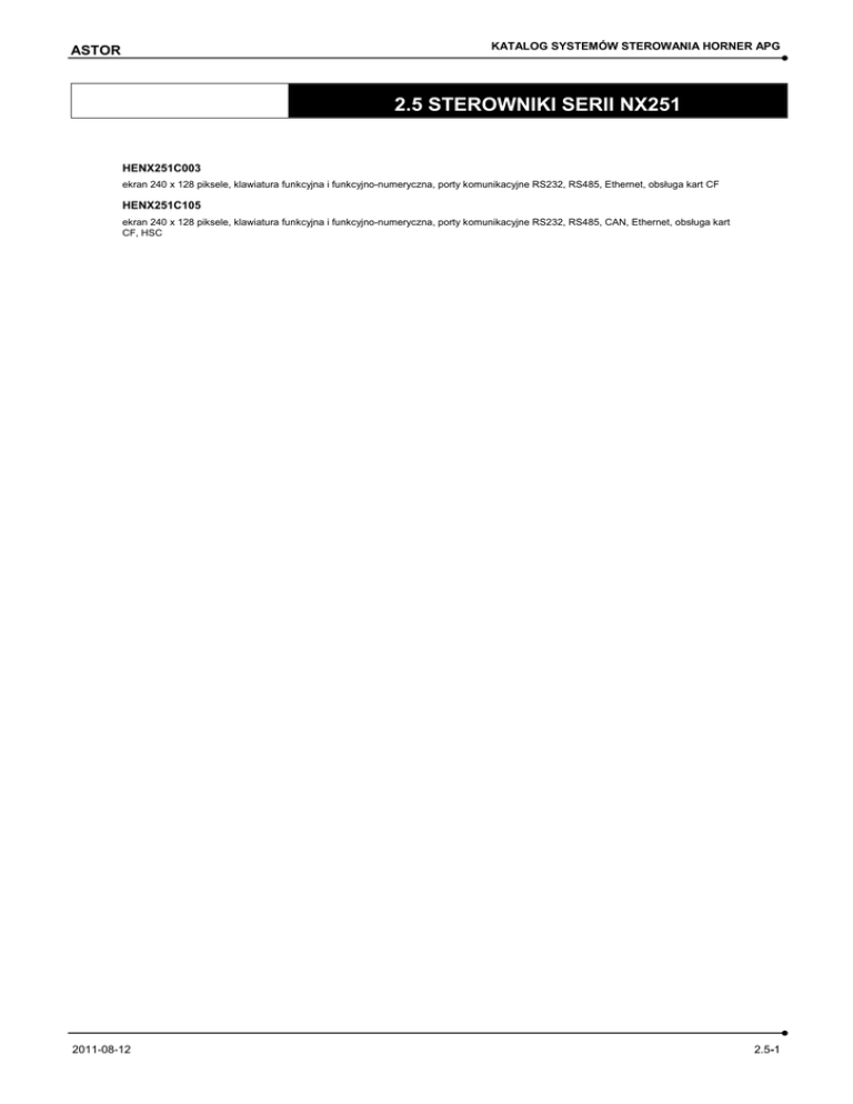 KATALOG SYSTEMÓW STEROWANIA HORNER APG ASTOR 2.5 STEROWNIKI SERII NX251 HENX251C003 ekran 240 x 128 piksele, klawiatura funkcyjna i funkcyjno-numeryczna, porty komunikacyjne RS232, RS485, Ethernet, obsługa kart CF HENX251C105 ekran 240 x 128 piksele, klawiatura funkcyjna i funkcyjno-numeryczna, porty komunikacyjne RS232, RS485, CAN, Ethernet, obsługa kart CF, HSC 2011-08-12 2.5-1 KATALOG SYSTEMÓW STEROWANIA HORNER APG ASTOR HENX251C003 • Monochromatyczny ekran graficzny o rozdzielczości 240 x 128 piksele • 256 kB pamięci przeznaczonej na program • Klawiatura funkcyjna i alfanumeryczna • 2 porty szeregowe RS232 i RS485. • Port Ethernet • Port światłowodowy do obsługi kaset FOX I/O • Programowanie sterownika przy pomocy połączenia szeregowego RS232 Jednostka centralna HENX251C003 umoŜliwia obsługę do czterech kaset rozszerzających SmartStack montowanych bezpośrednio na tylnej części sterownika. System moŜe zostać rozbudowany przy pomocy dodatkowych 5 układów FOX I/O, podłączanych do sterownika przy pomocy światłowodu. Inną moŜliwością rozbudowy jest zastosowanie układów SmartStix działających w protokole Profibus DP, Modbus RTU, CsCAN lub DeviceNet. Jednostka wyposaŜona jest w port Ethernet pracujący z prędkością 10/100 Mb/s oraz dwa porty komunikacyjne mogące pracować w standardzie RS232, RS422 lub RS485. Na kaŜdym z nich moŜna zaimplementować protokół: Allen-Bradley DF1, CsCAN, GE SNP, Modbus RTU Master i Modbus RTU Slave lub przełączyć w tryb wysyłania i odbierania znaków w kodzie ASCII. Połączenie ethernetowe pozwala na obsługę Web Serwera oraz protokołów EGD, SRTP, Ethernet IP oraz Modbus TCP Server, a dzięki rozbudowanemu menu systemowemu, do którego mamy dostęp wciskając odpowiedni skrót klawiszowy moŜemy konfigurować kontroler i podglądać wszystkie parametry pracy urządzenia. Obsługa kart CF umoŜliwia logowanie na dysku wymiennym bieŜących informacji dotyczących parametrów pracy oraz danych procesowych. Kontroler posiada zintegrowany, graficzny, podświetlany w dwóch kolorach panel operatorski o rozmiarach 240 x 128 pikseli. Funkcjonalność jednostki pozwala na budowę do 1023 ekranów z maksymalnie 50 aktywnymi obiektami na kaŜdym z nich. • Rozbudowa przy pomocy SmartStack i SmartMod • Obsługa opcjonalny modułów komunikacyjnych do sieci Profibus DP, CANopen, DeviceNet Jednostka centralna umoŜliwia wykorzystywanie procedur i regulatorów PID w programie sterującym oraz pozwala na wykonywanie operacji zmiennoprzecinkowych. Podtrzymywana bateryjnie pamięć umoŜliwia przechowywanie programu sterującego, danych oraz aktualnego czasu. • Port CompactFlash. Sterownik wyposaŜony jest w 2 diody LED: • Zasilanie 9 -30 VDC. 2.5-2 • OK – zaświecona informuje, Ŝe wszystkie testy wykonywane podczas uruchamiania sterownika zostały zakończone sukcesem. Zgaszona oznacza, Ŝe co najmniej jeden test nie zakończył się powodzeniem. • RUN – zgaszona informuje, Ŝe sterownik jest w trybie STOP. Mrugająca oznacza, Ŝe sterownik jest w trybie DO IO lub w trybie RUN, jednak brakuje programu logicznego. Zaświecona informuje o trybie RUN i poprawnym wykonywaniu programu logicznego. 2011-08-12 KATALOG SYSTEMÓW STEROWANIA HORNER APG ASTOR PARAMETRY Napięcie zasilające 10 ÷ 32 VDC Pobór prądu 0.4 A dla 24 VDC Prąd rozruchowy 28 A dla 1 ms przy 24 VDC Pamięć programu 256 kB Pamięć rejestrowa 32 kB Skan programu 0.2 ms/kB Obsługa funkcji zmiennoprzecinkowych TAK Obsługa HSC NIE Obsługa PWM NIE Maksymalna ilość sygnałów dyskretnych wejściowych/wyjściowych 2048/2048 Maksymalna ilość sygnałów analogowych wejściowych/wyjściowych 512/512 Rejestry 9999 Wewnętrzna pamięć bitowa 4096 Wyświetlacz graficzny 240 x 128 pikseli Skalowalna czcionka TAK Liczba ekranów 1023 Liczba obiektów na ekranie 50 Całkowita liczba klawiszy 20 Klawisze funkcyjne 10 Klawiatura alfanumeryczna TAK Diody LED 10 Liczba modułów montowanych na sterowniku – SmartStack maksymalnie 4 Interfejsy I/O SmartStack Fox I/O Port komunikacyjny RS232 RS422/485 Ethernet 10/100 Mbit Obsługiwane protokoły Modbus RTU Master Modbus RTU Slave Serial I/O Allen-Bradley DF1 CsCAN Serial GE SNP Opcje komunikacyjne Profibus DP Master Profibus DP Slave DeviceNet CANopen Master ASI Master Bateria bateria litowa, 3 V Ŝywotność – 4.5 roku Temperatura pracy 0 ÷ 50°C Wilgotność 5 ÷ 95% 2011-08-12 2.5-3 KATALOG SYSTEMÓW STEROWANIA HORNER APG ASTOR PORTY I POŁĄCZENIA Sterownik NX posiada 2 aktywne porty szeregowe wyprowadzone na 3 łączach. Port 1 i MJ1 nie mogą być wykorzystywane jednocześnie, natomiast port CN1 moŜe pracować równocześnie z jednym z nich. Port Złącze RS232 RS422 RS485 Programowanie Full Modem ASCII x x x x x x x * x x x x * x x x x Port 1 DE-9S x MJ1 RJ45 x X x CN1 10-pin x x x Styk Sygnał Funkcja 1 DCD Sygnał wyjściowy 2 RXD Sygnał wyjściowy Receive Data 3 TXD Sygnał wejściowy Transmitted Data 4 DTR Sygnał wejściowy Data Terminal Ready 5 GND Masa 6 DSR Sygnał wyjściowy 7 RTS Sygnał wejściowy Request to Send 8 CTS Sygnał wyjściowy Clear To Send 9 RI Sygnał wyjściowy Ring Indicate Styk Sygnał Funkcja 1 RX+ Sygnał wejściowy 2 RX- Sygnał wejściowy 3 TX+ Sygnał wyjściowy 4 TX- Sygnał wyjściowy 5 +5V Sygnał wyjściowy 6 0V - 7 RXD Sygnał wejściowy 8 TXD Sygnał wyjściowy Styk Sygnał Funkcja 1 TX+ Sygnał wyjściowy 2 TX- Sygnał wyjściowy 3 RX+ Sygnał wejściowy 4 RX- Sygnał wejściowy 5 TXD Sygnał wyjściowy 6 GND - 7 RXD Sygnał wejściowy 8 SHIELD - 9 +5V Sygnał wyjściowy 10 N/C - RTU Slave RTU Master Implementacja protokołu * - nie obsługują handshakeingu Port 1 Port MJ1 Port CN1 2.5-4 2011-08-12 KATALOG SYSTEMÓW STEROWANIA HORNER APG ASTOR Port Ethernet Sterownik wyposaŜony jest w 1 port sieci Ethernet (IEEE802.3). Połączenie następuje poprzez kabel (nieekranowany, skręcone pary, UTP CAT 5) do modułu poprzez wtyk RJ-45. Diodowe wska