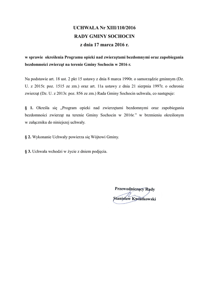 UCHWAŁA Nr XIII/110/2016 RADY GMINY SOCHOCIN z dnia 17 marca 2016 r. w sprawie określenia Programu opieki nad zwierzętami bezdomnymi oraz zapobiegania bezdomności zwierząt na terenie Gminy Sochocin w 2016 r. Na podstawie art. 18 ust. 2 pkt 15 ustawy z dnia 8 marca 1990r. o samorządzie gminnym (Dz. U. z 2015r. poz. 1515 ze zm.) oraz art. 11a ustawy z dnia 21 sierpnia 1997r. o ochronie zwierząt (Dz. U. z 2013r. poz. 856 ze zm.) Rada Gminy Sochocin uchwala, co następuje: § 1. Określa się „Program opieki nad zwierzętami bezdomnymi oraz zapobiegania bezdomności zwierząt na terenie Gminy Sochocin w 2016r.” w brzmieniu określonym w załączniku do niniejszej uchwały. § 2. Wykonanie Uchwały powierza się Wójtowi Gminy. § 3. Uchwała wchodzi w życie z dniem podjęcia. UZASADNIENIE do UCHWAŁY Nr XIII/110/2016 RADY GMINY SOCHOCIN z dnia 17 marca 2016 r. w sprawie określenia Programu opieki nad zwierzętami bezdomnymi oraz zapobiegania bezdomności zwierząt na terenie Gminy Sochocin w 2016 r. W związku z art. 11a ustawy z dnia 21 sierpnia 1997r. o ochronie zwierząt (Dz. U. z 2013r. poz. 856 ze zm.) Rada Gminy określa w drodze uchwały, corocznie do dnia 31 marca, program opieki nad zwierzętami bezdomnymi oraz zapobiegania bezdomności zwierząt. „Program opieki nad zwierzętami bezdomnymi oraz zapobiegania bezdomności zwierząt na terenie Gminy Sochocin w 2016r.” obejmuje swoim zakresem realizację takich zadań jak: 1) zapewnienie zwierzętom bezdomnym miejsca w schronisku; 2) sprawowanie opieki nad kotami wolno żyjącymi oraz ich dokarmianie; 3) odławianie zwierząt bezdomnych z terenu Gminy; 4) przeprowadzenie zabiegów sterylizacyjnych lub kastracji zwierząt przebywających w Schronisku; 5) poszukiwanie nowych właścicieli dla zwierząt bezdomnych; 6) usypianie ślepych miotów zwierząt bezdomnych; 7) wskazania gospodarstwa rolnego w celu zapewnienia miejsca dla zwierząt gospodarskich; 8) zapewnienie całodobowej opieki weterynaryjnej w przypadkach zdarzeń drogowych z udziałem zwierząt. Przyjęcie powyższego programu pozwoli ograniczyć na terenie Gminy Sochocin zjawisko bezdomności zwierząt, stanowiące zagrożenie dla ludzi oraz powodujące cierpienie zwierząt. W Programie wskazano podmioty zaangażowane w realizację programu, realizatorów programu oraz wysokość zaplanowanych kosztów na realizację programu. Projekt Programu był konsultowany z powiatowym lekarzem weterynarii, organizacją społeczną, której statutowym celem działania jest ochrona zwierząt oraz dzierżawcami lub zarządcami obwodów łowieckich, działającymi na obszarze gminy. W związku z powyższym uzasadnieniem przedkładam uchwałę w sprawie określenia Programu opieki nad zwierzętami bezdomnymi oraz zapobiegania bezdomności zwierząt na terenie Gminy Sochocin w 2016 r.