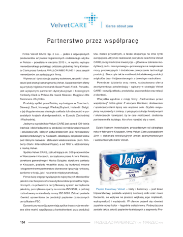 MAKULATURA Par tnerstwo pr zez współpracę Firma Velvet CARE Sp. z o.o. – jeden z największych tzw. marek prywatnych, a także ekspansja na inne rynki producentów artykułów higienicznych codziennego użytku europejskie. Aby móc realizować powyższe cele firma Velvet w Polsce – powstała w sierpniu 2013 r., w wyniku wykupu CARE poczyniła liczne inwestycje – głównie w zakresie mo- menedżerskiego polskiego oddziału globalnej firmy Kimber- dyfikacji parku maszynowego – pozwalające na zwiększenie ly-Clark przez fundusz AVALLON MBO FUND II oraz zespół mocy produkcyjnych i dodatkowe polepszenie technologii menedżerów zarządzających firmą. produkcji. Stworzyła także możliwości dodatkowej produkcji Wytwarza i dystrybuuje papiery toaletowe, ręczniki i chus- artykułów dwu- i trójwarstwowych z dowolnym nadrukiem. teczki pod znaną i uznaną marką Velvet. Uzupełnieniem oferty Powyższe działania oraz nowa, rozbudowana oferta są artykuły higieniczne marek Szast Prast i A’psik. Ponadto, asortymentowa potwierdzają – wpisany w strategię Velvet jest wyłącznym partnerem dystrybucyjnym i licencyjnym CARE – rozwój zakładu, produktów, pracowników oraz relacji Kimberly-Clark w Polsce dla marek Kleenex, Huggies Little z klientami. Swimmers i DryNites. Wszystko zgodnie z misją firmy „Partnerstwo przez Produkty spółki, poza Polską, są dostępne w Czechach, współpracę”, która głosi: Z naszymi klientami, dostawcami Słowacji, Danii, Norwegii, Wielkiej Brytanii, Holandii i Belgii, i społecznościami łączą nas wspólne cele. Szybko reagu- a jej długoterminowa strategia zakłada ich obecność w po- jemy na potrzeby i zmiany, z pasją poszukując kreatywnych zostałych krajach skandynawskich, w Europie Zachodniej i skutecznych rozwiązań, by te cele realizować. Jesteśmy i Wschodniej. partnerem dla każdego, kto chce rozwijać się z nami. Jednym z wyróżników Velvet CARE jest ponad 100-letnia tradycja i doświadczenie w produkcji wyrobów papierowych Dzięki licznym inwestycjom, prowadzonym od ubiegłego i celulozowych, których potwierdzeniem jest nowoczesny roku w fabryce w Kluczach, firma Velvet Care z początkiem zakład produkcyjny w Kluczach, działający od ponad wieku 2014 r. dokonała rewolucyjnych zmian asortymentowych pod różnymi nazwami i statusami właścicielskimi (m.in. Kim- i wizerunkowych marki Velvet. berly-Clark i International Paper), a od 1997 r. utożsamiany z marką Velvet. Spółka Velvet CARE, zatrudniająca ok. 300 pracowników w Warszawie i Kluczach, zarządzana przez Artura Pielaka, dyrektora generalnego i Marka Ściążko, dyrektora zakładu w Kluczach, posiada wszelkie atuty, by budować mocne i długoterminowe partnerstwa biznesowe i pozycję rynkową, zarówno w kraju, jak i na arenie międzynarodowej. Firma dużą wagę przywiązuje do najwyższych standardów jakości oraz bezpieczeństwa użytkowników produktów higienicznych, co potwierdza certyfikowany system zarządzania jakością, początkowo oparty na normie ISO 9002, a później Papier toaletowy Velvet – biały i kolorowy – jest teraz rozbudowany o standardy normy ISO 9001. Zakład posiada trójwarstwowy, posiada większą średnicę rolki oraz nowe również uprawnienia do produkcji papierów oznaczonych tłoczenia, co wpływa na jeszcze większą jego miękkość, certyfikatem FSC. wytrzymałość i wydajność. W ofercie pojawił się również Dynamiczny rozwój zapewniają spółce inwestycje we wła- zupełnie nowy kolor – łagodnie seledynowy. Podwyższona sne silne marki, współpraca z kontrahentami przy produkcji została także jakość papierów toaletowych z segmentu Pre- 134 PRZEGLĄD PAPIERNICZY · 70 · MARZEC 2014