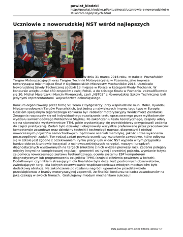 powiat_klodzki http://powiat.klodzko.pl/aktualnosci/uczniowie-z-noworudzkiej-n st-wsrod-najlepszych.html Uczniowie z noworudzkiej NST wśród najlepszych W dniu 31 marca 2016 roku, w trakcie Poznańskich Targów Motoryzacyjnych oraz Targów Techniki Motoryzacyjnej w Poznaniu, jako impreza towarzysząca miał miejsce finał V Ogólnopolskich Mistrzostw Mechaników 2016. Uczniowie Noworudzkiej Szkoły Technicznej zdobyli 13 miejsce w Polsce w kategorii Młody Mechanik. W konkursie wzięło udział 460 zespołów z całej Polski, a do ścisłego finału w Poznaniu zakwalifikowało się 30. Michał Majerczyk i Marcin Młynarczyk, czyli „NST03” z Noworudzkiej Szkoły Technicznej byli jedynymi reprezentantami województwa dolnośląskiego. Konkurs organizowany przez firmę V8 Team z Bydgoszczy, przy współudziale m.in. Mobil, Hyundai, Międzynarodowych Targów Poznańskich, jest jedną z największych imprez tego typu w Europie. Gościem specjalnym tegorocznego konkursu był redaktor motoryzacyjny Włodzimierz Zientarski. Zmagania rozpoczęły się od indywidualnego rozwiązania testu opracowanego przez wykładowców wydziału samochodowego Politechniki Śląskiej. Po zakończeniu testu teoretycznego, zespoły udały się na stanowiska wystawiennicze TTM, gdzie wystawiający się przedsiębiorcy przygotowali zadania do części praktycznej. Zadań było dziewięć i obejmowały wszystkie preferowane przez pracodawców kompetencje zawodowe oraz dziedziny techniki i technologii napraw, diagnostyki i obsługi nowoczesnych pojazdów samochodowych. Sędziowie oceniali metodykę, jakość i czas wykonania poszczególnych zadań. Ten rodzaj zadań pozwala ocenić czy kształcenie zawodowe, które odbywa się w szkole jest zgodne z oczekiwaniami rynku pracy i jak widać NST wypada w tym przypadku bardzo dobrze.Uczniowie korzystali z najnowocześniejszych narzędzi, maszyn i urządzeń diagnostycznych wystawianych na targach (niektóre z nich widzieli pierwszy raz). Zadania polegały między innymi na kompleksowej regulacji geometrii osi tylnej i przedniej pojazdu, wymianie łożysk za pomocą nowoczesnego zestawu hydraulicznego, ocenie systemu ESP komputerem diagnostycznym lub programowaniu czujników TPMS (czujniki ciśnienia powietrza w kołach). Dodatkowym czynnikiem stresującym dla finalistów była duża ilość postronnych obserwatorów, zwiedzających targi, dla których obserwowanie współzawodnictwa młodych mechaników było dodatkową atrakcją. Na zakończenie po rozdaniu nagród i upominków przedstawiciele przedsiębiorstw z branży motoryzacyjnej zapewnili, że finaliści konkursu to kadra zawodowców na jaką czekają w swoich firmach. Gratulujemy młodym mechanikom sukcesu! Data publikacji 2017-03-08 6:56:02, Strona: 1/1