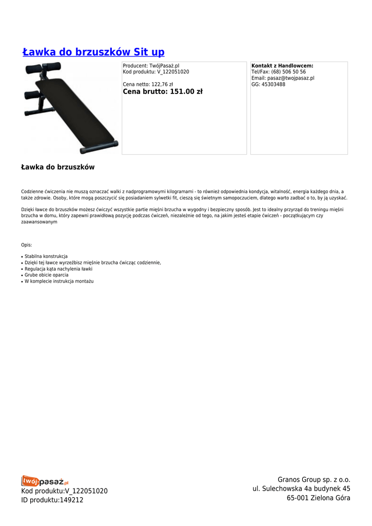 Ławka do brzuszków Sit up Producent: TwójPasaż.pl Kod produktu: V_122051020 Cena netto: 122,76 zł Kontakt z Handlowcem: Tel/Fax: (68) 506 50 56 Email: [email protected] GG: 45303488 Cena brutto: 151.00 zł Ławka do brzuszków Codzienne ćwiczenia nie muszą oznaczać walki z nadprogramowymi kilogramami - to również odpowiednia kondycja, witalność, energia każdego dnia, a także zdrowie. Osoby, które mogą poszczycić się posiadaniem sylwetki fit, cieszą się świetnym samopoczuciem, dlatego warto zadbać o to, by ją uzyskać. Dzięki ławce do brzuszków możesz ćwiczyć wszystkie partie mięśni brzucha w wygodny i bezpieczny sposób. Jest to idealny przyrząd do treningu mięśni brzucha w domu, który zapewni prawidłową pozycję podczas ćwiczeń, niezależnie od tego, na jakim jesteś etapie ćwiczeń - początkującym czy zaawansowanym Opis: ● ● ● ● ● Stabilna konstrukcja Dzięki tej ławce wyrzeźbisz mięśnie brzucha ćwicząc codziennie, Regulacja kąta nachylenia ławki Grube obicie oparcia W komplecie instrukcja montażu Kod produktu:V_122051020 ID produktu:149212 Granos Group sp. z o.o. ul. Sulechowska 4a budynek 45 65-001 Zielona Góra