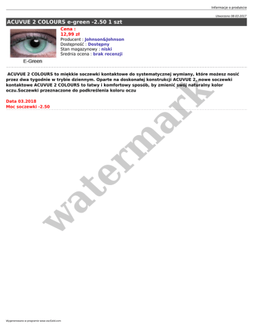 Informacje o produkcie Utworzono 08-03-2017 ACUVUE 2 COLOURS e-green -2.50 1 szt Cena : 12,99 zł Producent : Johnson&Johnson Dostępność : Dostępny Stan magazynowy : niski Średnia ocena : brak recenzji w at Data 03.2018 Moc soczewki -2.50 er m ar k ACUVUE 2 COLOURS to miękkie soczewki kontaktowe do systematycznej wymiany, które możesz nosić przez dwa tygodnie w trybie dziennym. Oparte na doskonałej konstrukcji ACUVUE 2, nowe soczewki kontaktowe ACUVUE 2 COLOURS to łatwy i komfortowy sposób, by zmienić swój naturalny kolor oczu.Soczewki przeznaczone do podkreślenia koloru oczu Wygenerowano w programie www.oscGold.com