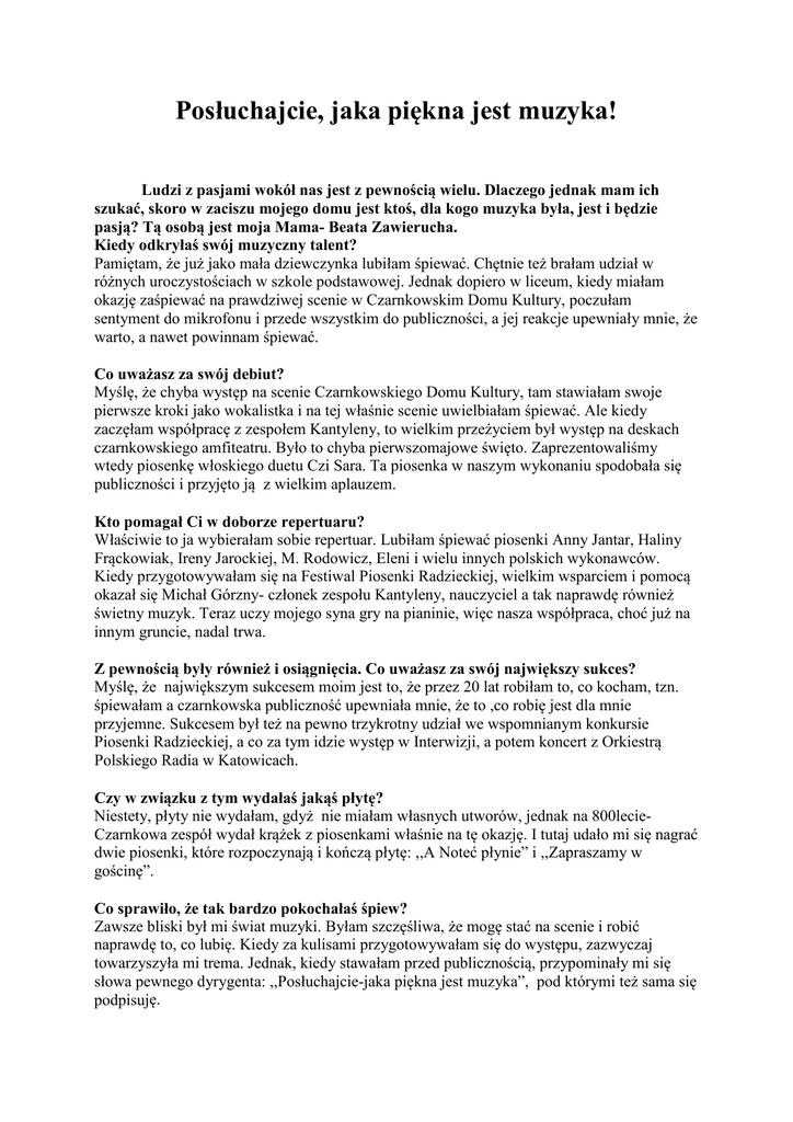 Posłuchajcie, jaka piękna jest muzyka! Ludzi z pasjami wokół nas jest z pewnością wielu. Dlaczego jednak mam ich szukać, skoro w zaciszu mojego domu jest ktoś, dla kogo muzyka była, jest i będzie pasją? Tą osobą jest moja Mama- Beata Zawierucha. Kiedy odkryłaś swój muzyczny talent? Pamiętam, że już jako mała dziewczynka lubiłam śpiewać. Chętnie też brałam udział w różnych uroczystościach w szkole podstawowej. Jednak dopiero w liceum, kiedy miałam okazję zaśpiewać na prawdziwej scenie w Czarnkowskim Domu Kultury, poczułam sentyment do mikrofonu i przede wszystkim do publiczności, a jej reakcje upewniały mnie, że warto, a nawet powinnam śpiewać. Co uważasz za swój debiut? Myślę, że chyba występ na scenie Czarnkowskiego Domu Kultury, tam stawiałam swoje pierwsze kroki jako wokalistka i na tej właśnie scenie uwielbiałam śpiewać. Ale kiedy zaczęłam współpracę z zespołem Kantyleny, to wielkim przeżyciem był występ na deskach czarnkowskiego amfiteatru. Było to chyba pierwszomajowe święto. Zaprezentowaliśmy wtedy piosenkę włoskiego duetu Czi Sara. Ta piosenka w naszym wykonaniu spodobała się publiczności i przyjęto ją z wielkim aplauzem. Kto pomagał Ci w doborze repertuaru? Właściwie to ja wybierałam sobie repertuar. Lubiłam śpiewać piosenki Anny Jantar, Haliny Frąckowiak, Ireny Jarockiej, M. Rodowicz, Eleni i wielu innych polskich wykonawców. Kiedy przygotowywałam się na Festiwal Piosenki Radzieckiej, wielkim wsparciem i pomocą okazał się Michał Górzny- członek zespołu Kantyleny, nauczyciel a tak naprawdę również świetny muzyk. Teraz uczy mojego syna gry na pianinie, więc nasza współpraca, choć już na innym gruncie, nadal trwa. Z pewnością były również i osiągnięcia. Co uważasz za swój największy sukces? Myślę, że największym sukcesem moim jest to, że przez 20 lat robiłam to, co kocham, tzn. śpiewałam a czarnkowska publiczność upewniała mnie, że to ,co robię jest dla mnie przyjemne. Sukcesem był też na pewno trzykrotny udział we wspomnianym konkursie Piosenki Radzieckiej, a co za tym idzie występ w Interwizji, a potem koncert z Orkiestrą Polskiego Radia w Katowicach. Czy w związku z tym wydałaś jakąś płytę? Niestety, płyty nie wydałam, gdyż nie miałam własnych utworów, jednak na 800lecieCzarnkowa zespół wydał krążek z piosenkami właśnie na tę okazję. I tutaj udało mi się nagrać dwie piosenki, które rozpoczynają i kończą płytę: ,,A Noteć płynie” i ,,Zapraszamy w gościnę”. Co sprawiło, że tak bardzo pokochałaś śpiew? Zawsze bliski był mi świat muzyki. Byłam szczęśliwa, że mogę stać na scenie i robić naprawdę to, co lubię. Kiedy za kulisami przygotowywałam się do występu, zazwyczaj towarzyszyła mi trema. Jednak, kiedy stawałam przed publicznością, przypominały mi się słowa pewnego dyrygenta: ,,Posłuchajcie-jaka piękna jest muzyka”, pod którymi też sama się podpisuję. Czy Twoje zamiłowanie do śpiewu to rodzinny talent? Być może odziedziczyłam go po mojej mamie, która pięknie śpiewała, ale nigdy nie zaznała tak cudownych chwil jak ja. Mój dziadek też miał talent wokalny- a kiedy był młody, grał na puzonie i perkusji. Jednakże swój talent przede wszystkim zawdzięczam stwórcy. Bóg obdarzył nas talentami- i to od nas zależy, czy robimy z nich właściwy użytek. Myślę, że ja wykorzystałam swoją szansę i nie zmarnowałam tego, co zostało mi ofiarowane. Czy masz jakieś marzenie związane z muzyką? O tak. Chciałabym jeszcze użyć swojego głosu, żeby słuchacze mogli pochwycić walory muzyki. Dziś niestety nie występuję już publicznie. Czasami tylko proszona jestem o uatrakcyjnienie jakiejś miejscowej uroczystości. Zawsze czynię to z wielką przyjemnością. Kocham muzykę i śpiew, a to chyba najważniejsze. Dziękuje Mamo za udzielenie wywiadu. Jestem z Ciebie dumny. Wierzę, że nie raz jeszcze świat usłyszy, jak wiele masz do powiedzenia. Jan Zawierucha (Szkoła Podstawowa im. Kornela Makuszyńskiego w Boruszynie)