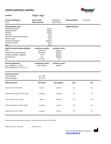KARTA KONTROLI JAKOŚCI Kligler Agar