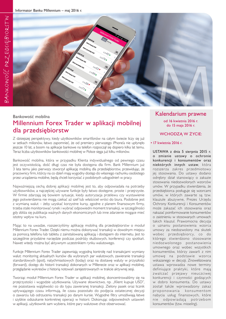 BANKOWOŚĆ PRZ EDSIĘBIORSTW Informator Banku Millennium – maj 2016 r. Bankowość mobilna Millennium Forex Trader w aplikacji mobilnej dla przedsiębiorstw Z dzisiejszej perspektywy, kiedy użytkowników smartfonów na całym świecie liczy się już w setkach milionów, łatwo zapomnieć, że od premiery pierwszego iPhone’a nie upłynęło jeszcze 10 lat, a boom na aplikacje bankowe na telefon rozpoczął się dopiero kilka lat temu. Teraz liczba użytkowników bankowości mobilnej w Polsce sięga już kilku milionów. Bankowość mobilna, która w przypadku Klienta indywidualnego od pewnego czasu jest oczywistością, dość długi czas nie była dostępna dla firm. Bank Millennium już 3 lata temu jako pierwszy stworzył aplikację mobilną dla przedsiębiorstw, przewidując, że pracownicy firm, którzy na co dzień mają wygodny dostęp do własnego rachunku osobistego przez urządzenia mobilne, będą chcieli korzystać z podobnych udogodnień w pracy. Najważniejszą cechą dobrej aplikacji mobilnej jest to, aby odpowiadała na potrzeby użytkowników, a najczęściej używane funkcje były łatwo dostępne, proste i przejrzyste. W firmie zdarzają się bowiem sytuacje, kiedy autoryzacja przelewu czy wystawienie jego potwierdzenia nie mogą czekać aż szef lub właściciel wróci do biura. Podobnie jest z wymianą walut – żeby uzyskać korzystne kursy, zgodne z planem finansowym firmy, trzeba stale monitorować rynek i wybrać odpowiedni moment transakcji, w szczególności gdy zbliża się publikacja ważnych danych ekonomicznych lub inne zdarzenie mogące mieć istotny wpływ na kurs. Mając to na uwadze, rozszerzyliśmy aplikację mobilną dla przedsiębiorstw o moduł Millennium Forex Trader. Dzięki niemu można dokonywać transakcji w dowolnym miejscu za pomocą telefonu lub tabletu z zainstalowaną aplikacją i dostępem do internetu. Jest to szczególnie przydatne narzędzie podczas podróży służbowych, konferencji czy spotkań. Nawet wtedy można być aktywnym uczestnikiem rynku walutowego. Funkcje Millennium Forex Trader zapewniają wygodną kontrolę nad transakcjami wymiany walut: monitoring aktualnych kursów dla wybranych par walutowych, zawieranie transakcji standardowych (spot), natychmiastowych (today) oraz na dostawę waluty w przyszłości (forward), dostęp do historii transakcji dokonanych w Millenecie oraz w aplikacji mobilnej, przeglądanie wykresów z historią notowań zarejestrowanych w trakcie aktywnej sesji. Tworząc moduł Millennium Forex Trader w aplikacji mobilnej, skoncentrowaliśmy się na przejrzystości i wygodzie użytkowania. Używane słownictwo, np. „Klient kupuje USD”, nie pozostawia wątpliwości co do typu zawieranej transakcji. Zielony pasek oraz licznik upływającego czasu informują, ile czasu pozostało do podjęcia ostatecznej decyzji o zawarciu lub odrzuceniu transakcji po danym kursie. Wygodne filtry umożliwiają łatwe i szybkie odszukanie konkretnej operacji w historii. Dokonując odpowiednich ustawień w aplikacji, użytkownik sam wybiera, które pary walutowe chce obserwować. Kalendarium prawne od 16 kwietnia 2016 r. do 15 maja 2016 r. WCHODZĄ W ŻYCIE: •17 kwietnia 2016 r. USTAWA z dnia 5 sierpnia 2015 r. o zmianie ustawy o ochronie konkurencji i konsumentów oraz niektórych innych ustaw, k tóra rozszer za zakres pr zedmiotowy jej stosowania. Do ustawy dodano odrębny dział stanowiący o zakazie stosowania niedozwolonych wzorców umów. W przypadku stwierdzenia, że przedsiębiorca posługuje się wzorcami umów, w których zawarte są tzw. klauzule abuzywne, Prezes Urzędu Ochrony Konkurencji i Konsumentów może zakazać ich stosowania oraz nakazać poinformowanie konsumentów o zaistnieniu w stosowanych umowach takich klauzul. Prawomocna decyzja o uznaniu postanowienia wzorca umowy za niedozwolony ma skutek wobec pr zedsiębiorcy, co do którego stwierdzono stosowanie niedoz wolonego pos tanowienia umownego oraz wobec wszystkich konsumentów, którzy zawarli z nim umowę na podstawie wzorca wskazanego w decyzji. Znowelizowana ustawa wprowadza nowe terminy def iniujące prak tyki, k tóre mają z walczać pr zejaw y nieuczciwej konkurencji i czynności godzących w dobro konsumenta. Do ustawy został tak że wprowadzony zakaz proponowania konsumentom nabycia usług finansowych, które n i e o d p ow ia d a j ą p ot r ze b o m konsumentów (tzw. misseling). Dostęp do modułu Millennium Forex Trader może mieć każdy użytkownik systemu Millenet, który posiada uprawnienia do funkcji wymiany walut. Nie jest wymagane zawarcie dodatkowej umowy lub składanie odrębnych formularzy. Użytkownicy aplikacji mobilnej mogą korzystać z nowego modułu niezwłocznie po dokonaniu aktualizacji aplikacji. Pozostałe osoby muszą pobrać aplikację z Google Play lub App Store i ją aktywować. Ryzyko wykorzystania informacji zamieszczonych w niniejszej publikacji, w szczególności w zakresie podejmowania na ich podstawie decyzji inwestycyjnych, ponosi wyłącznie jej odbiorca. Transakcje finansowe wiążą się z ryzykiem, szczegółowo przedstawionym w „Opisie ryzyka związanego z instrumentami i produktami finansowymi”, dostępnym w placówkach i na stronie internetowej Banku www.bankmillennium.pl. Prognozy makroekonomiczne Nowa RPP, perspektywy polityki pieniężnej niezmienione W k wietniow ym posiedzeniu Rady Polityki Pieniężnej (RPP) uczestniczyli wszyscy jej nowo powołani członkowie. Obradując w pełnym składzie, RPP u tr z y ma ł a s topy procentowe na niezmienionym poziomie, co było decy zją zgodną z oc zek iwaniami. Wymowa komunikatu opublikowanego po posiedzeniu nie odbiega znacząco od komunikatów z poprzednich miesięcy. Rada podtrzymała ocenę, że w świetle dostępnych danych i prognoz obecny poziom stóp sprzyja utrzymaniu polskiej gospodarki na ścieżce zrównoważonego w zros tu or a z poz wala zachować równowagę mak roekonomiczną . Zawar te w komunikacie stwierdzenie w 