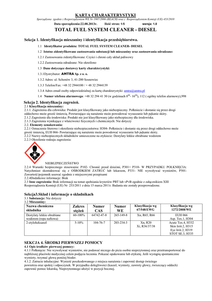 KARTA CHARAKTERYSTYKI Sporządzona zgodnie z Rozporządzeniem WE Nr 1907/2006 (REACH) oraz z Rozporządzeniem Komisji (UE) 453/2010 Data sporządzenia:22.08.2013r. Ilość stron: 1/5 wersja: 1.0 TOTAL FUEL SYSTEM CLEANER - DIESEL Sekcja 1. Identyfikacja mieszaniny i identyfikacja przedsiębiorstwa. 1.1 Identyfikator produktu: TOTAL FUEL SYSTEM CLEANER- DIESEL 1.2 Istotne zidentyfikowane zastosowania substancji lub mieszaniny oraz zastosowania odradzane: 1.2.1 Zastosowania zidentyfikowane: Czyści i chroni cały układ paliwowy 1.2.2 Zastosowania odradzane: Nie określono 1.3 Dane dotyczące dostawcy karty charakterystyki: 1.3.1Dystrybutor: AMTRA Sp. z o. o. 1.3.2 Adres: ul. Schonów 3, 41-200 Sosnowiec 1.3.3 Telefon/Fax: +48 32 2944100 / + 48 32 2944139 1.3.4 Adres email osoby odpowiedzialnej za kartę charakterystyki: [email protected] 1.4 Numer telefonu alarmowego: +48 32 294 41 30 (w godzinach 800- 1600), 112 ( ogólny telefon alarmowy),998 Sekcja 2. Identyfikacja zagrożeń. 2.1 Klasyfikacja mieszaniny: 2.1.1. Zagrożenia dla człowieka: Produkt jest klasyfikowany jako niebezpieczny. Połkniecie i dostanie się przez drogi oddechowe może grozić śmiercią. Powtarzające się narażenie może powodować wysuszanie lub pękanie skóry. 2.1.2 Zagrożenie dla środowiska: Produkt nie jest klasyfikowany jako niebezpieczny dla środowiska. 2.1.3 Zagrożenia wynikające z właściwości fizycznych i chemicznych: Nie dotyczy 2.2. Elementy oznakowania: 2.2.1 Oznaczenie literowe i określenie niebezpieczeństwa: H304- Połkniecie i dostanie się przez drogi oddechowe może grozić śmiercią, EUH 066- Powtarzające się narażenie może powodować wysuszanie lub pękanie skóry. 2.2.2 Nazwy niebezpiecznych składników umieszczone na etykiecie: Destylaty lekkie obrabiane wodorem 2.2.3 Określenie rodzaju zagrożenia: NIEBEZPIECZEŃSTWO 2.2.4 Warunki bezpiecznego stosowania: P102- Chronić przed dziećmi, P301+ P310- W PRZYPADKU POŁKNIĘCIA: Natychmiast skontaktować się z OŚRODKIEM ZATRUĆ lub lekarzem, P331- NIE wywoływać wymiotów, P501Zawartość/pojemnik usuwać zgodnie z miejscowymi przepisami 2.2.4Dodatkowe informacje: Brak 2.3 Inne zagrożenia: Brak informacji na temat spełniania kryteriów PBT lub vPvB zgodnie z załącznikiem XIII Rozporządzenia Komisji (UE) Nr 253/2011 z dnia 15 marca 2011r. Badania nie zostały przeprowadzone. Sekcja3.Skład i informacje o składnikach 3.1 Substancje: Nie dotyczy 3.2 Mieszaniny: Nazwa chemiczna składnika Zakres stężeń Numer CAS Numer WE Klasyfikacja wg 67/548/EWG Klasyfikacja wg 1272/2008/WE Destylaty lekkie obrabiane wodorem (ropa naftowa) 2-etyloheksanol 60-100% 64742-47-8 265-149-8 Xn, R65, R66 5-10% 104-76-7 203-234-3 Xn, R20 Xi, R36/37/38 EUH 066 Asp. Tox.1, H304 Acute Tox.4, H332 Skin Irrit.2, H315 Eye Irrit.2, H319 STOT SE.3, H335 SEKCJA 4. ŚRODKI PIERWSZEJ POMOCY 4.1 Opis środków pierwszej pomocy: 4.1.1 Połknięcie: Nie wywoływać wymiotów, nie podawać niczego do picia osobie nieprzytomnej oraz przetransportować do najbliższej placówki medycznej celem podjęcia leczenia. Pokazać opakowanie lub etykietę. Jeśli wystąpią spontanicznie wymioty, trzymać głowę poniżej bioder. 4.1.2. Zatrucie inhalacyjne: Wynieść poszkodowanego z miejsca narażenia i zapewnić dostęp świeżego powietrza oraz spokój i odpoczynek. W przypadku dolegliwości (kaszel, wymioty, zawroty głowy, świszczący oddech) zapewnić pomoc lekarską. Nieprzytomnego ułożyć w pozycji bocznej. KARTA CHARAKTERYSTYKI Sporządzona zgodnie z Rozporządzeniem WE Nr 1907/2006 (REACH) oraz z Rozporządzeniem Komisji (UE) 453/2010 Data sporządzenia:22.08.2013r. Ilość stron: 2/5 wersja: 1.0 TOTAL FUEL SYSTEM CLEANER - DIESEL 4.1.3. Skażenie skóry: Zdjąć skażoną odzież. Skórę zmyć ciepłą wodą z mydłem. W razie wystąpienia podrażnienia skóry skontaktować się z lekarzem. 4.1.4.Skażenie oczu: Jeżeli poszkodowany nosi szkła kontaktowe niezwłocznie je wyjąć. Dokładnie przemyć oczy dużą ilością wody przez co najmniej 15 minut, wywijając powieki. Zapewnić pomoc okulisty. Uwaga: osoby narażone na skażenie oczu powinny być pouczone o konieczności i sposobie natychmiastowego płukania oczu 4.2 Najważniejsze ostre i opóźnione objawy oraz skutki narażenia: 4.2.1 Skażenie oczu: Może wystąpić podrażnienie, zaczerwienienie oraz łzawienie 4.2.2 Połknięcie: Mogą pojawić się mdłości, wymioty oraz ból brzucha. W wyniku połknięcia lub wymiotów, kropelki produktu mogą dostać się do płuc, powodując chemiczne zapalenie płuc 4.2.3Wdychanie: Opary mogą powodować senność i zawroty głowy. 4.2.4 Skóra: Może powodować podrażnienie. 4.3 Wskazania dotyczące wszelkiej natychmiastowej pomocy lekarskiej i szczególnego postępowania z poszkodowanym: Podjąć leczenie objawowe. SEKCJA 5. POSTĘPOWANIE W PRZYPADKU POŻARU 5.1 Środki gaśnicze: 5.1.1 Odpowiednie środki gaśnicze: Mgła wodna, CO2, proszek gaśniczy, pianę odporna na alkohol 5.1.2 Niewłaściwe środki gaśnicze: Zwarty strumień wody 5.2 Szczególne zagrożenia związane z mieszaniną: W wyniku działania podwyższonej temperatury mogą wydzielać się toksyczne gazy, tlenki węgla. 5.3 Informacje dla straży pożarnej: Środki ochrony ogólnej typowe w przypadku pożaru. Nie należy przebywać w zagrożonej ogniem strefie bez odpowiedniego ubrania odpornego na chemikalia i aparatu do oddychania z niezależnym obiegiem powietrza. Zagrożone pożarem zbiorniki usunąć jeśli to możliwe i nie wiąże się z nadmiernym ryzykiem lub chłodzić rozpyloną wodą z odpowiedniej odległości. SEKCJA 6. POSTĘPOWANIE W PRZYPADKU NIEZAMIERZONEGO UWOLIENIA DO ŚRODOWISKA 6.1 Indywidualne środki ostrożności, wyposażenie ochronne i procedury w sytuacjach awaryjnych: 6.1.1 Dla osób niezależących do personelu likwidującego skutki awarii: Ograniczyć dostęp osób postronnych do obszaru awarii do czasu usunięcia awarii. W przypadku dużych wycieków 