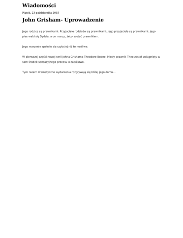 Wiadomości Piątek, 23 października 2015 John Grisham- Uprowadzenie Jego rodzice są prawnikami. Przyjaciele rodziców są prawnikami. Jego przyjaciele są prawnikami. Jego pies wabi się Sędzia, a on marzy, żeby zostać prawnikiem. Jego marzenie spełniło się szybciej niż to możliwe. W pierwszej części nowej serii Johna Grishama Theodore Boone. Młody prawnik Theo został wciągnięty w sam środek sensacyjnego procesu o zabójstwo. Tym razem dramatyczne wydarzenia rozgrywają się bliżej jego domu…
