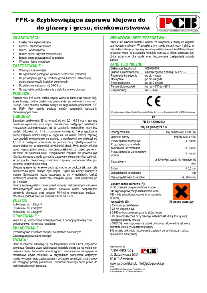 FFK-s Szybkowiążąca zaprawa klejowa do do glazury i gresu, cienkowarstwowa WŁAŚCIWOŚCI : Elastyczna i szybkowiążąca Cienko- i średniowarstwowa Mrozo- i wodoodporna Bardzo szybki przyrost wytrzymałości Bardzo dobra przyczepność do podłoża Wydajna i łatwa w obróbce ZASTOSOWANIE : Wewnątrz i na zewnątrz Na ogrzewanie podłogowe i podłoże schłodzone (chłodnie) Do przyklejania glazury, terakoty, gresu, kamionki szlachetnej, płytek elewacyjnych, kształtek betonowych Do płytek nie większych niż 30x30 cm Na wszystkie podłoża włącznie z płytą kartonowo-gipsową PODŁOŻE : Podłoże musi być suche, nośne, czyste, wolne od kurzu oraz resztek oleju szalunkowego. Luźne części oraz pozostałości po powłokach malarskich usunąć. Silnie chłonne podłoża zwilżyć lub zagruntować podkładem PGC lub PGP. Przy ocenie podłoża należy uwzględnić wskazania obowiązujących norm. WSKAZÓWKI BEZPIECZEŃSTWA : Produkt ten zawiera cement i wapno. W połączeniu z wodą lub wilgocią daje odczyn alkaliczny. W związku z tym należy chronić oczy i skórę. W przypadku zetknięcia zaprawy ze skórą, należy miejsce kontaktu przemyć dokładnie wodą. W przypadku kontaktu zaprawy z okiem konieczne jest obfite przemycie oka wodą oraz bezzwłoczne zasięgnięcie porady lekarza. DANE TECHNICZNE : Deklaracja Zgodności Jakość i niezawodność Fugowanie i chodzenie Obciążenie Pełne obciążenie Temperatura obróbki Zużycie wody Wyprodukowano : Hufgard Optolith Bauprodukte Polska Sp. z o. o. ul. Rząsawska 40/42, 42-209 Częstochowa OBRÓBKA : Zawartość opakowania 25 kg wsypać do ok. 6,0 - 6,5 l wody, zaprawę dokładnie wymieszać przy użyciu powszechnie dostępnych wiertarek z mieszadłem wolnoobrotowym, aż do uzyskania jednorodnej masy bez grudek. Odczekać ok. 1 min. i ponownie wymieszać. Tak przygotowaną porcję zaprawy należy zużyć w ciągu ok. 20 minut. Świeżą zaprawę rozprowadzić równomiernie na podłożu o powierzchni nie większej niż 1,5 m2, a następnie przeczesać za pomocą pacy zębatej o wielkości zębów dobranych w zależności od wielkości płytek. Płytki należy układać przed rozpoczęciem procesu tworzenia „naskórka”, tzn. przed upływem 10 minut od nałożenia kleju. Przygotowana zaprawa nie powinna być również mieszana z wodą czy suchą zaprawą w celu zmiany konsystencji. W przypadku częściowego związania zaprawy, niedopuszczalne jest ponowne jej rozrabianie wodą. Ułożoną glazurę lub terakotę docisnąć mocno do podłoża tak, aby cała powierzchnia płytki pokryta była klejem. Płytek nie należy moczyć w wodzie. Spoinowanie można rozpocząć po ok. 4 godzinach. Unikać punktowych obciążeń, zwłaszcza krawędzi płytek. Pełne obciążenie po ok. 3 dniach. Świeżą zaprawę należy chronić przed wpływem niekorzystnych warunków R atmosferycznych takich jak (mróz, porywiste wiatry, bezpośrednie promienie słoneczne oraz deszcz). Minimalna temperatura podłoża i otoczenia podczas prac nie powinna niższa niż +5ºC. ZUŻYCIE : 4x4x4 mm - ok. 1,8 kg/m² 6x6x6 mm - ok. 2,5 kg/m² 8x8x8 mm - ok. 3,6 kg/m² OPAKOWANIE : Worki 25 kg, wzmocnione worki papierowe, z podwójną wkładką z folii poliuretanowej. 48 worków na palecie. SKŁADOWANIE : Przechowywać w suchym miejscu, na paletach drewnianych. Czas magazynowania: 6 miesięcy 009/030409 Spoiwo zgodne z normą PN-EN 197 po ok. 4 godz. po ok. 24 godz. po ok. 3 dniach od do +5ºC do +25ºC ok 6,0-6,5 l 07 PN EN 12004:2002 Klej do glazury FFK-s Rodzaj produktu Odnośne normy Przyczepność początkowa Przyczepność po cyklach zamrażania i rozmrażania Przyczepność po zanurzeniu w wodzie Czas otwarty klej cementowy, C2TF, S2 PN EN 12004:2002 ≥ N/mm2 ≥ N/mm2 ≥ N/mm2 ≥ N/mm2 po czasie nie krótszym niż min. Spływ Odkształcenie poprzeczne Czas przydatności do obróbki - zasady bezpieczeństwa (R): 37/38 działa na drogi oddechowe i skórę R41 Ryzyko poważnego uszkodzenia oczu R43 może powodować uczulenie w kontakcie ze skórą - wskazówki (S): Xi środek drażniący S 2 chronić przed dziećmi S 22 nie wdychać pyłu S 24/25 unikać zanieczyszczenia skóry i oczu S 26 zanieczyszczone oczy przemyć natychmiast dużą ilością wody i zasięgnąć porady lekarza S 36/37/39 nosić odpowiednią odzież ochronną, odpowiednie rękawice ochronne i okulary lub ochronę twarzy S46 w razie połknięcia niezwłocznie zasięgnij porady lekarza – pokaż opakowanie lub etykietę UWAGA : Dane techniczne odnoszą się do temperatury 20ºC i 65% wilgotności powietrza. Opisane wyżej właściwości materiału oparte są na wieloletnim doświadczeniu i badaniach laboratoryjnych. Producent nie ma wpływu na niewłaściwe użycie materiału. W przypadkach powierzchni wątpliwych należy wykonać testy zastosowania i dokładnie sprawdzić jakość próby lub zasięgnąć porady producenta. Producent zastrzega sobie prawo do technicznych zmian produktu. ≤ 0,5 mm npd ok. 20 minut. Wyprodukowano dla : PCB-Polska Sp.j. ul. Szczawiowa 53D 70-010 Szczecin www.pcb-polska.pl; [email protected] przez Hufgard Optolith Bauprodukte Polska Sp. z o.o. ul. Rząsawska 40/42, 42-209 Częstochowa