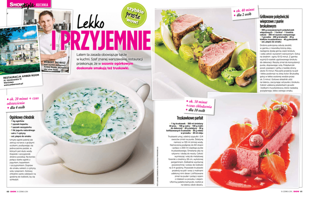 Show KUCHNIA Lekko ≠ szyb kie t • ok. 40 minu • dla 2 osób proste wo w! i przyjemnie ROBERT SKUBISZ szef kuchni restauracji Amber Room. Wyznawca idei slow food. • 500 g oczyszczonych polędwiczek wieprzowych • 1 brokuł • 1 średnia cebula • 300 ml wywaru warzywnego • 1 gruszka • 200 g brukselki • 20 g kiełków musztardowca • 40 g pieczarek • sol, pieprz do smaku Drobno pokrojoną cebulę zeszklij w garnku z niewielką ilością oleju, następnie dodaj górną część brokułu i zalej całość wywarem warzywnym. Gotuj na średnim ogniu 10-12 minut. Z garnka wyjmij 6 rozetek ugotowanego brokułu do dekoracji. Resztę zmiel do konsystencji purée, doprawiając solą. Polędwiczki posól, popieprz i grilluj z każdej strony około 15 minut. Pieczarki przekrój na pół i lekko podsmaż na złoty kolor. Brukselkę gotuj w lekko osolonej wodzie przez ok. 5 minut. Gotowe składniki ułóż na talerzu, zaczynając od purée z brokułu. Całość udekoruj plasterkami gruszki i kiełkami musztardowca, które nadadzą pożądanego, lekko ostrego smaku. Latem ta zasada obowiązuje także w kuchni. Szef znanej warszawskiej restauracji przekonuje, że w sezonie ogórkowym doskonale smakują też truskawki. OOM aMBER R Restauracieja 13 Al. Ujazdowsk Warszawa oom.pl www.amberr • ok. 20 minut + czas odstawienia • dla 4 osób • ok. 50 minut +czas chłodzenia • dla 10 osób Ogórkowy chłodnik Truskawkowe parfait • 1 kg ogórków • 1 pęczek koperku • 1 pęczek szczypiorku • 1 litr jogurtu naturalnego • sok z 1 cytryny • sol, pieprz do smaku 60 show, 16 czerwca 2014 • 1 kg truskawek • 500 ml śmietany 30 proc. • 100 g cukru • 100 g malin do dekoracji • 40 g żelatyny • 50 g liofilizowanych truskawek • 50 g mleka w proszku • 20 ml oleju FOT. ŁUKASZ ZANDECKI (3), MATERIAŁY PRASOWE (2) Umyte ogórki pokrój lub zetrzyj na tarce z grubymi oczkami, pozbywając się jednocześnie pestek, w których jest dużo wody. Koperek i szczypiorek drobno posiekaj. Na koniec połącz starte ogórki z jogurtem, koperkiem i szczypiorkiem. Dopraw do smaku sokiem z cytryny, solą i pieprzem. Gotowy chłodnik warto odstawić na godzinę do lodówki, by się schłodził. Grillowane polędwiczki wieprzowe z purée brokułowym Truskawki umyj, odetnij szypułki i 3/4 owoców zmiel na purée. Żelatynę namocz w 120 ml zimnej wody. Namoczoną podgrzej do 60 stopni i połącz z 200 ml ciepłego purée truskawkowego. Śmietanę ubij na sztywno i dodaj do reszty. Całość wymieszaj i wlej do metalowej foremki o średnicy 28 cm, wyłożonej pergaminem. Delikatnie wyrównaj powierzchnię i wstaw do lodówki na 3-4 godziny. Pozostałe truskawki przekrój na pół i wraz z malinami udekoruj nimi deser. Liofilizowane zmiel na puder i połącz razem z mlekiem w proszku i olejem. Uformuj jadalne kamyczki, rozłóż je na talerzu obok deseru. 16 czerwca 2014, show 61