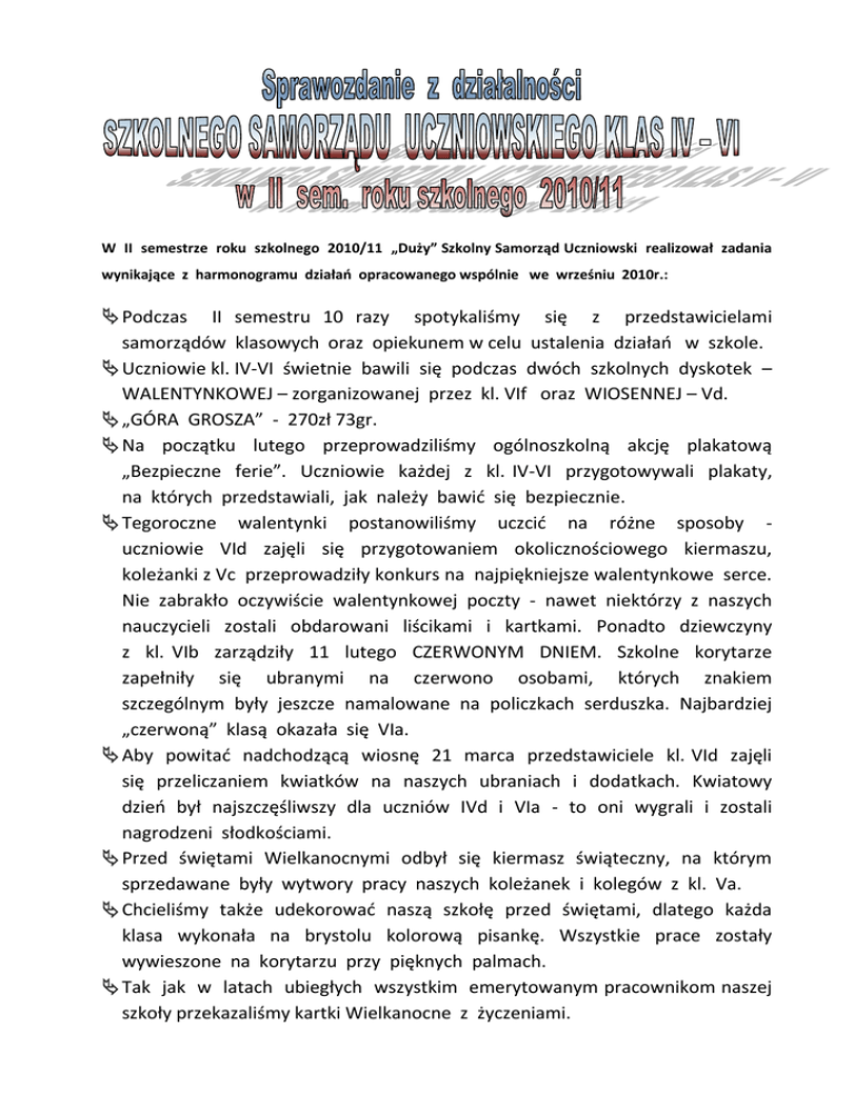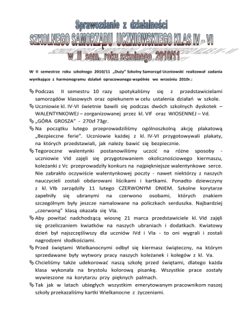 W II semestrze roku szkolnego 2010/11 „Duży” Szkolny Samorząd Uczniowski realizował zadania wynikające z harmonogramu działao opracowanego wspólnie we wrześniu 2010r.: Podczas II semestru 10 razy spotykaliśmy się z przedstawicielami samorządów klasowych oraz opiekunem w celu ustalenia działao w szkole. Uczniowie kl. IV-VI świetnie bawili się podczas dwóch szkolnych dyskotek – WALENTYNKOWEJ – zorganizowanej przez kl. VIf oraz WIOSENNEJ – Vd. „GÓRA GROSZA” - 270zł 73gr. Na początku lutego przeprowadziliśmy ogólnoszkolną akcję plakatową „Bezpieczne ferie”. Uczniowie każdej z kl. IV-VI przygotowywali plakaty, na których przedstawiali, jak należy bawid się bezpiecznie. Tegoroczne walentynki postanowiliśmy uczcid na różne sposoby uczniowie VId zajęli się przygotowaniem okolicznościowego kiermaszu, koleżanki z Vc przeprowadziły konkurs na najpiękniejsze walentynkowe serce. Nie zabrakło oczywiście walentynkowej poczty - nawet niektórzy z naszych nauczycieli zostali obdarowani liścikami i kartkami. Ponadto dziewczyny z kl. VIb zarządziły 11 lutego CZERWONYM DNIEM. Szkolne korytarze zapełniły się ubranymi na czerwono osobami, których znakiem szczególnym były jeszcze namalowane na policzkach serduszka. Najbardziej „czerwoną” klasą okazała się VIa. Aby powitad nadchodzącą wiosnę 21 marca przedstawiciele kl. VId zajęli się przeliczaniem kwiatków na naszych ubraniach i dodatkach. Kwiatowy dzieo był najszczęśliwszy dla uczniów IVd i VIa - to oni wygrali i zostali nagrodzeni słodkościami. Przed świętami Wielkanocnymi odbył się kiermasz świąteczny, na którym sprzedawane były wytwory pracy naszych koleżanek i kolegów z kl. Va. Chcieliśmy także udekorowad naszą szkołę przed świętami, dlatego każda klasa wykonała na brystolu kolorową pisankę. Wszystkie prace zostały wywieszone na korytarzu przy pięknych palmach. Tak jak w latach ubiegłych wszystkim emerytowanym pracownikom naszej szkoły przekazaliśmy kartki Wielkanocne z życzeniami. 29 kwietnia 2011r. członkowie Ligii Ochrony Przyrody przeczytali w lokalnej gazecie artykuł pt. „Imprezowali obok oskalpowanego psa”. Opisana została w nim historia psa Farta, który był bardzo źle traktowany przez swoich właścicieli. Został zabrany do weterynarza i poddany amputacji lewej łapki. Był to bardzo kosztowny zabieg. Wraz z członkami Ligii Ochrony Przyrody postanowiliśmy jakoś pomóc. Aby zebrad jak najwięcej pieniędzy 18 maja urządziliśmy kiermasz ciast i ciasteczek. Przedsięwzięcie się udało, zebraliśmy 365zł, które wpłaciliśmy na konto Towarzystwa Opieki nad Zwierzętami w Polsce. Artykuł o naszej akcji został zamieszczony na stronie internetowej www.sroda.express-miejski.pl. Akcja rozpowszechniona w mediach „Mogiłę pradziada ocal od zapomnienia” również w tym roku szkolnym odbiła się u nas echem – w maju zbieraliśmy „złotówki” na groby na Wschodzie - w sumie 100 zł. To już drugi raz w tym roku szkolnym. Od maja prowadzaliśmy akcję zbiórki makulatury. Dnia 16 czerwca (czwartek) zostały przeprowadzone w naszej szkole demokratyczne wybory do nowego Szkolnego Samorządu Uczniowskiego na rok szkolny 2011/2012. Od 3 czerwca trwała kampania – zgłosiło się 20 kandydatów z klas czwartych i piątych. W głosowaniu wzięło udział 315 osób ( uczniowie i nauczyciele ). Każdy z nich otrzymał kartę do głosowania z nazwiskami wszystkich kandydatów i zaznaczał X przy wybranej przez siebie osobie. Tylko 3 głosy były nieważne. Wyniki przedstawiają się następująco: przewodnicząca - Magdalena Kmiecik - Vb zarząd: Konstancja Owczarenko - IVc Anna Pastuch - IVd Karolina Bakalarz - Vc Daria Bachowska - Vd Kornel Drączkowski - Vb Członkowie - pomocnicy: Sebastian Szabelski - IVb Szymon Woźniak - IVb Kamila Rosenbeiger - IVd Julia Kozak - Va Aleksandra Mykicka - Vb Po raz trzeci zorganizowaliśmy szkolny konkurs „MAM TALENT” - uczestnicy zaprezentowali się w trzech kategoriach – taniec, śpiew oraz sport bawiliśmy się wspaniale 15 czerwca; zwycięzcy zostali nagrodzeni dyplomami oraz upominkami. Do połowy maja zbieraliśmy plastikowe nakrętki, aby pomóc małemu Mateuszkowi. Wraz z innymi ludźmi dobrej woli udało się zebrad 6 ton. Pieniądze z ich sprzedaży posłużyły do zakupu pionizatora dla chłopca. Od rodziców Mateusza otrzymaliśmy piękne podziękowanie. Nasi koledzy i koleżanki wciąż jednak przynosili nakrętki. Zostały one od nas odebrane 17 czerwca i przekazane dla innych potrzebujących dzieci, będących w fundacji „Zdążyd z pomocą”. 17 i 20 czerwca można było sprzedad, kupid lub wymienid książki na kiermaszu używanych podręczników - zorganizowała go pani pedagog. Działający przy Samorządzie Szkolnym Poczet Sztandarowy, pod czujnym okiem pani Natalii Aleksy, reprezentował naszą szkołę w środowisku szkolnym oraz lokalnym. Przez cały drugi semestr trwała loteria bezjedynkowa „Szczęśliwy Numerek”, nad którą pieczę sprawowała przewodnicząca Ola Cirko z VIf. Przedstawiciele Szkolnego Samorządu Uczniowskiego współprowadzili apel na zakooczenie roku szkolnego, na którym przekazali władzę nowemu Szkolnemu Samorządowi Uczniowskiemu oraz zaprezentowali nowy skład Pocztu Sztandarowego. Chcielibyśmy bardzo nauczycielom i innym i wspierali w pracach. podziękować wszystkim pracownikom szkoły, którzy wychowawcom, pomagali nam Pani Dyrektor Alinie Kargol dziękujemy za wsparcie i zrozumienie. Mamy nadzieję, że solidnie wywiązywaliśmy się z powierzanych nam obowiązków. Pani Beacie Jastrzębskiej dziękujemy za umieszczanie wiadomości o naszych przedsięwzięciach i zdjęć na stronie internetowej szkoły. „Małemu” Samorządowi Szkolnemu i opiekunom za współpracę w organizowaniu wszystkich szkolnych akcji. dziękujemy Liczymy na dalszą współpracę !!!!! „Duży” Szkolny Samorząd Uczniowski oraz opiekun Magdal