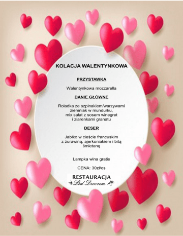 KOLACJA WALENTYNKOWA PRZYSTAWKA Walentynkowa mozzarella DANIE GŁÓWNE Roladka ze szpinakiem/warzywami ziemniak w mundurku, mix sałat z sosem winegret i ziarenkami granatu DESER Jabłko w cieście francuskim z żurawiną, ajerkoniakiem i bitą śmietaną Lampka wina gratis CENA: 30zł/os