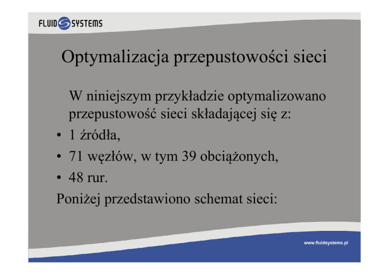 Optymalizacja przepustowości sieci W niniejszym przykładzie optymalizowano przepustowość sieci składającej się z: • 1 źródła, • 71 węzłów, w tym 39 obciążonych, • 48 rur. Poniżej przedstawiono schemat sieci: Struktura sieci Parametry startowe obiektów • Źródło – ciśnienie wyjściowe wynoszące 120 kPa • Rury: – – – – – – – – – do węzła 19 – śr. wewnętrzna 103,09 mm, prędkość gazu 6,51 m/s do węzła 20 – śr. wewnętrzna 130,69 mm, prędkość gazu 5,06 m/s do węzła 21 – śr. wewnętrzna 130,69 mm, prędkość gazu 3,02 m/s do węzła 46 – śr. wewnętrzna 106,30 mm, prędkość gazu 2,28 m/s do węzła 47 – śr. wewnętrzna 106,30 mm, prędkość gazu 2,29 m/s do węzła 48 – śr. wewnętrzna 106,30 mm, prędkość gazu 3,05 m/s do węzła 49 – śr. wewnętrzna 106,30 mm, prędkość gazu 1,53 m/s do węzła 50 – śr. wewnętrzna 106,30 mm, prędkość gazu 3,05 m/s do węzła 51 – śr. wewnętrzna 106,30 mm, prędkość gazu 1,52 m/s Parametry startowe obiektów (c.d.) Węzły: • węzeł 19 (pobór = 400 m3/h; ciśnienie = 112,621 kPa), • węzeł 20 (pobór = 500 m3/h; ciśnienie = 113,036 kPa) • węzeł 21 (pobór = 300 m3/h; ciśnienie = 114,473 kPa) • węzeł 46 (pobór = 150 m3/h; ciśnienie = 114,712 kPa) • węzeł 47 (pobór = 150 m3/h; ciśnienie = 113,917 kPa) • węzeł 48 (pobór = 200 m3/h; ciśnienie = 113,646 kPa) • węzeł 49 (pobór = 100 m3/h; ciśnienie = 113,657 kPa) • węzeł 50 (pobór = 200 m3/h; ciśnienie = 113,627 kPa) • węzeł 51 (pobór = 100 m3/h; ciśnienie = 114,823 kPa) Ograniczenia na parametry obiektów • Źródło: – Minimalna wydajność źródła: 1 m3/h – Maksymalna wydajność źródła: 70 000 m3/h • Rura: – Maksymalna prędkość w rurze: 20 m/s • Węzły: – Ciśnienie minimalne: 1 kPa – Ciśnienie maksymalne: 120 kPa Wyniki maksymalizacji poboru poszczególnych węzłów oraz grup węzłów - węzeł 19 węzeł 20 węzeł 21 węzeł 46 węzeł 47 węzeł 48 węzeł 49 węzeł 50 węzeł 51 Pobór Ciśnienie Pobór Ciśnienie Pobór Ciśnienie Pobór Ciśnienie Pobór Ciśnienie Pobór Ciśnienie Pobór Ciśnienie Pobór Ciśnienie Pobór Ciśnienie [m3/h] [kPa] [m3/h] [kPa] [m3/h] [kPa] [m3/h] [kPa] [m3/h] [kPa] [m3/h] [kPa] [m3/h] [kPa] [m3/h] [kPa] [m3/h] [kPa] 400 112,621 500 113,036 300 114,473 150 114,712 150 113,917 200 113,646 100 113,657 200 113,627 100 114,823 Opt. w. 19 1275 97,370 500 106,491 300 109,572 150 110,561 150 109,284 200 108,754 100 108,615 200 108,545 100 110,704 Opt. w. 20 400 101,495 1852 95,267 300 107,087 150 107,905 150 105,864 200 104,883 100 104,360 200 104,108 100 108,092 Opt. w. 21 400 101,146 500 102,954 1881 96,570 150 105,923 150 105,136 200 104,874 100 104,894 200 104,868 100 106,036 Opt. w. 46 400 106,739 500 107,177 300 108,562 1294 103,127 150 106,460 200 106,455 100 106,802 200 107,262 100 107,841 Opt. w. 47 400 106,333 500 106,603 300 108,825 150 107,787 1275 100,413 200 102,991 100 104,326 200 105,780 100 108,567 Opt. w. 48 400 106,607 500 106,803 300 109,289 150 108,629 150 104,665 1256 100,897 100 104,052 200 105,771 100 109,212 Opt. w. 49 400 105,476 500 105,481 300 108,605 150 108,143 150 104,498 200 102,484 1284 99,509 200 103,684 100 108,631 Opt. w. 50 400 106,111 500 106,033 300 109,396 150 109,332 150 106,765 200 105,453 100 104,598 1261 102,219 100 109,626 Opt. w. 51 400 106,371 500 106,812 300 108,168 150 107,277 150 106,936 200 106,873 100 106,975 200 107,130 1306 102,134 Opt. w. 19÷21 770 93,940 1852 90,936 299 104,098 150 105,453 150 103,153 200 102,016 100 101,345 200 101,012 100 105,655 Opt. w. 46÷51 400 103,198 500 102,805 300 107,105 149 106,826 149 103,200 199 101,196 486 99,388 1261 97,551 99 107,243 Opt w. 19÷51 399 97,912 1467 93,159 299 104,059 149 104,441 149 101,021 199 99,158 99 97,715 1116 95,337 99 104,746 Ograniczenia brak 1÷120 brak 1÷120 brak 1÷120 brak 1÷120 brak 1÷120 brak 1÷120 brak 1÷120 brak 1÷120 brak 1÷120 Przykład podstawowy